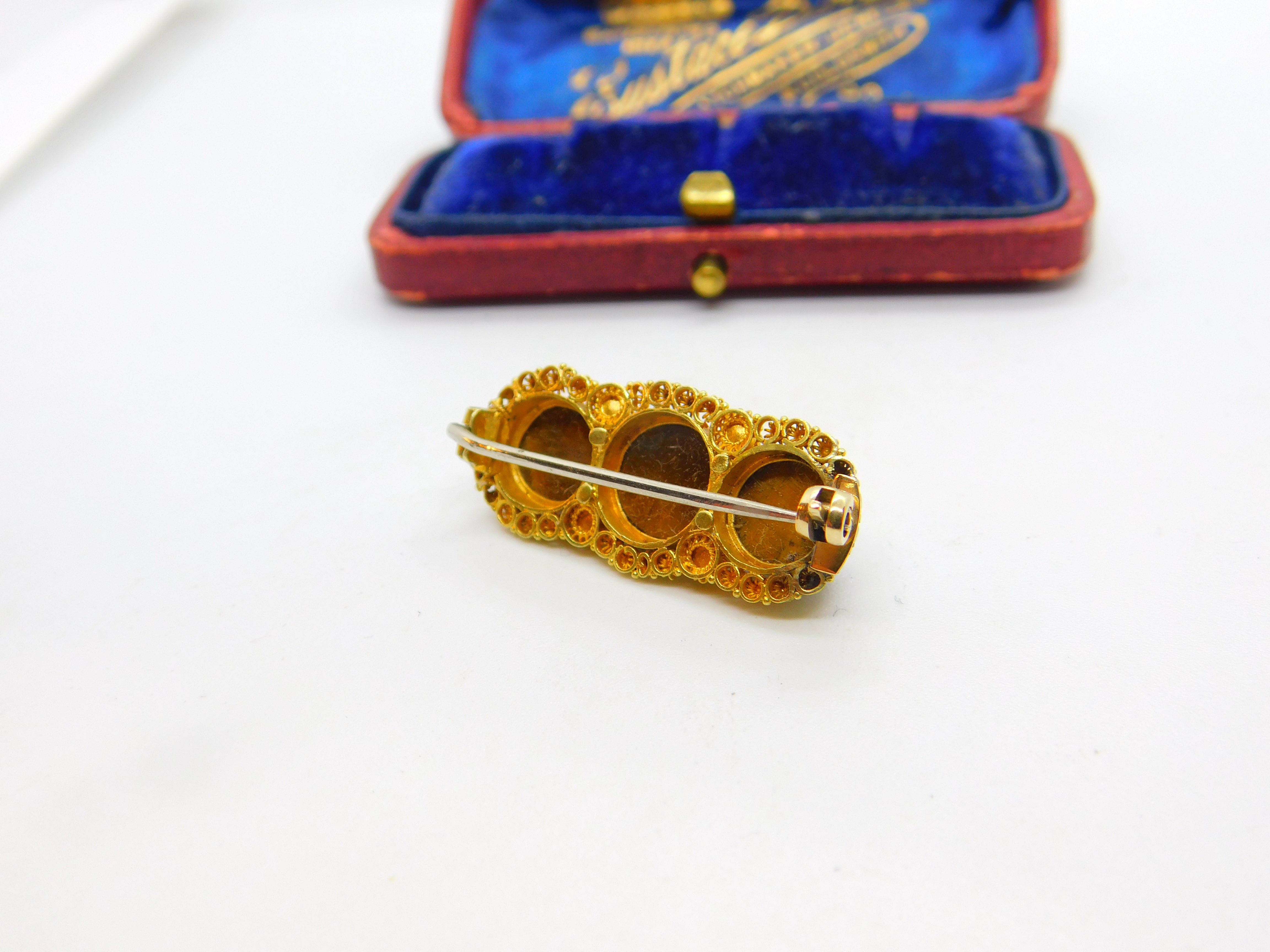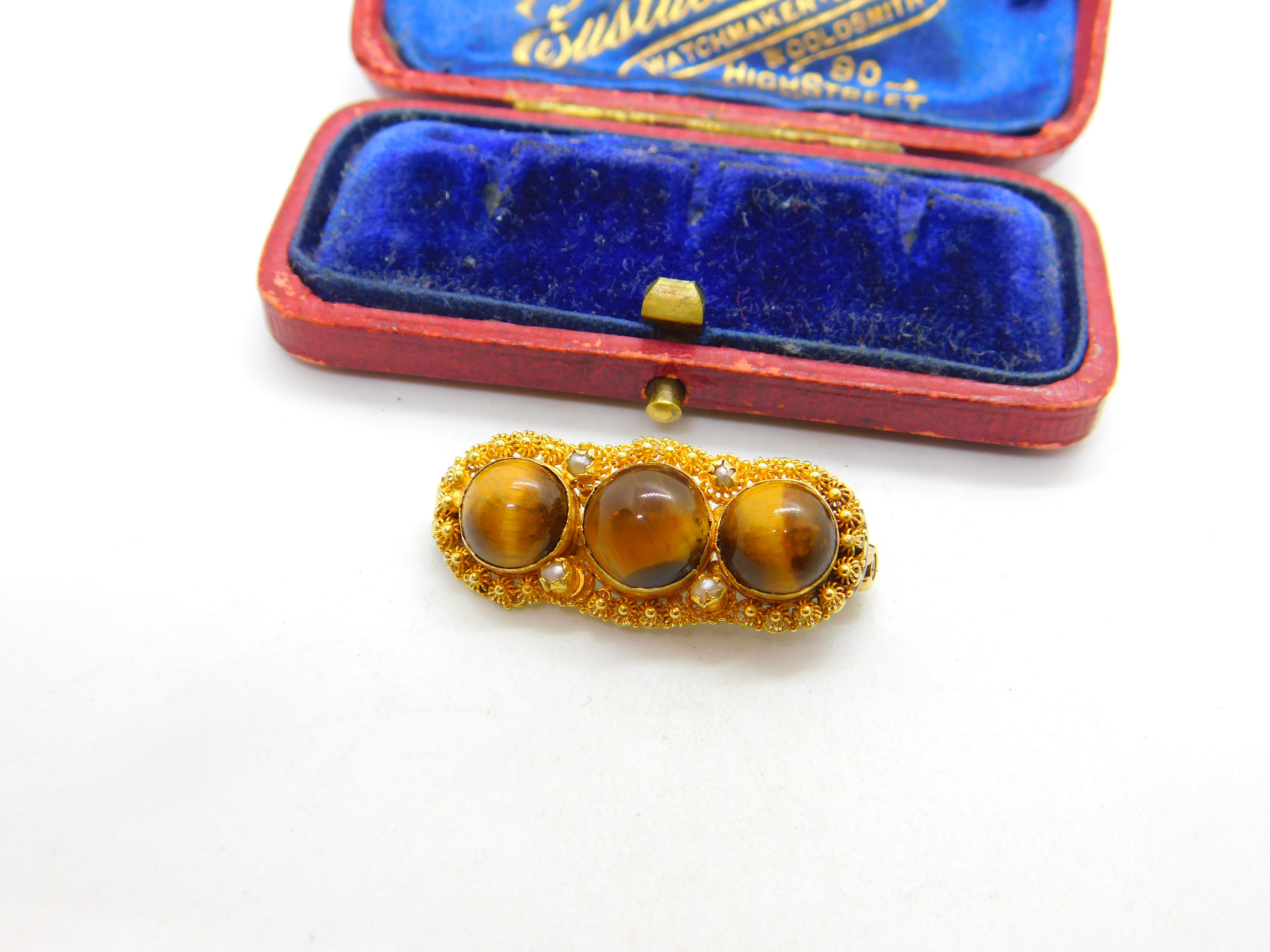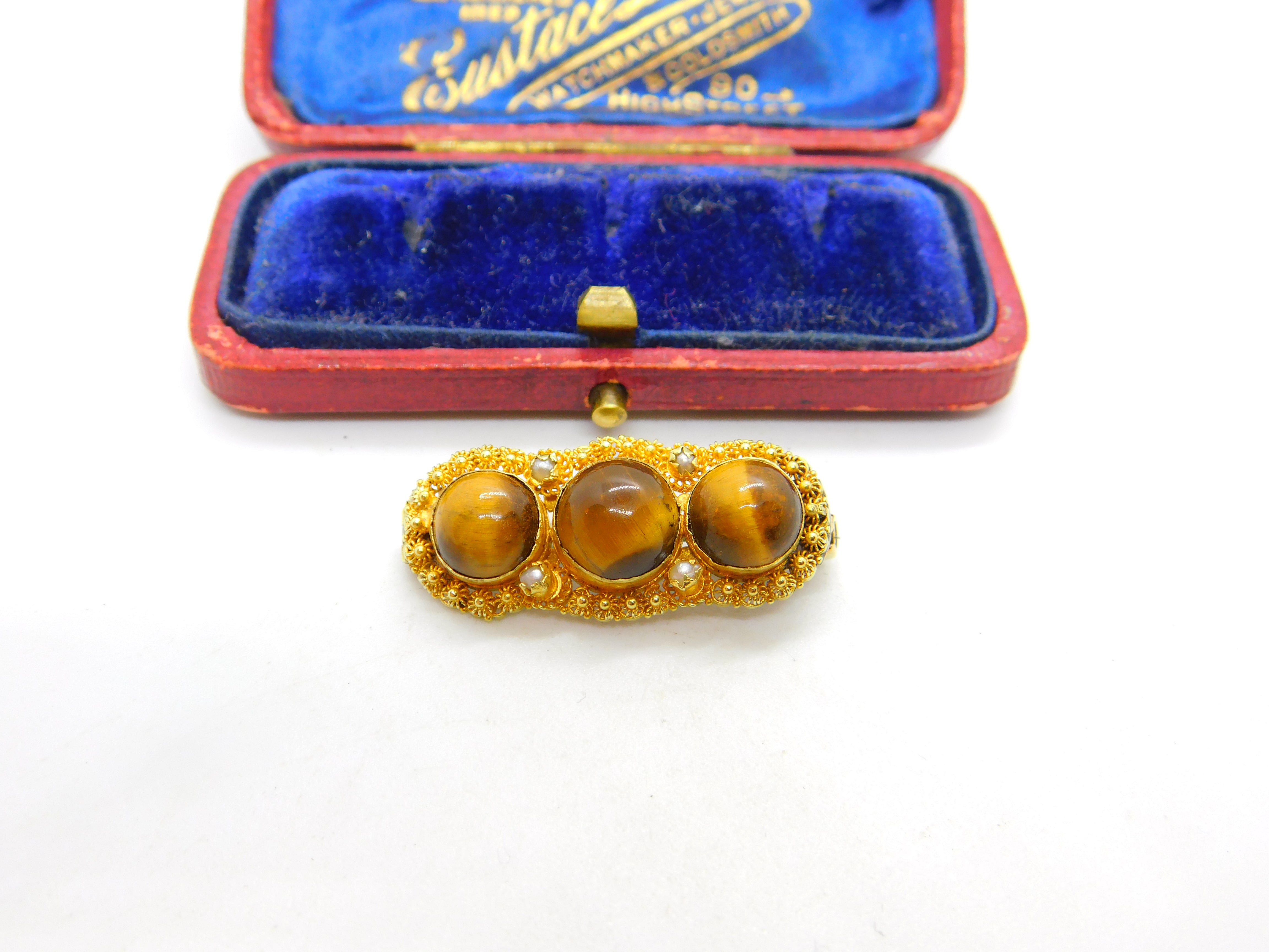 Victorian 22ct Gold Cannetille Tiger's Eye & Seed Pearl Sweetheart Brooch c1840