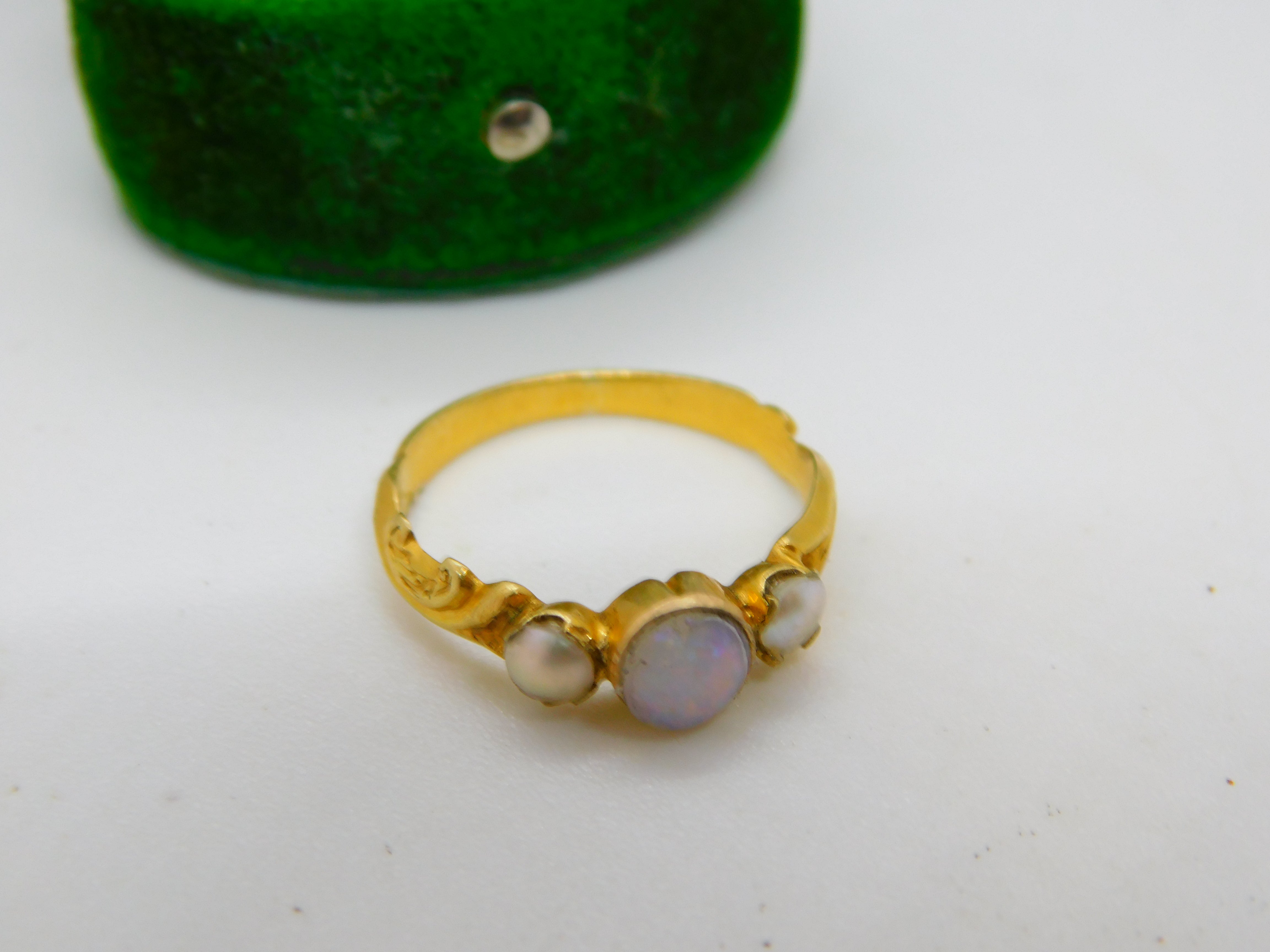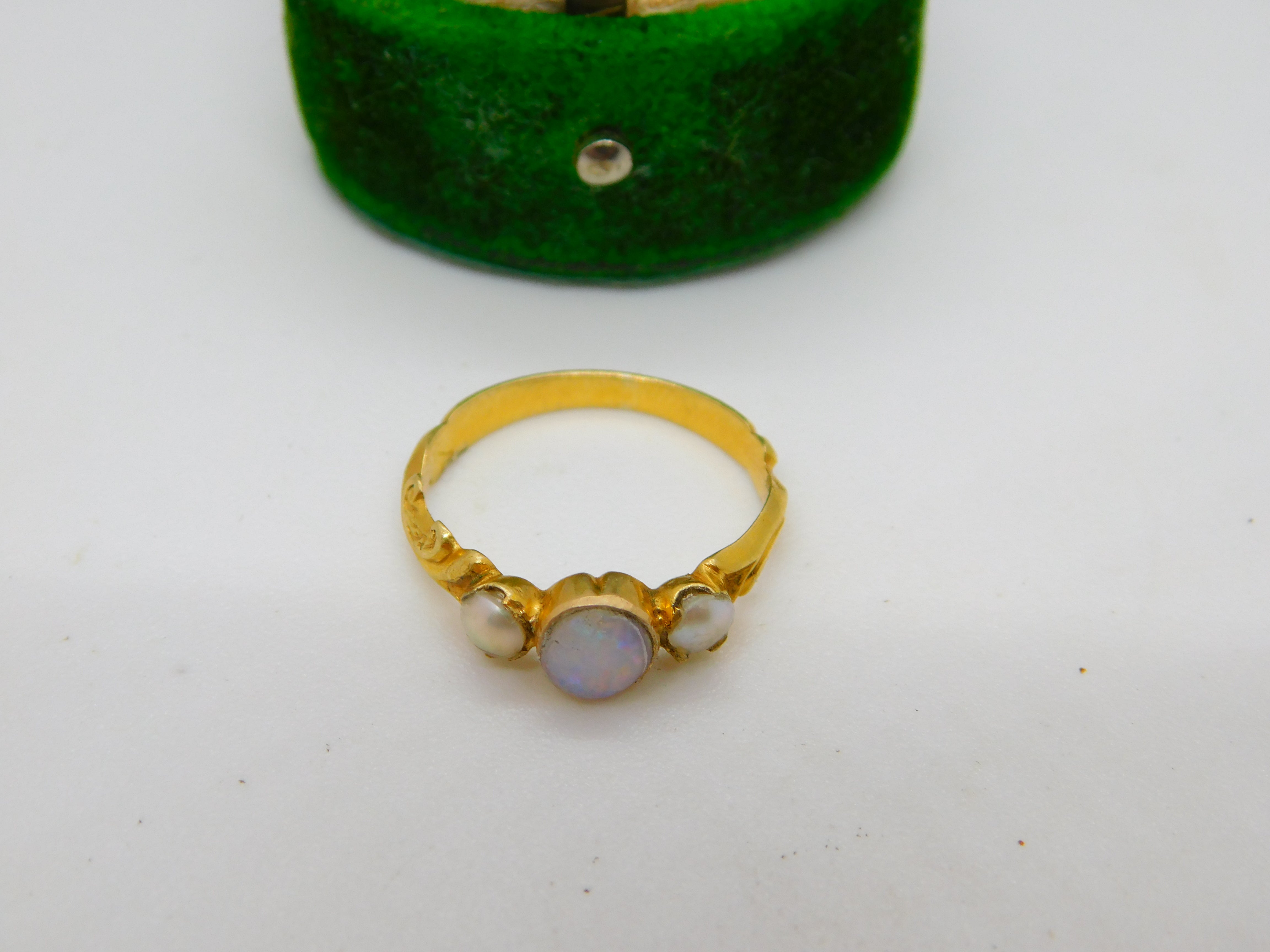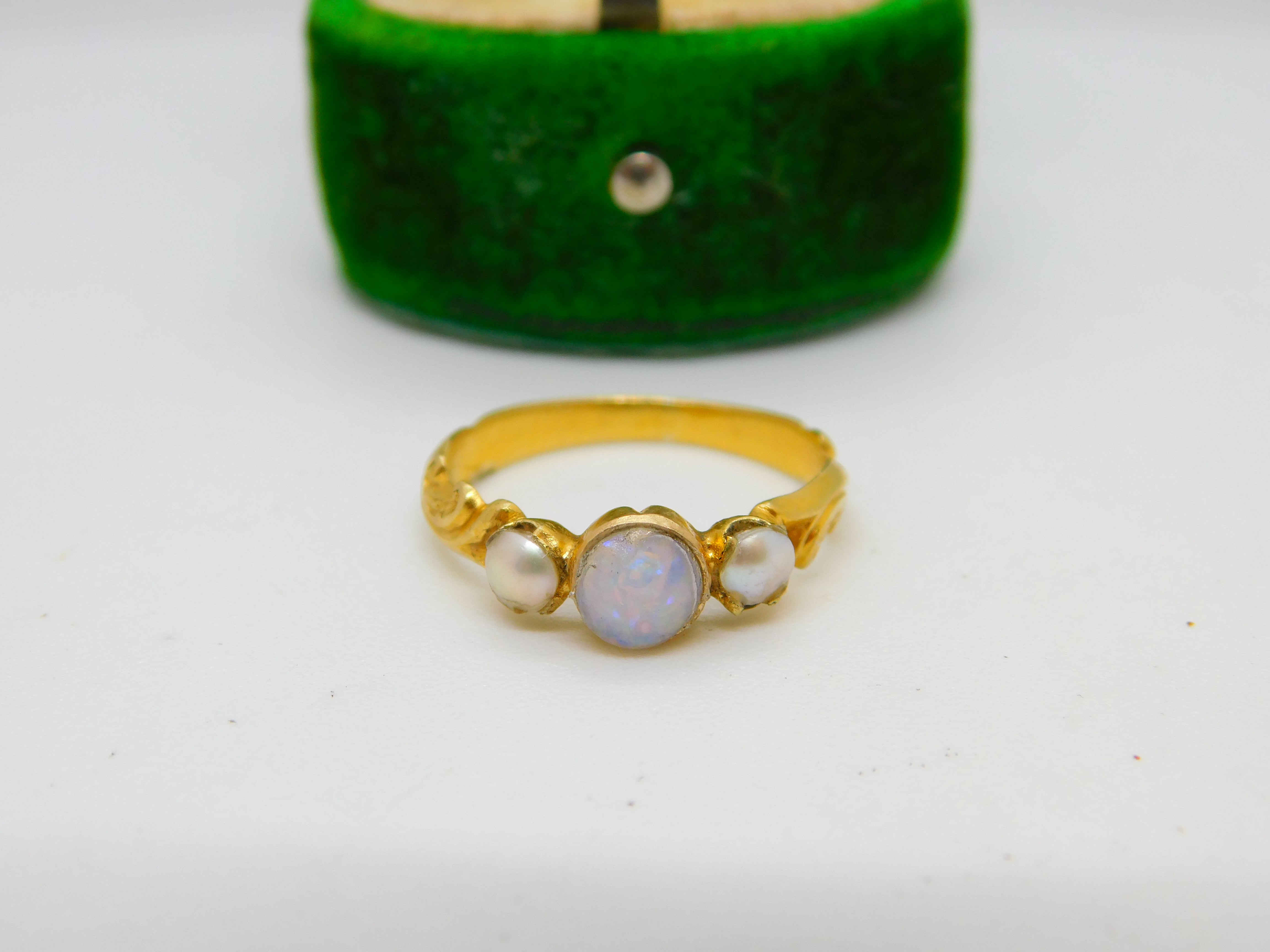 Details: A fantastic and wonderfully designed antique early Victorian 22ct yellow gold floral dress ring set with central opal flanked by two seed pearls c1840. The central opal has been rather crudely reset but still nice nonetheless. The gold has been XRF tested. This is a wonderful item that would make a perfect gift or addition to any collection. The BOX pictured is for PRESENTATION ONLY and is NOT included in the listings but used to frame the pictures unless specifically stated otherwise.