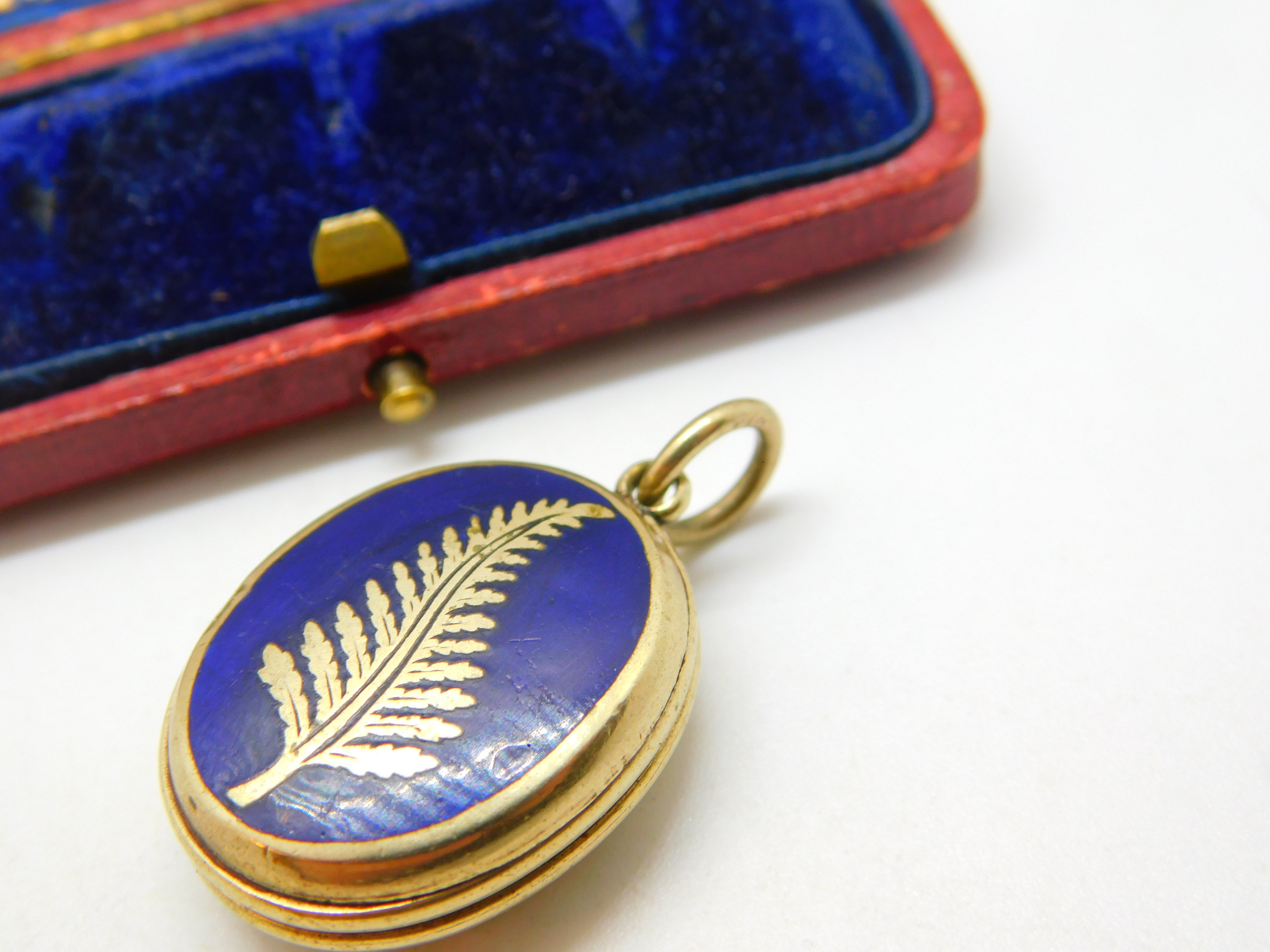 Details: A fantastic and wonderfully designed antique Victorian 9ct gold back and front double locket with charming blue enamel fern leaf to the front and good luck clover to the inside c1890 - the gold has been XRF tested. This is a wonderful item that would make a perfect gift or addition to any collection. The BOX pictured is for PRESENTATION ONLY and is NOT included in the listings but used to frame the pictures unless specifically stated otherwise.