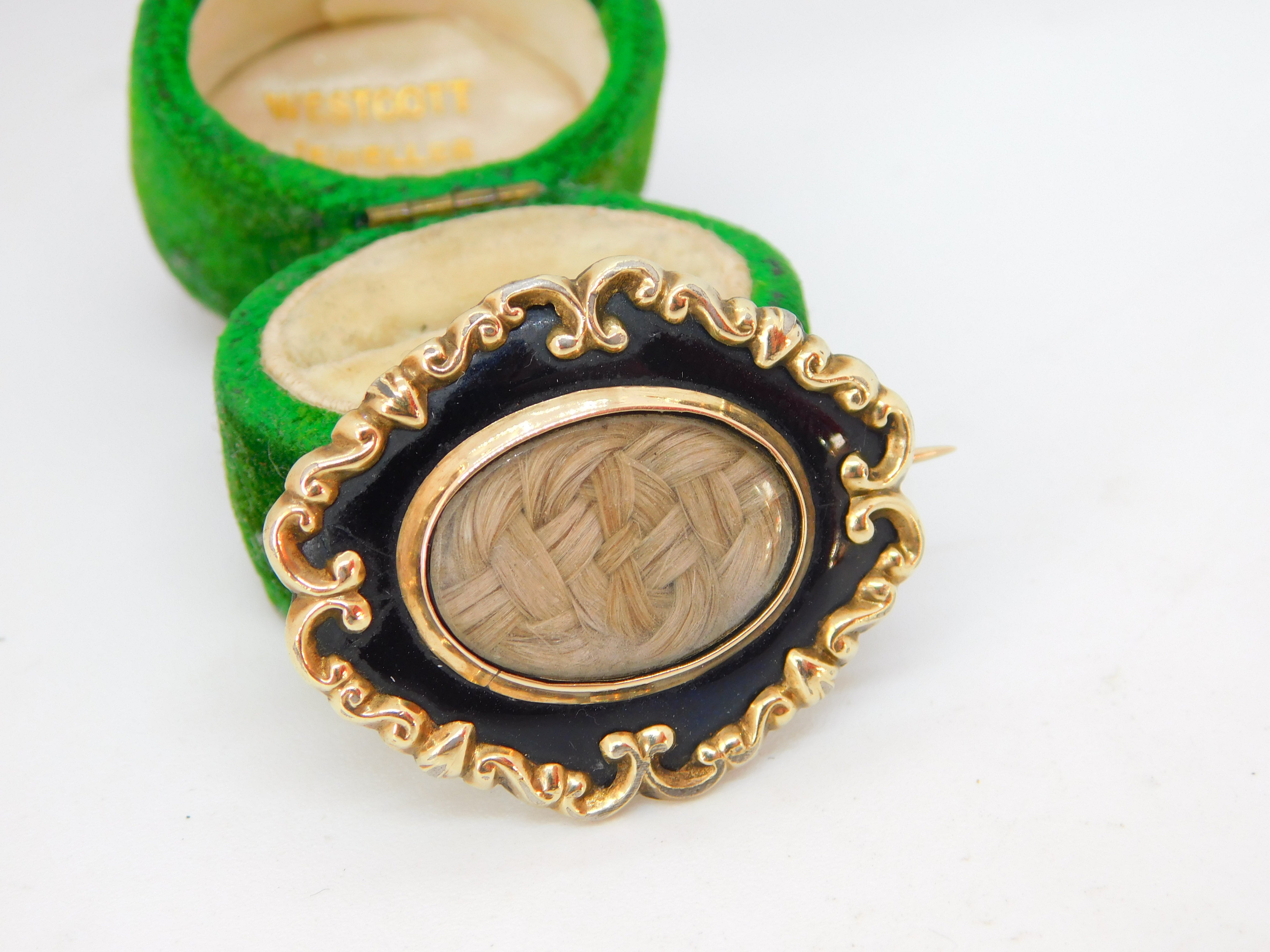 Victorian 9ct Gold, Black Enamel & Hair Mourning Brooch Antique 1852