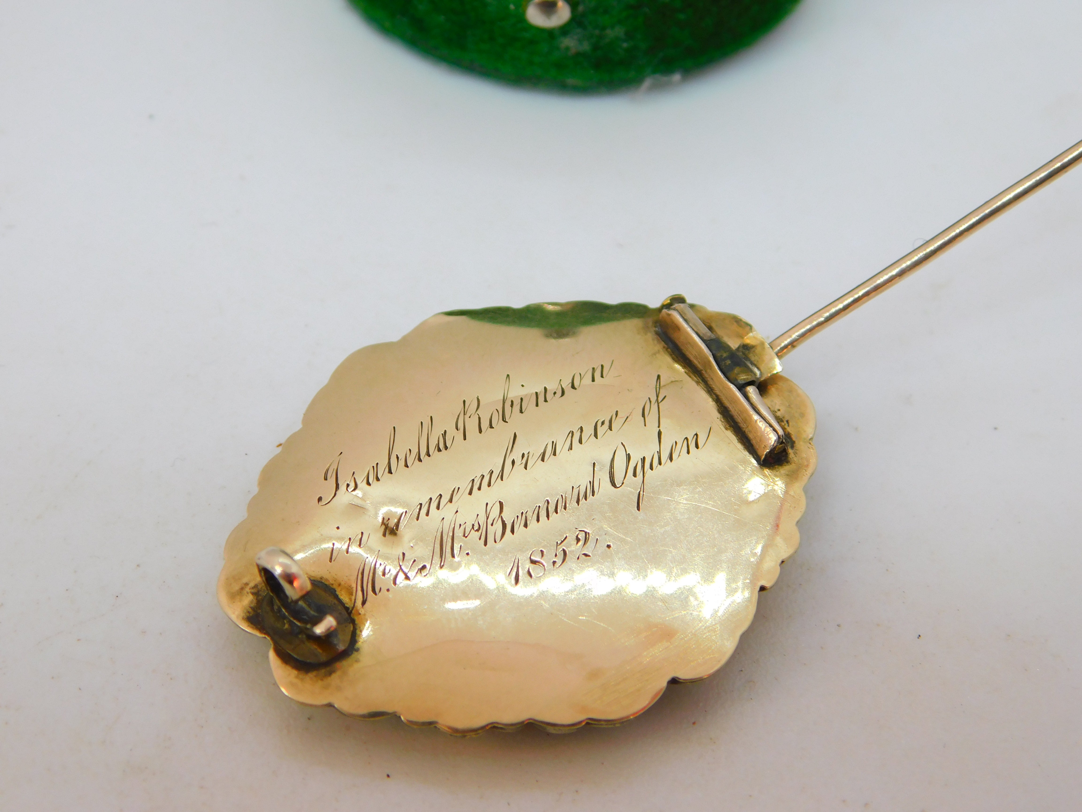 Details: A fantastic and wonderfully designed antique Victorian 9ct yellow gold & black enamel mourning remembrance brooch set with hair to the centre engraved 'Isabella Robinson in remembrance of Mr & Mrs Bernard Ogden, 1852', the gold has been XRF tested as it is unmarked. This is a wonderful item that would make a perfect gift or addition to any collection. The BOX pictured is for PRESENTATION ONLY and is NOT included in the listings but used to frame the pictures unless specifically stated otherwise.