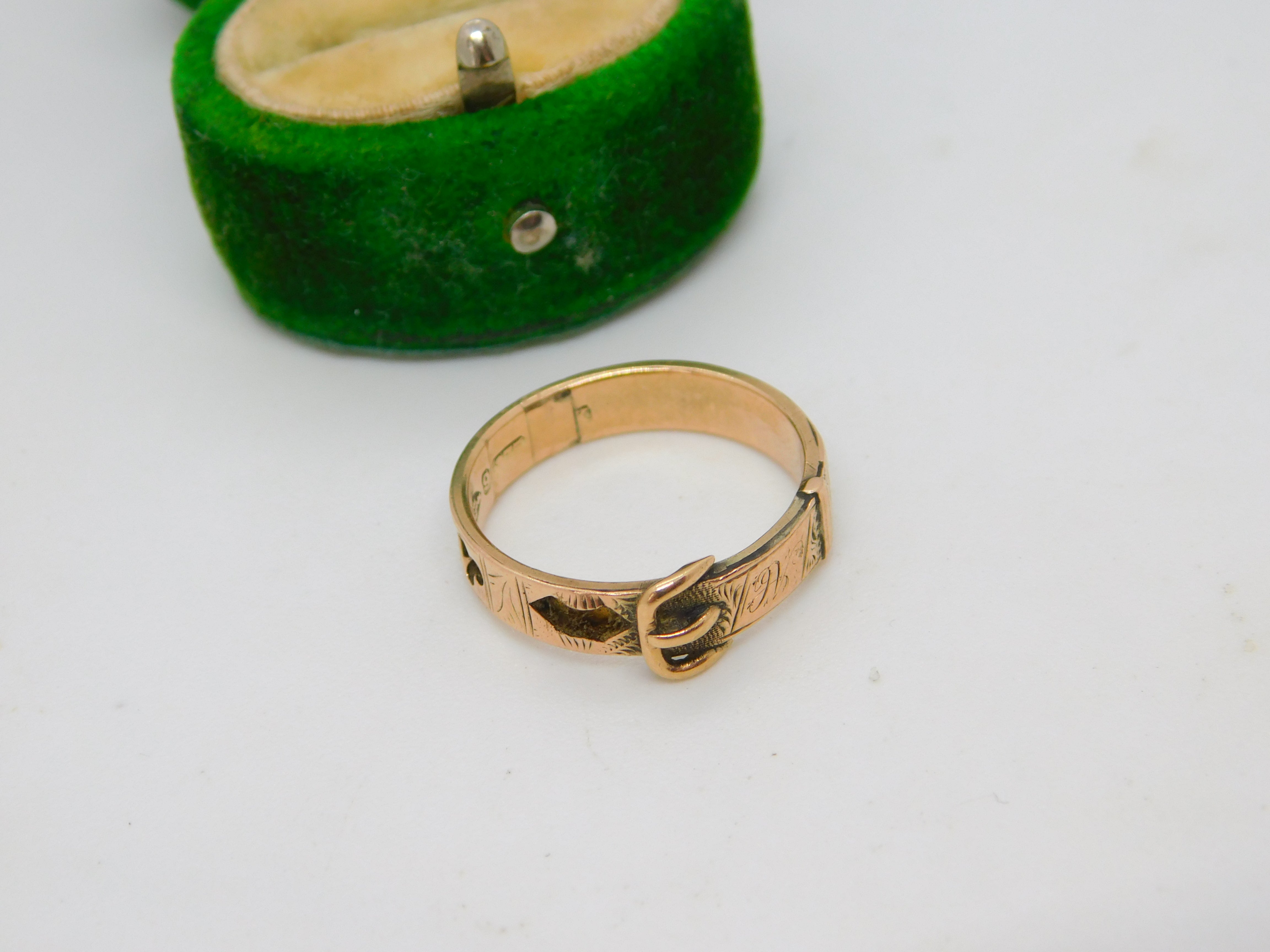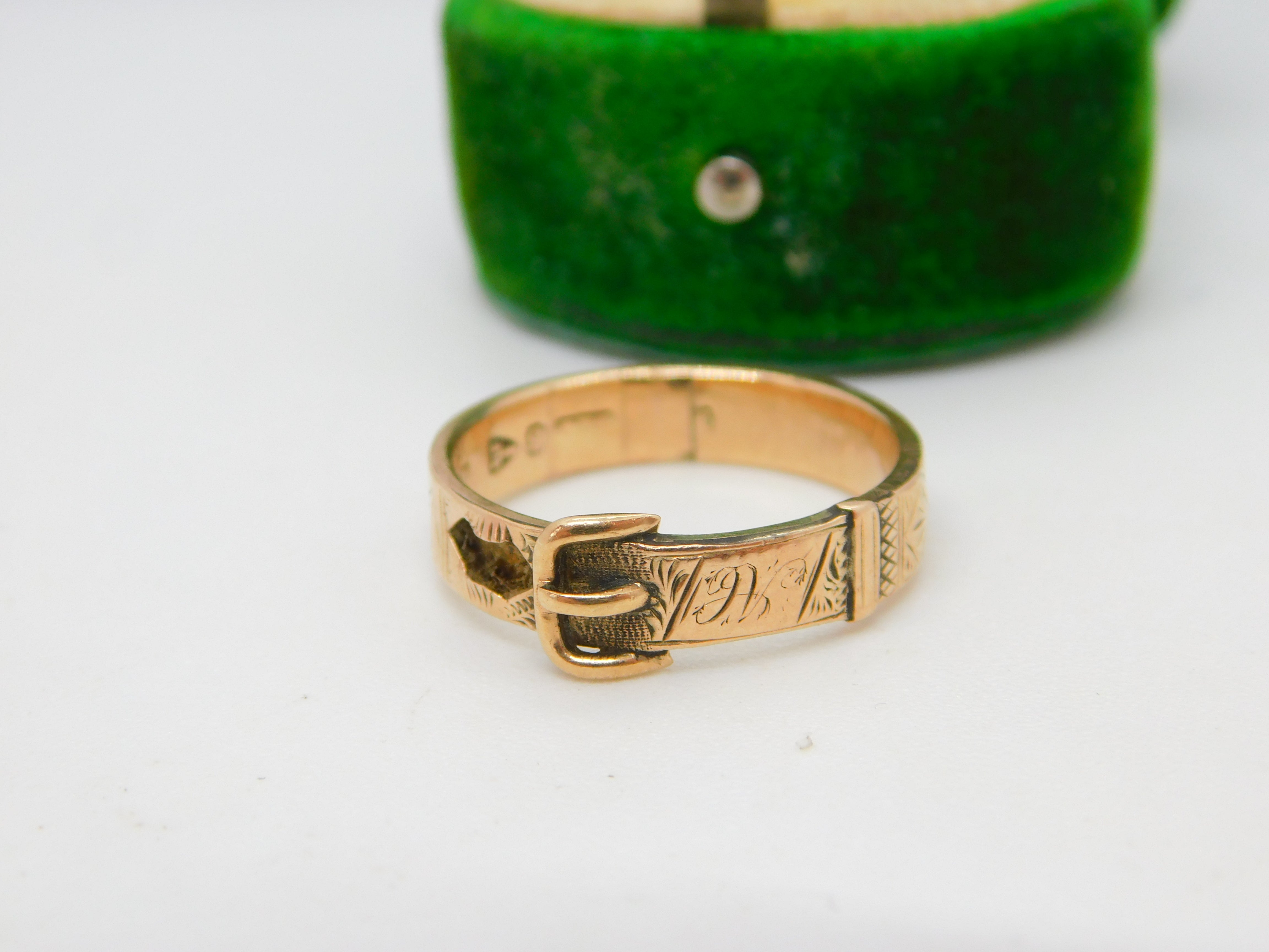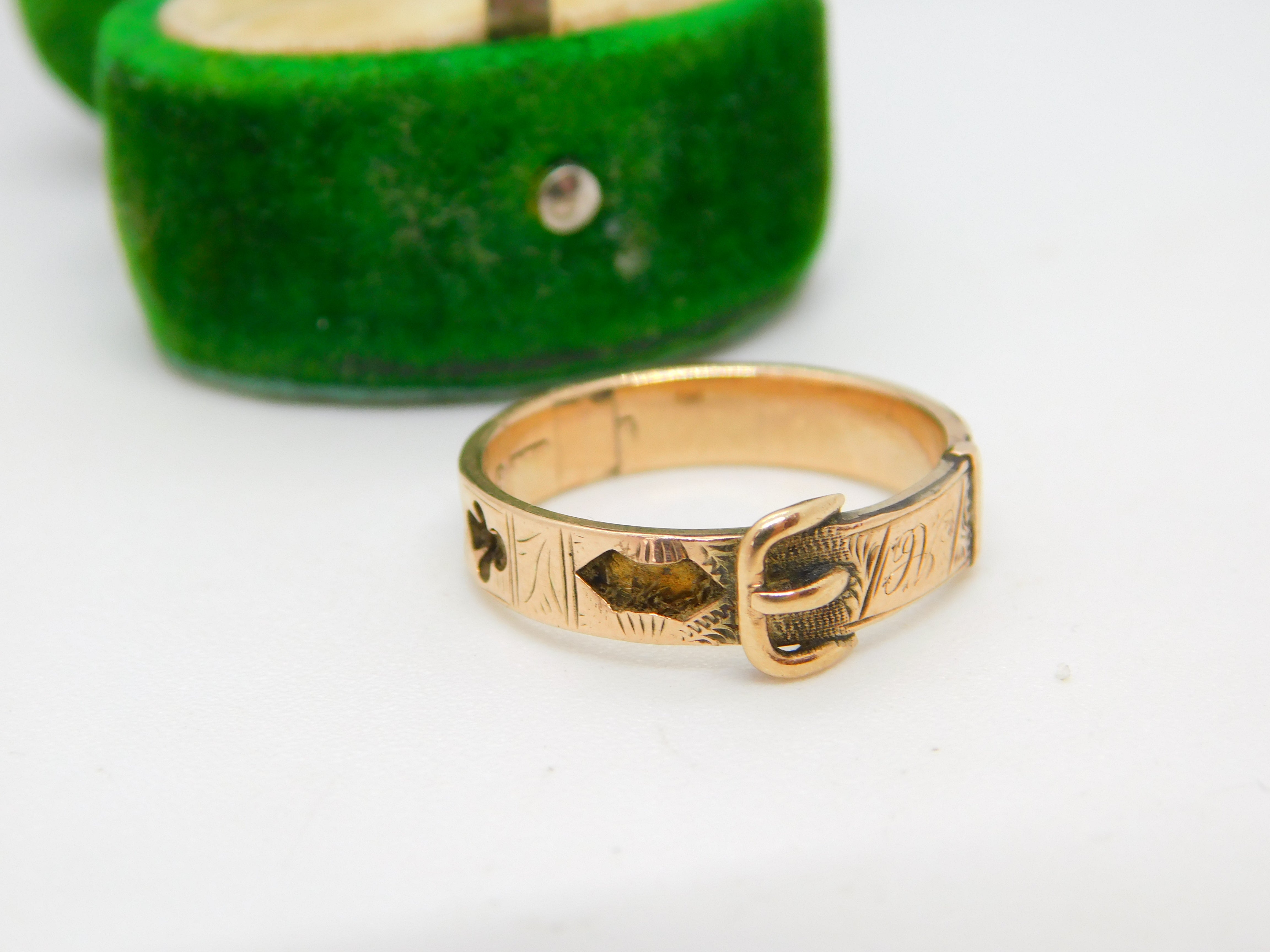 Details: A fantastic and wonderfully designed antique Victorian 9ct gold buckle form mourning ring with charming detailing throughout hallmarked to the interior, Chester c1880. The ring would once have had hair throughout the band although this is missing, the band has been repaired please note. This is a wonderful item that would make a perfect gift or addition to any collection. The BOX pictured is for PRESENTATION ONLY and is NOT included in the listings but used to frame the pictures unless specifically stated otherwise.
