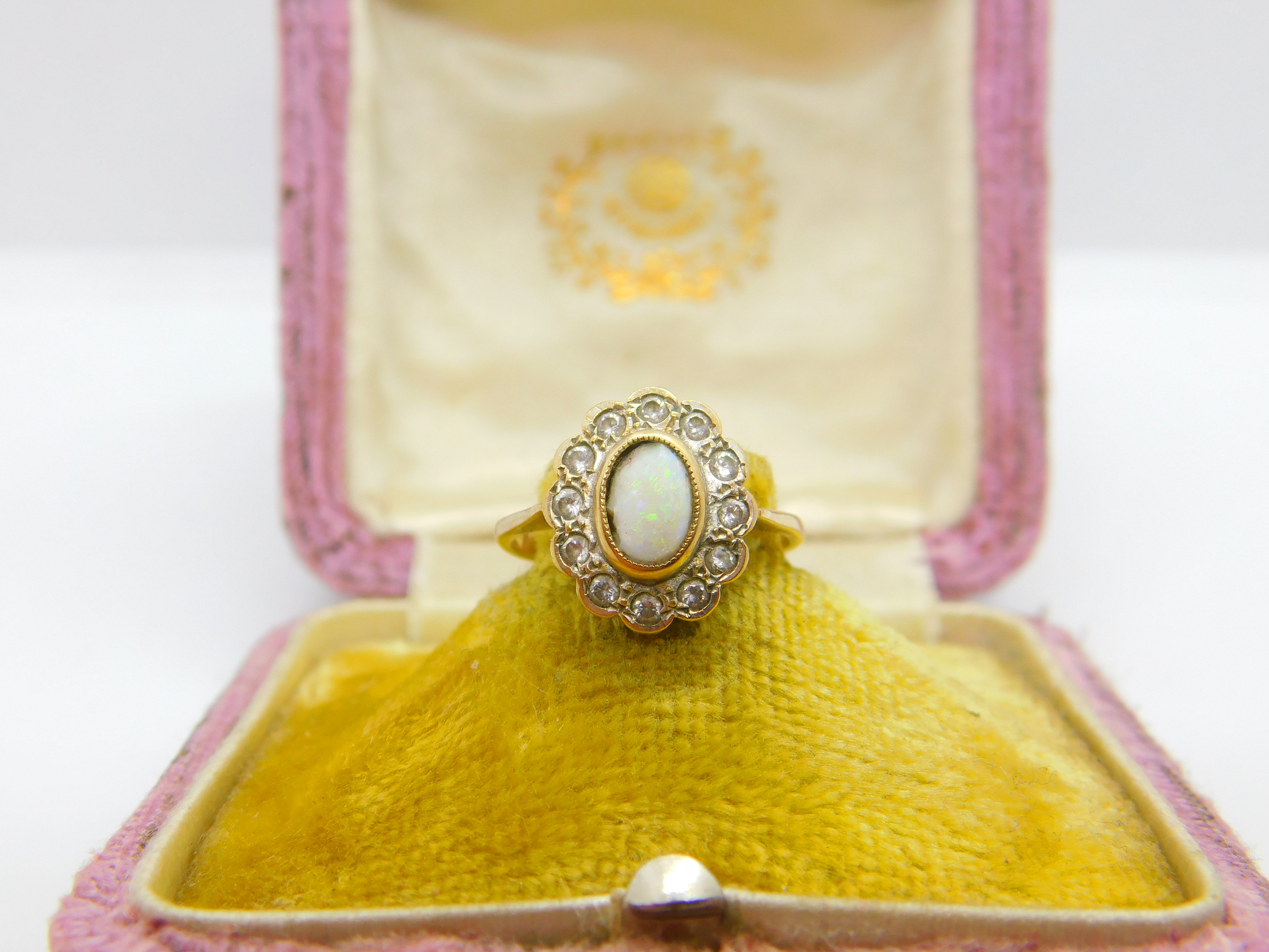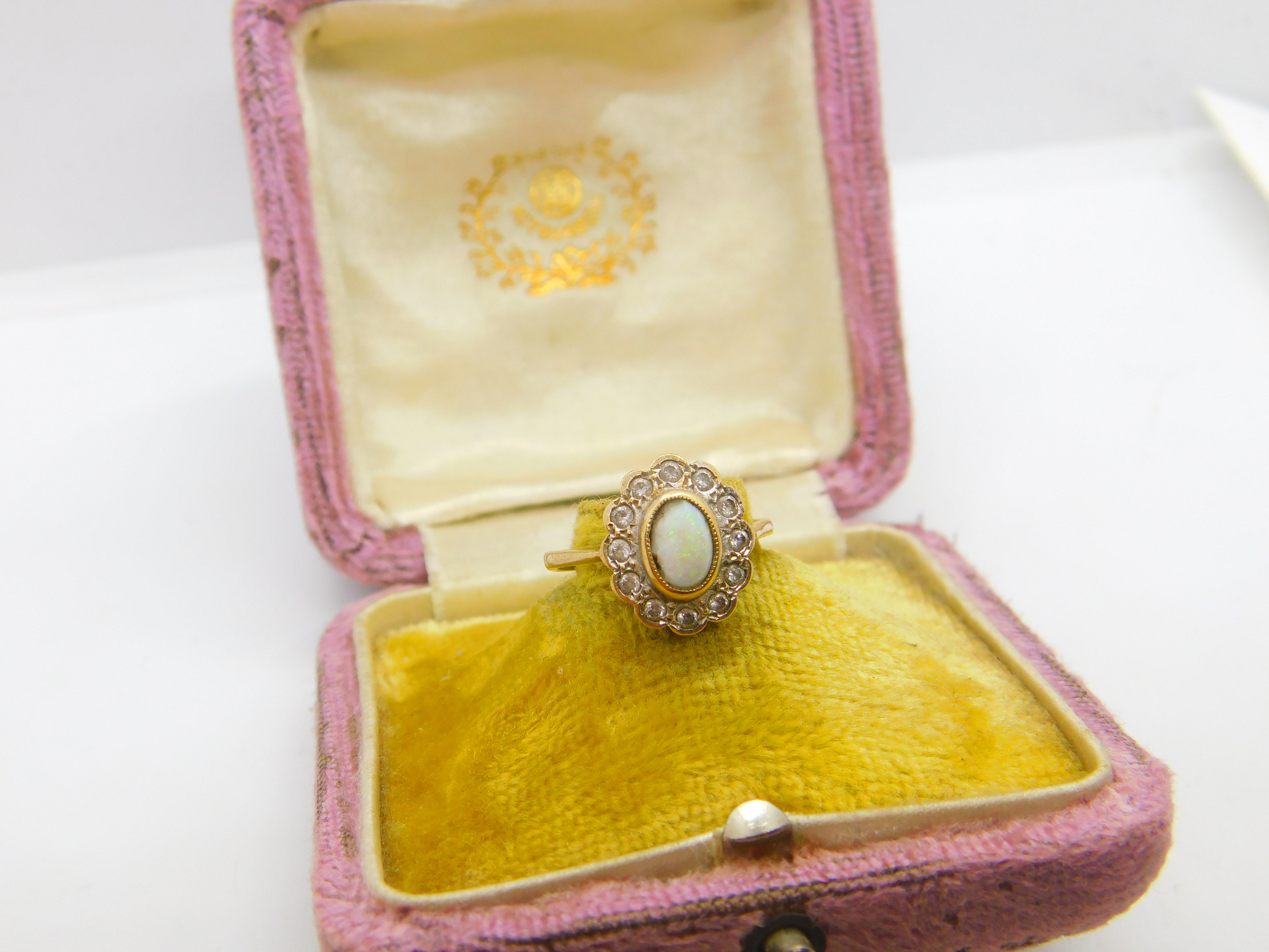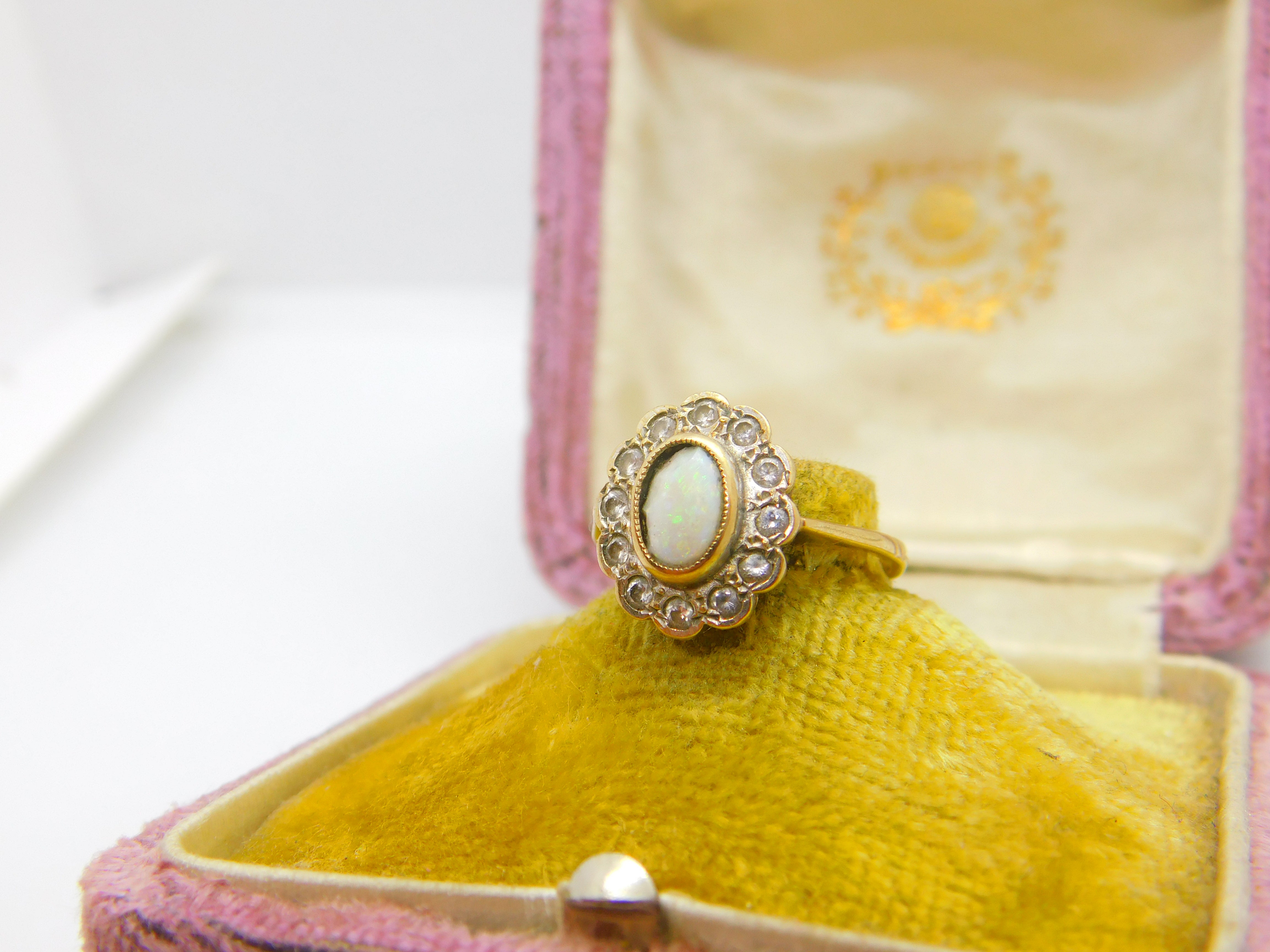 Details: A fantastic and wonderfully designed antique Victorian 9ct yellow gold floral cluster ring set with central cabochon cut opal and white spinels c1880, the gold has been XRF tested. This is a wonderful item that would make a perfect gift or addition to any collection. The BOX pictured is for PRESENTATION ONLY and is NOT included in the listings but used to frame the pictures unless specifically stated otherwise.