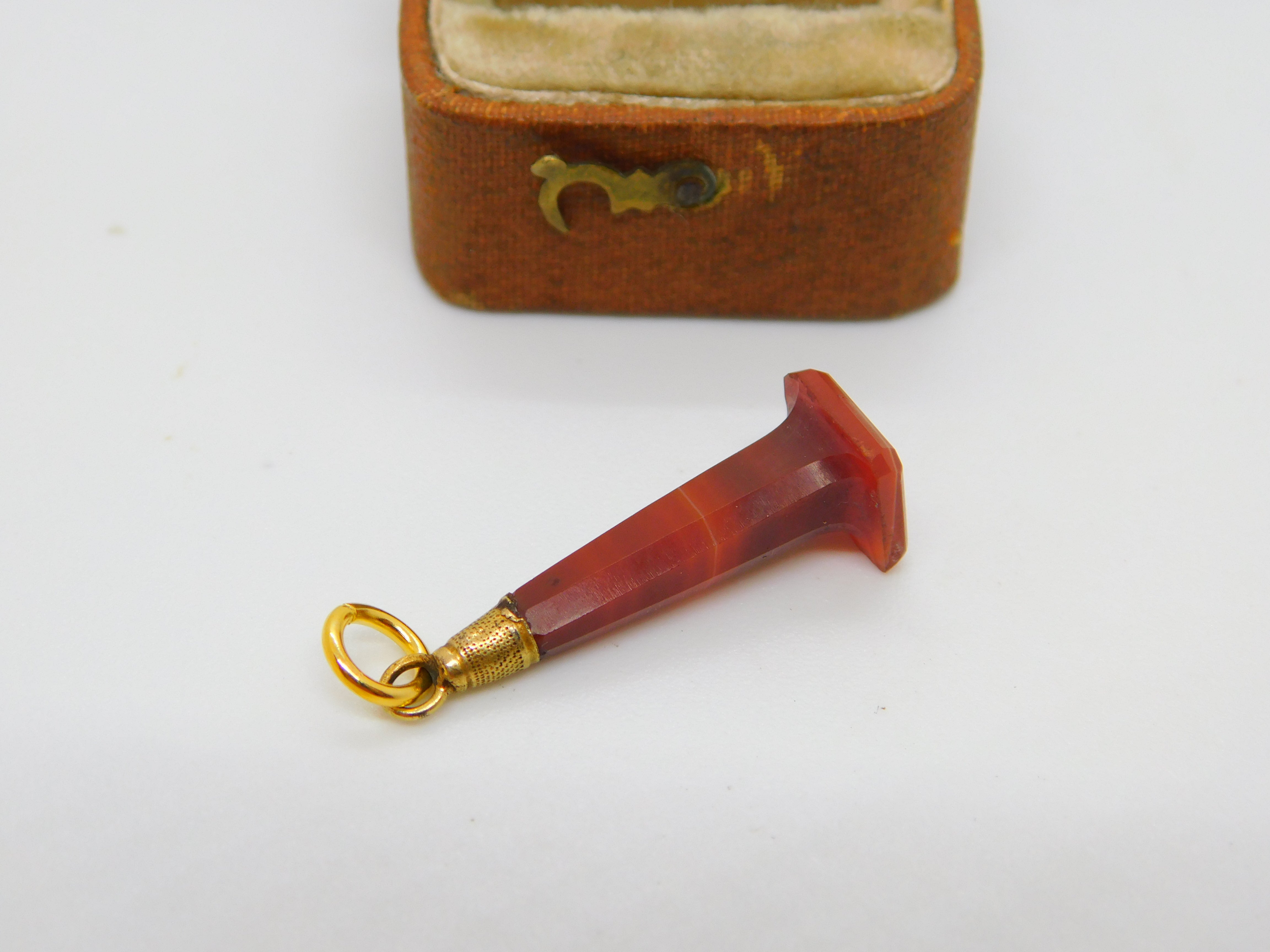 Victorian 9ct Gold & Carved Red Banded Agate Obelisk Fob Pendant c1860 Antique