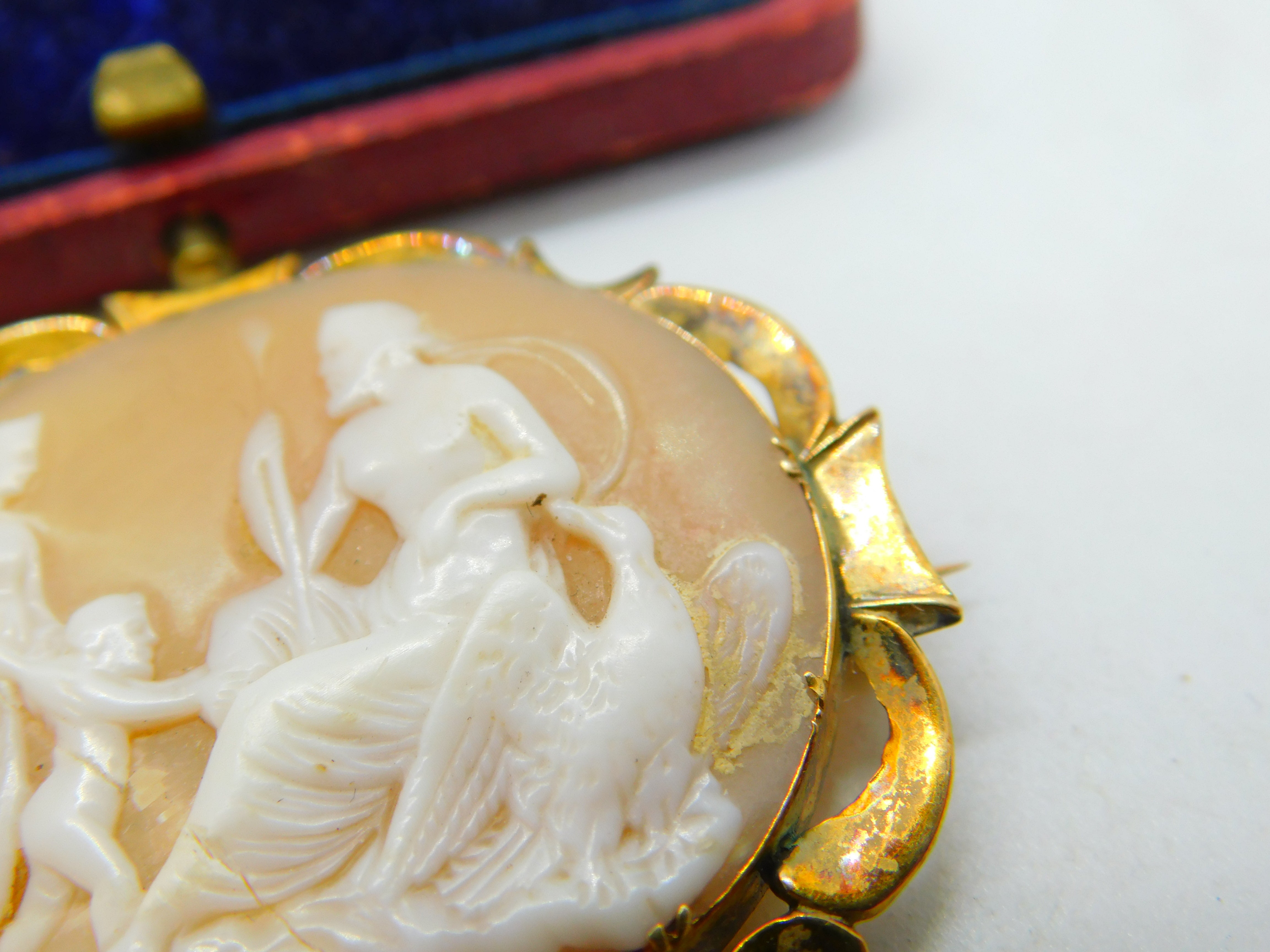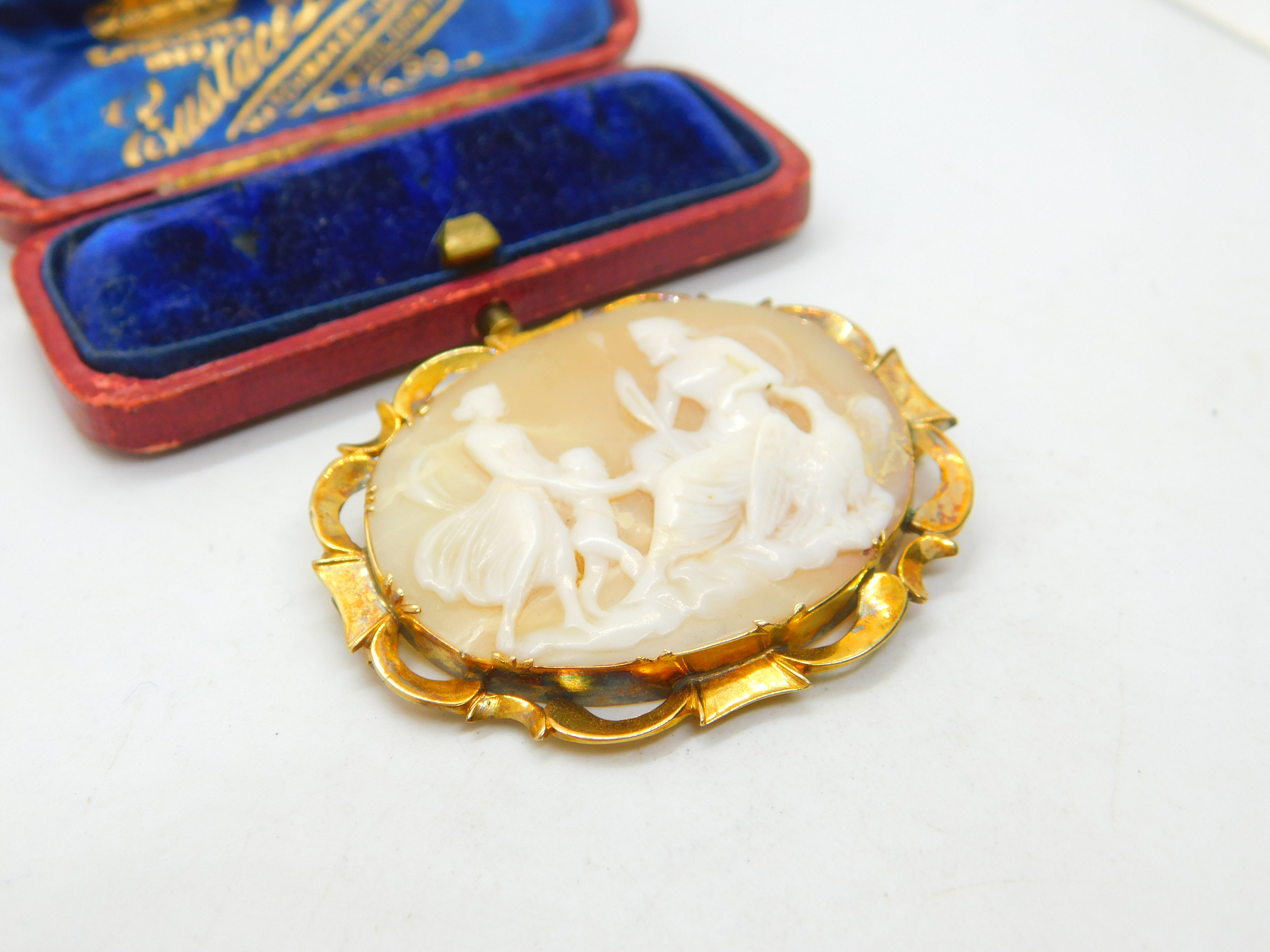 Details: A fantastic and wonderfully designed antique Victorian 9ct yellow gold set carved shell cameo with superb image depicting Jupiter sitting with an eagle with his wife juno to the left c1860. The gold has been XRF tested and needs a good polish. This is a wonderful item that would make a perfect gift or addition to any collection. The BOX pictured is for PRESENTATION ONLY and is NOT included in the listings but used to frame the pictures unless specifically stated otherwise.