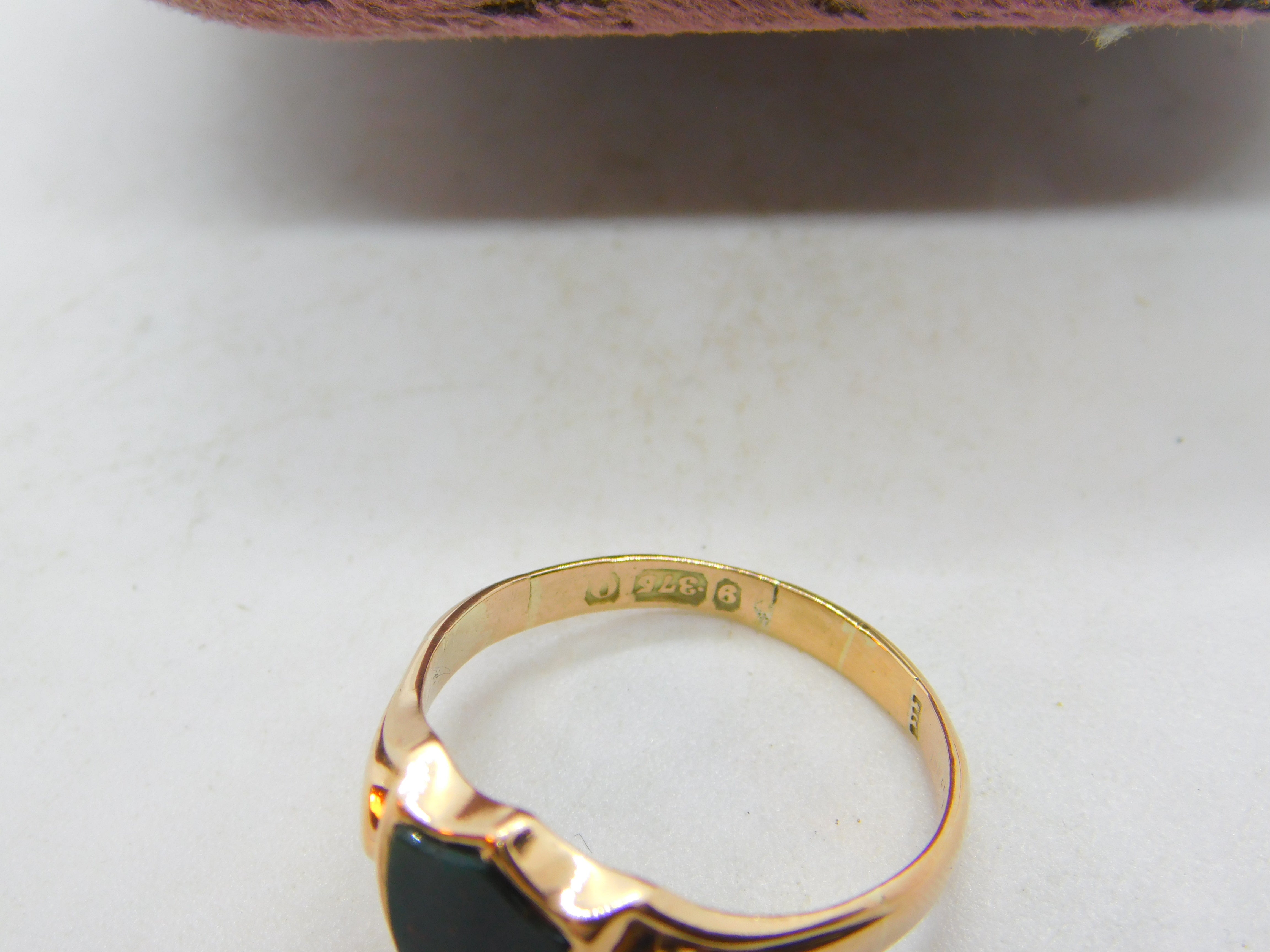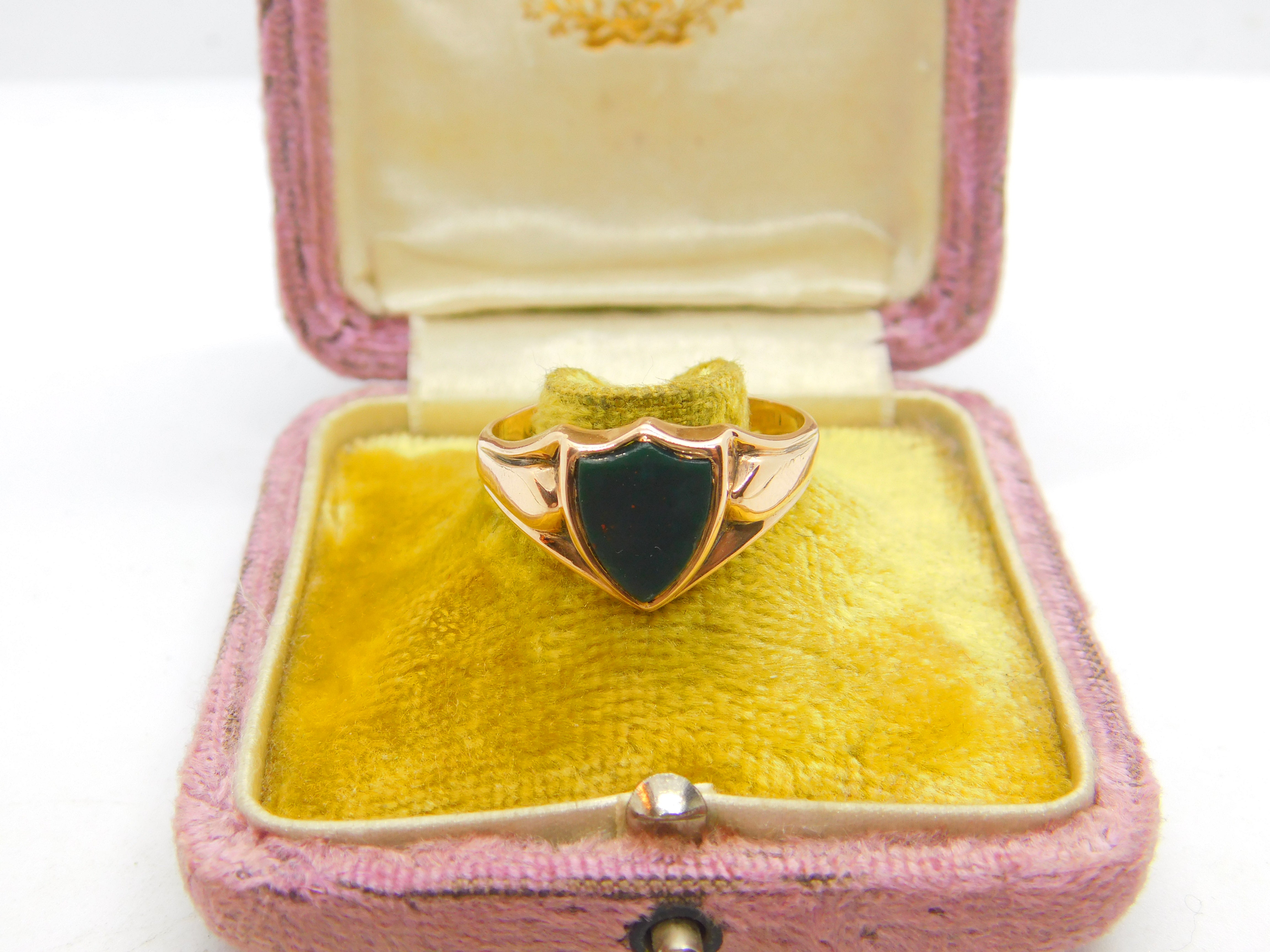 Victorian 9ct Gold Carved Shield Bloodstone Set Signet Ring 1891 Birmingham