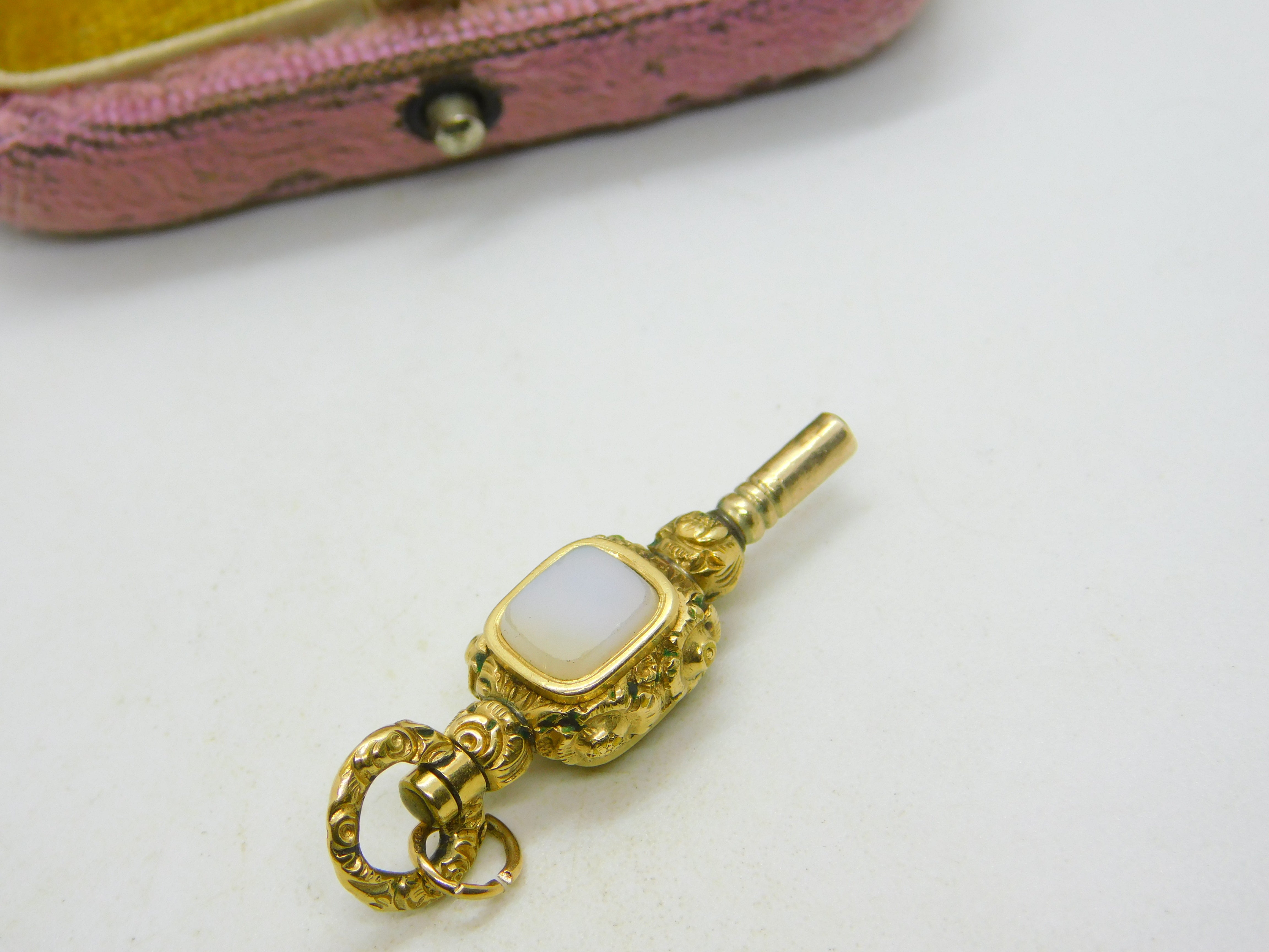 Details: A fantastic and wonderfully designed antique Victorian 9ct gold cased watch key fob or pendant set with bloodstone and chalcedony agate c1860, the gold has been XRF tested. This is gold cased meaning gold on brass or base metal internal effects. This is a wonderful item that would make a perfect gift or addition to any collection. The BOX pictured is for PRESENTATION ONLY and is NOT included in the listings but used to frame the pictures unless specifically stated otherwise.