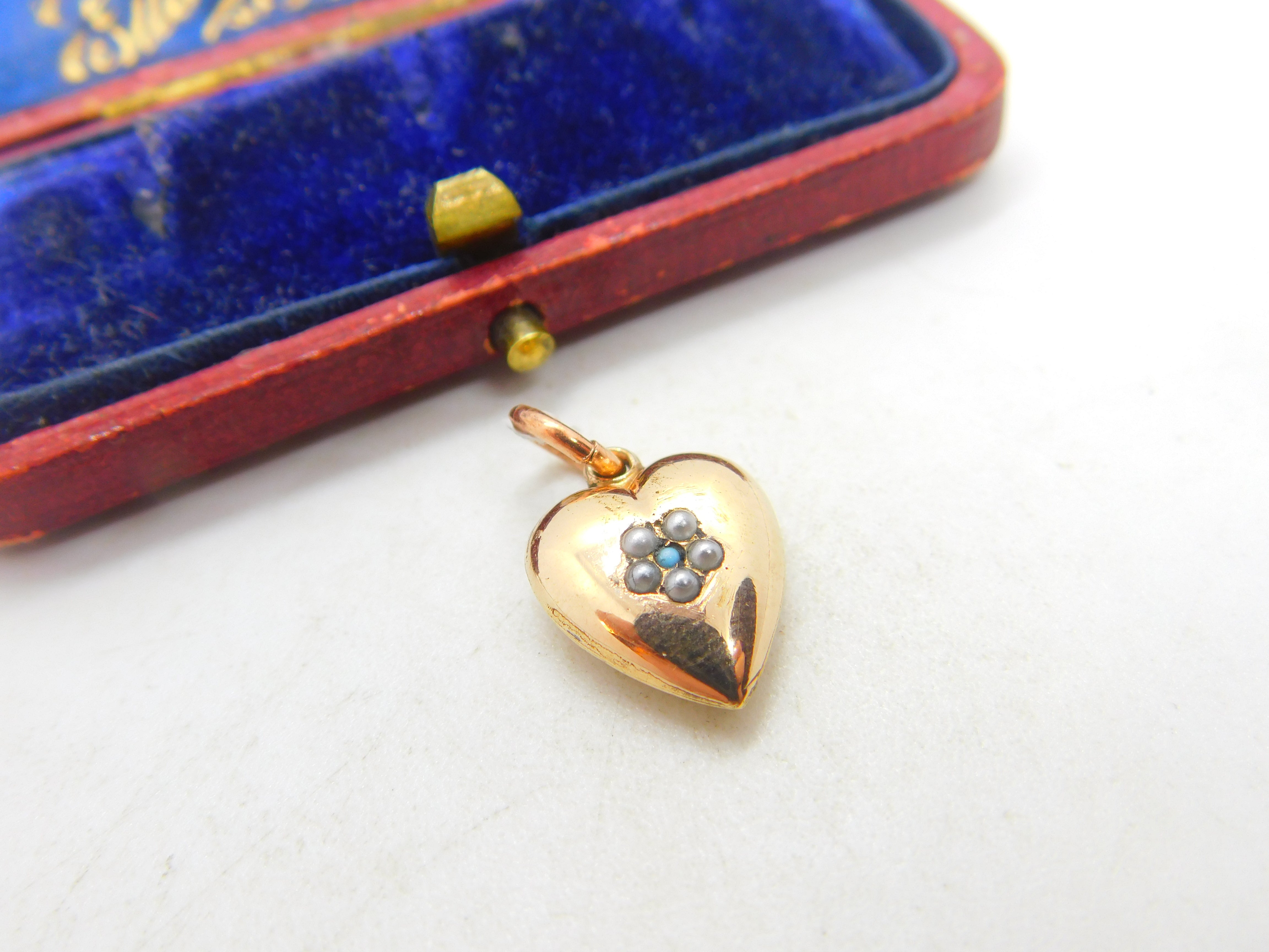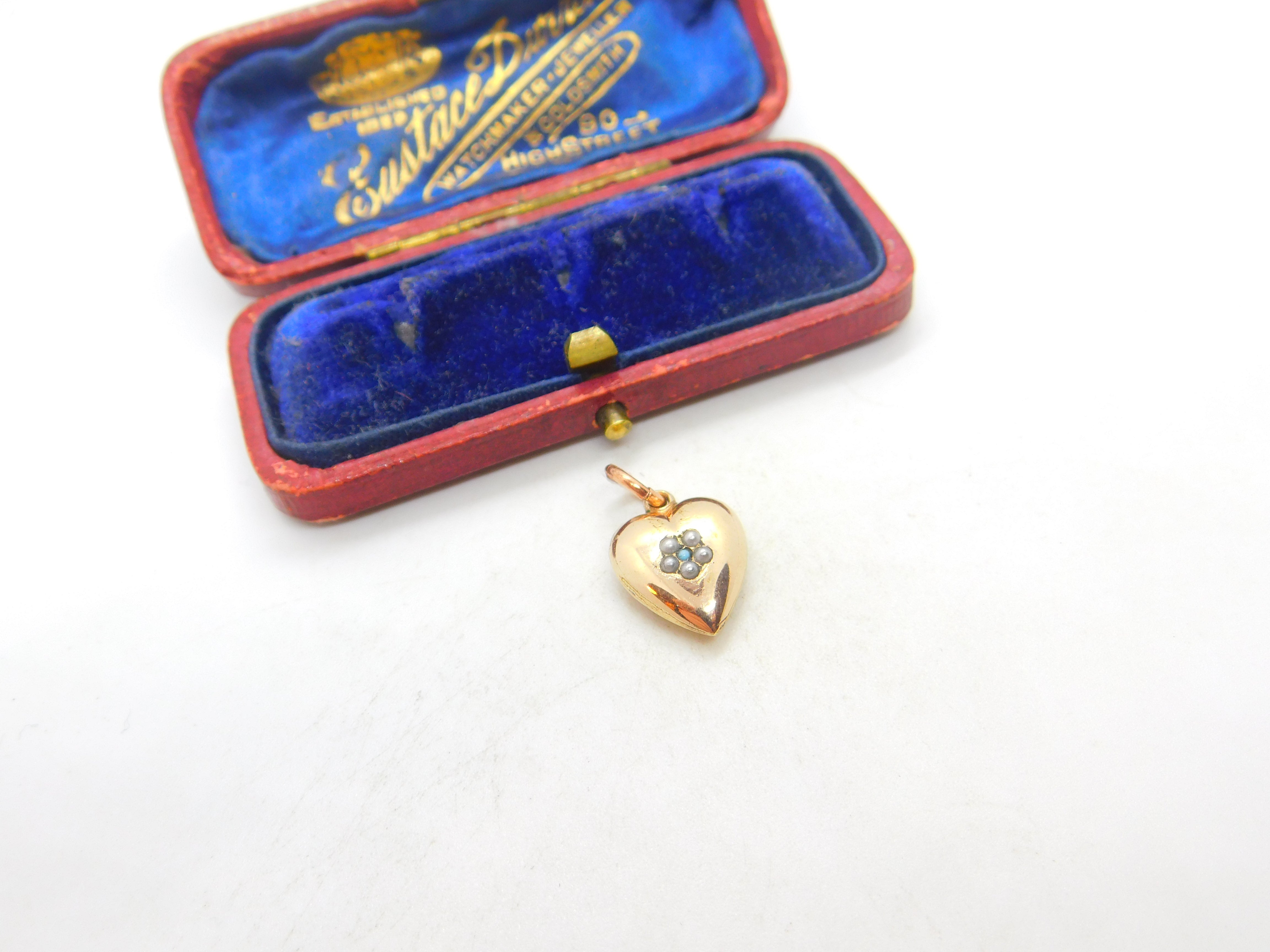 Details: A fantastic and wonderfully designed antique Victorian 9ct gold cased heart charm or pendant set with seed pearls and turquoise c1890. This is a wonderful item that would make a perfect gift or addition to any collection. The BOX pictured is for PRESENTATION ONLY and is NOT included in the listings but used to frame the pictures unless specifically stated otherwise.