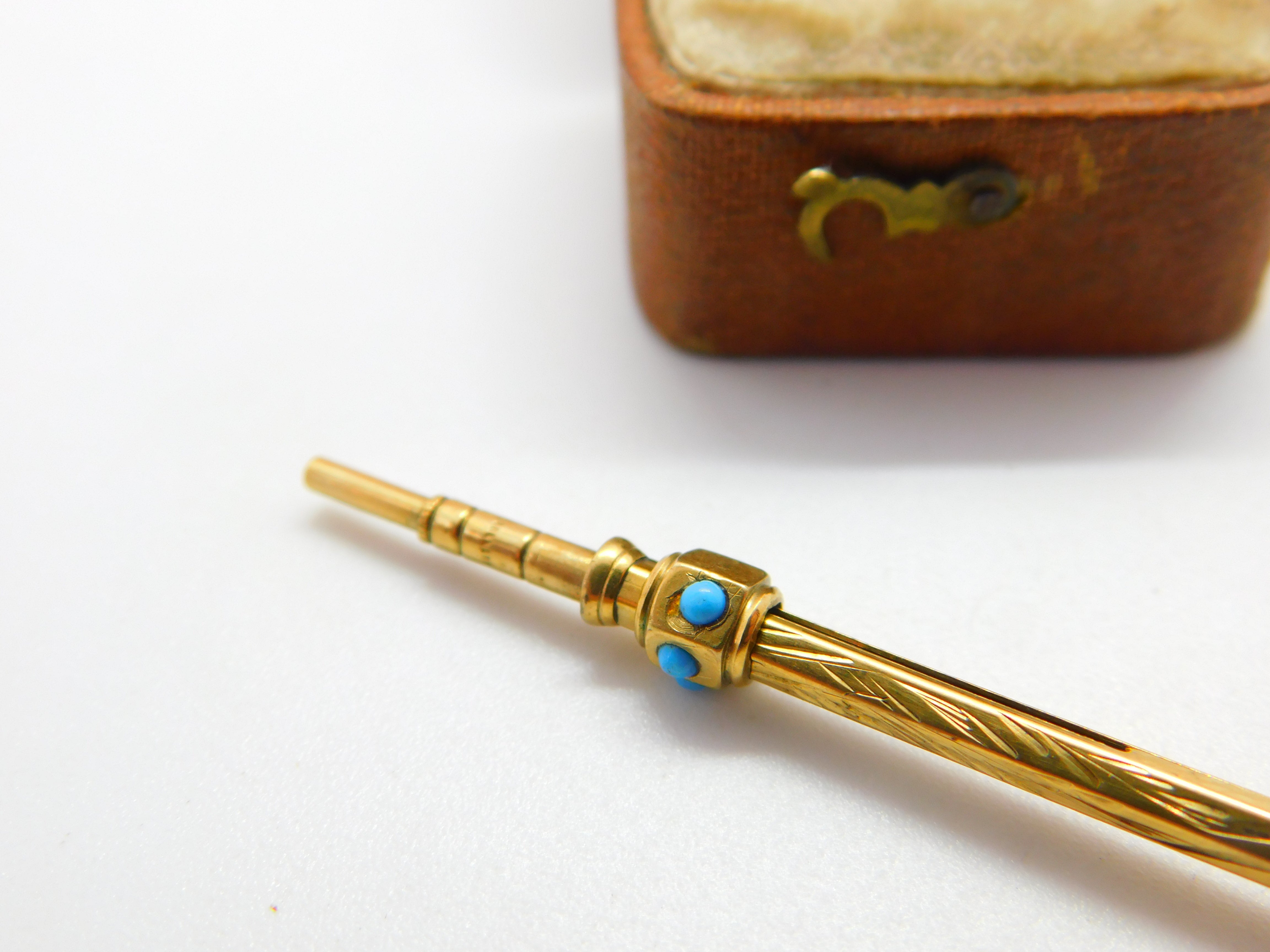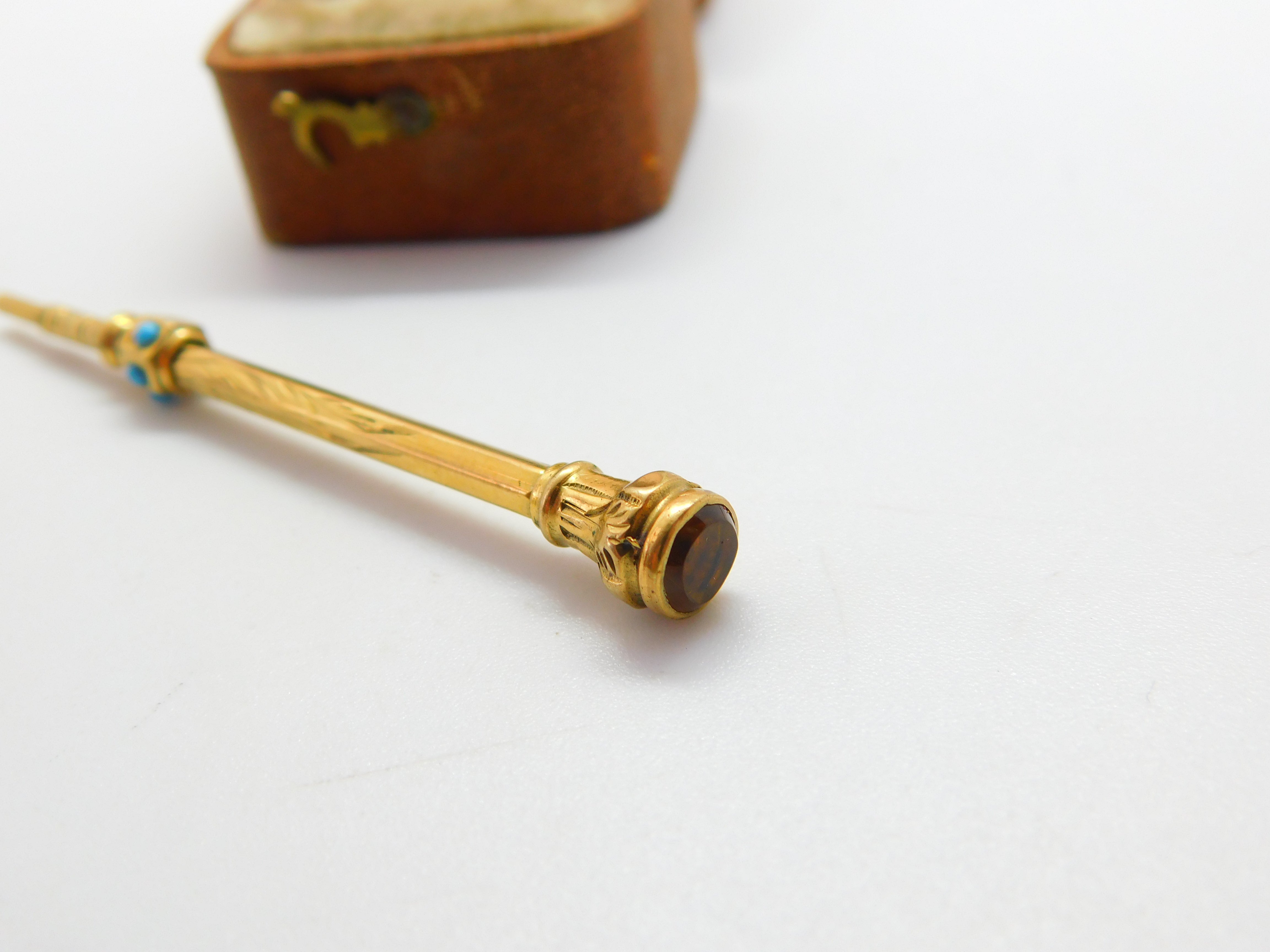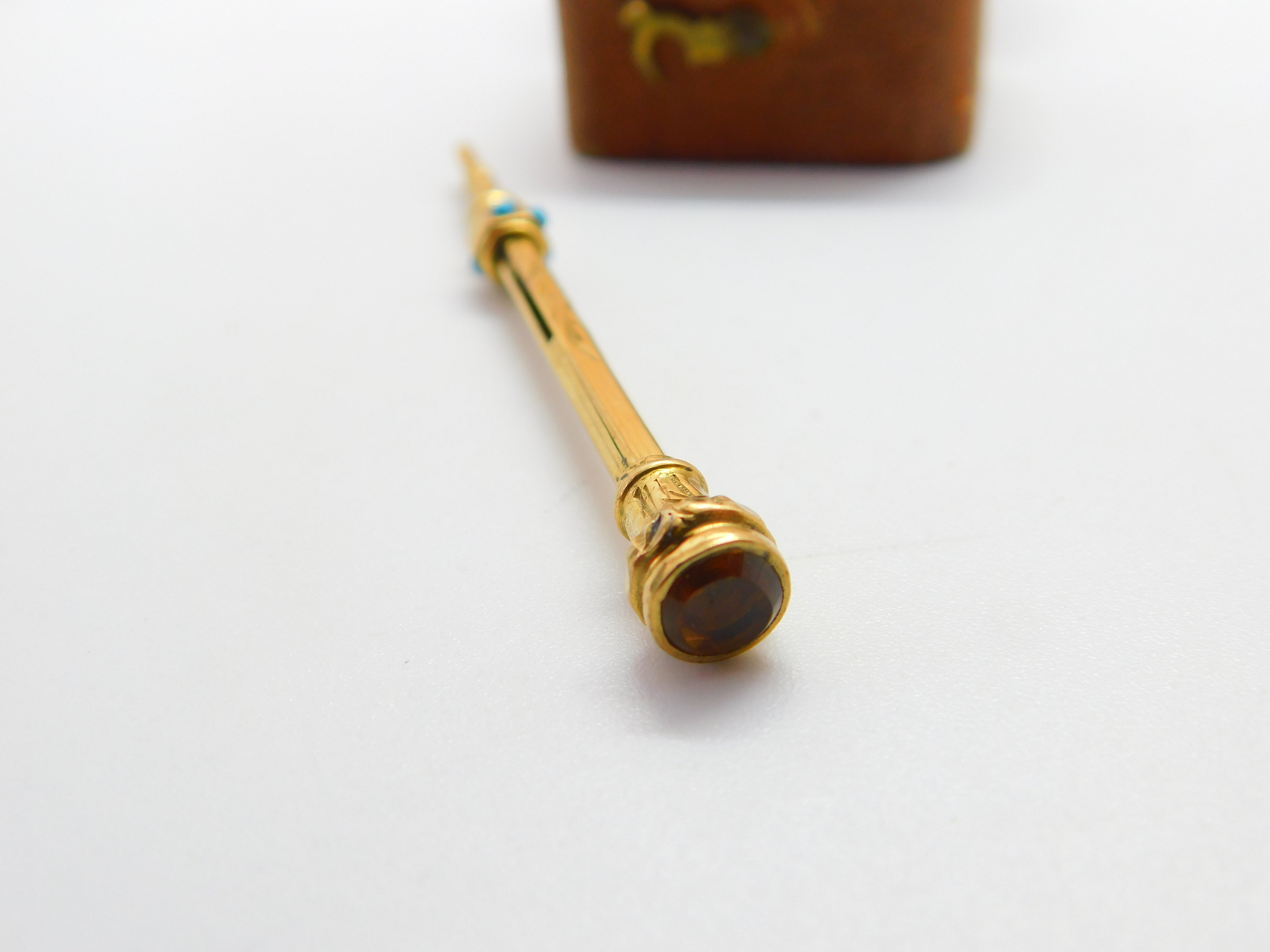 Details: A fantastic and wonderfully designed antique Victorian 9ct gold cased small propelling pencil adorned with turquoise and set with citrine to the terminal c1880. This is a wonderful item that would make a perfect gift or addition to any collection. The BOX pictured is for PRESENTATION ONLY and is NOT included in the listings but used to frame the pictures unless specifically stated otherwise.