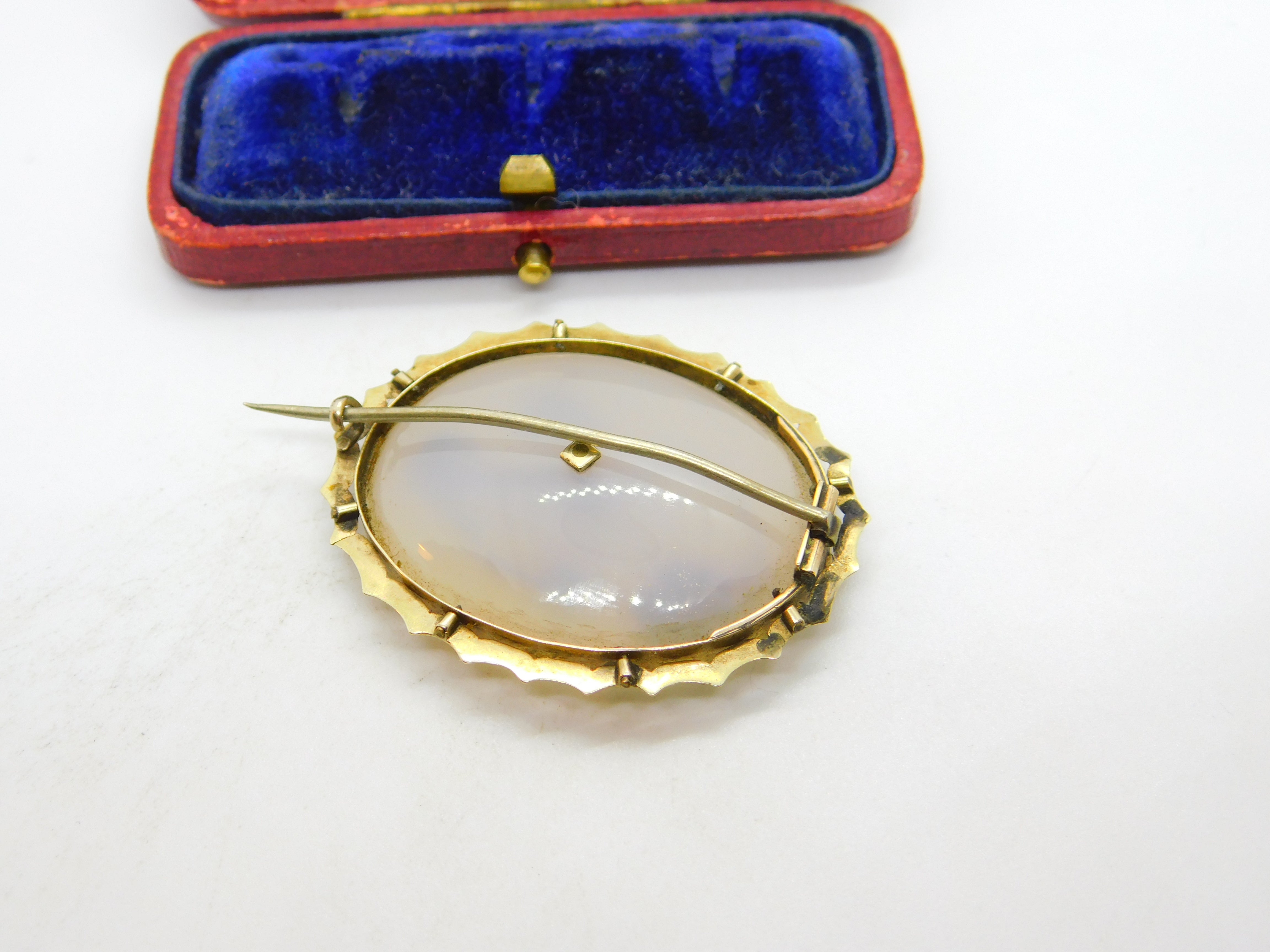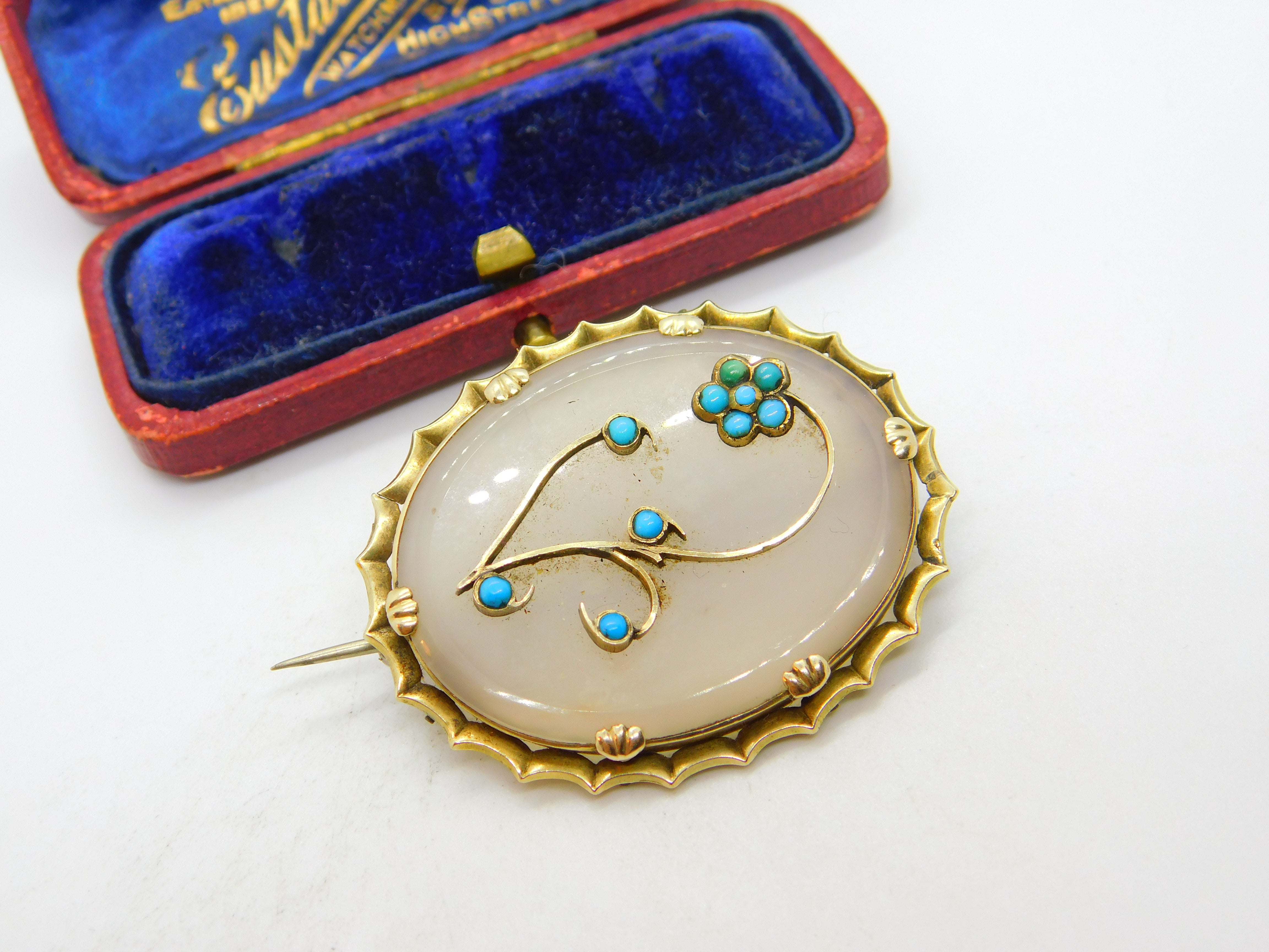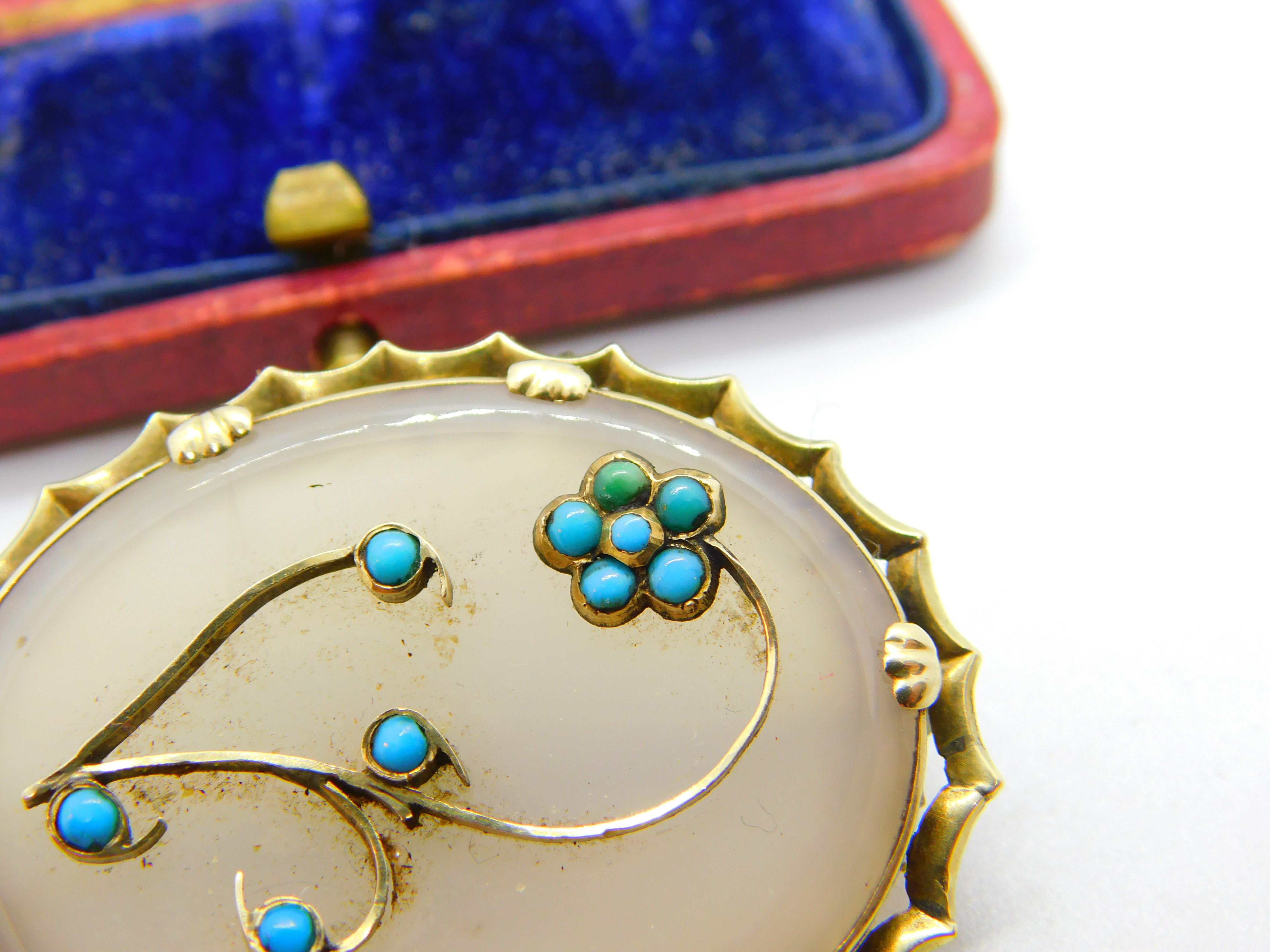 Details: A fantastic and wonderfully designed antique Victorian 9ct yellow gold mounted sweetheart brooch set with chalcedony & turquoise c1860, the gold has been XRF tested. This is a wonderful item that would make a perfect gift or addition to any collection. The BOX pictured is for PRESENTATION ONLY and is NOT included in the listings but used to frame the pictures unless specifically stated otherwise.
