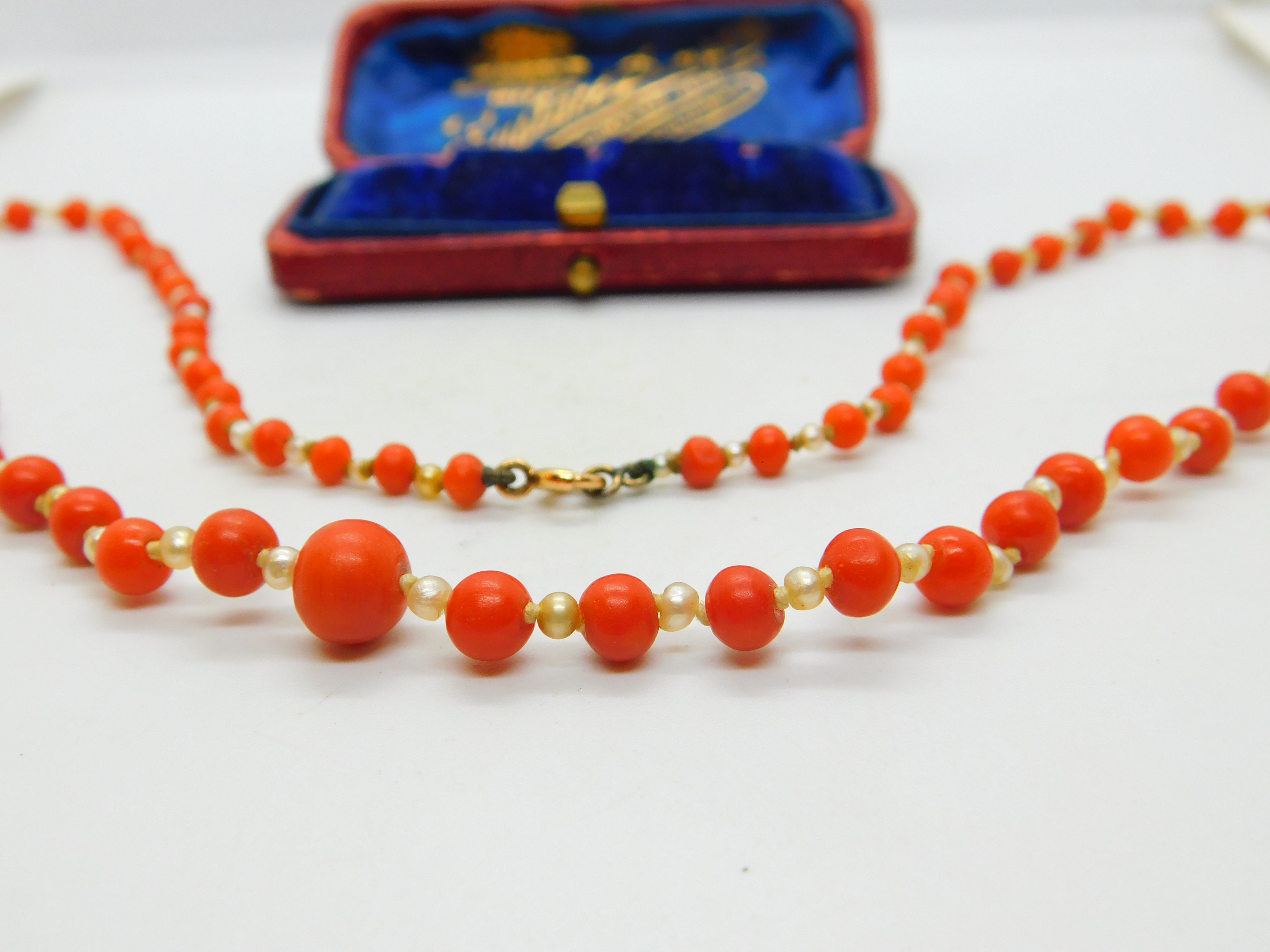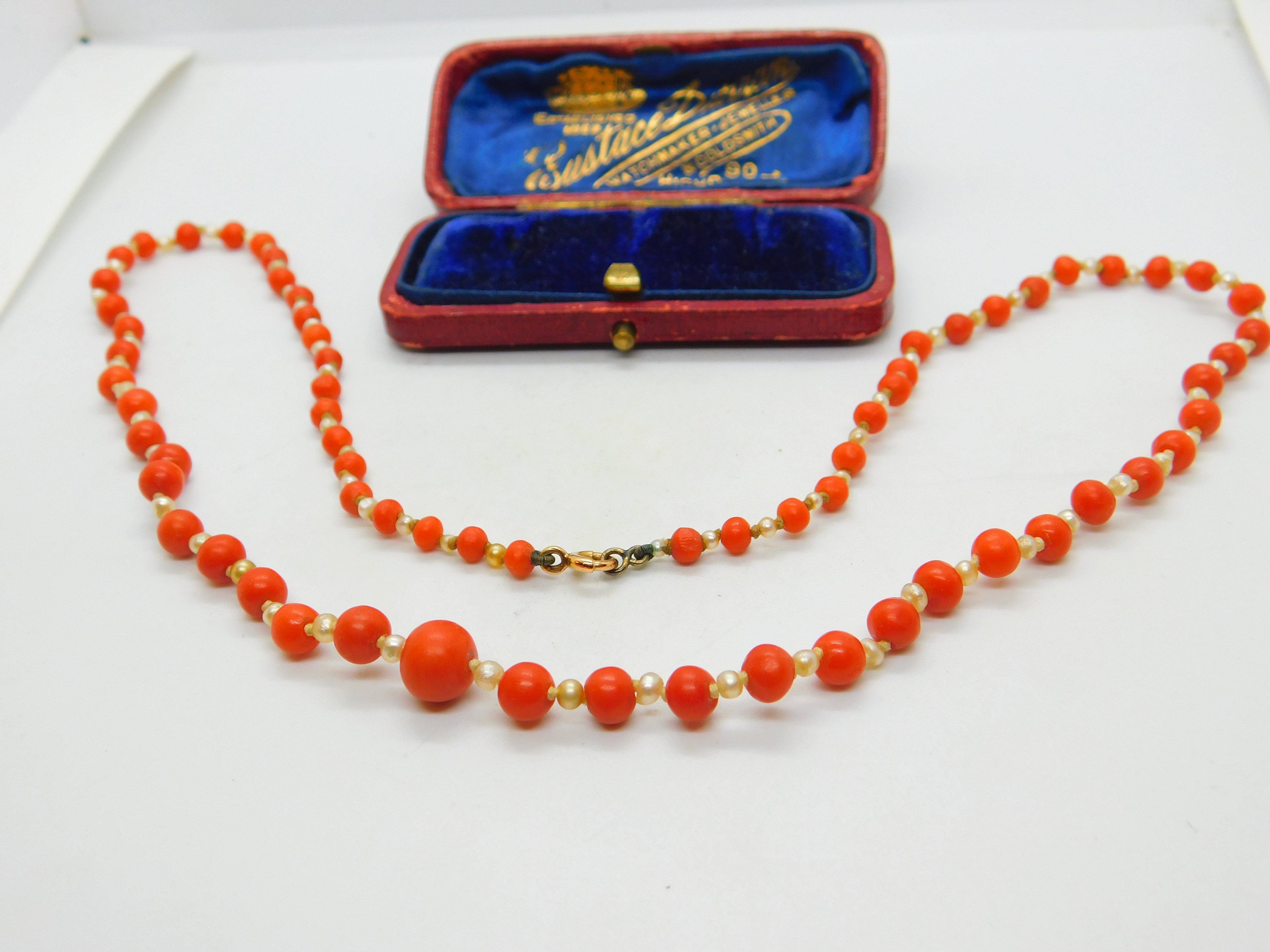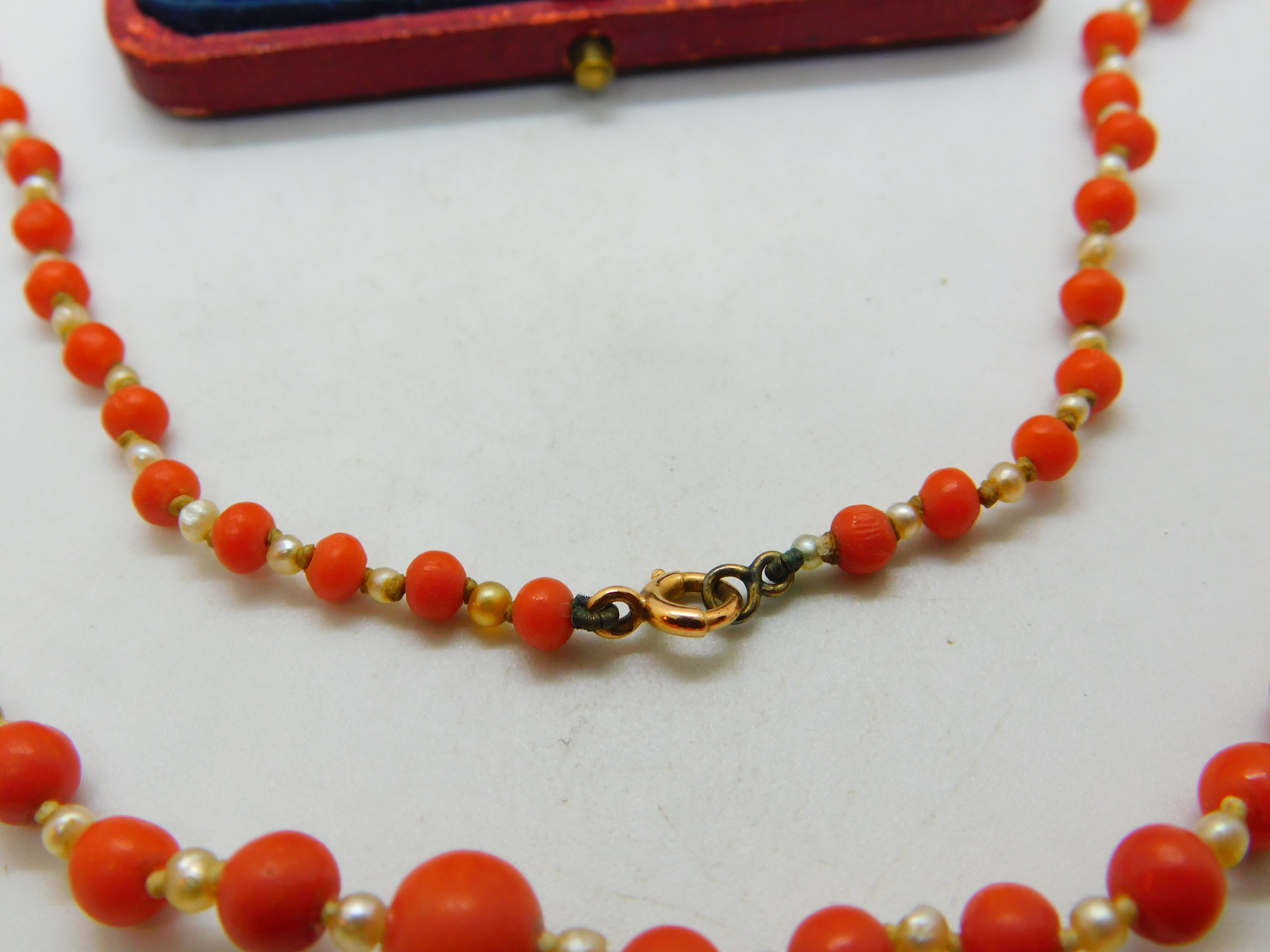 Victorian 9ct Gold Clasp Graduated Coral & Pearl Beaded Necklace Antique c1860