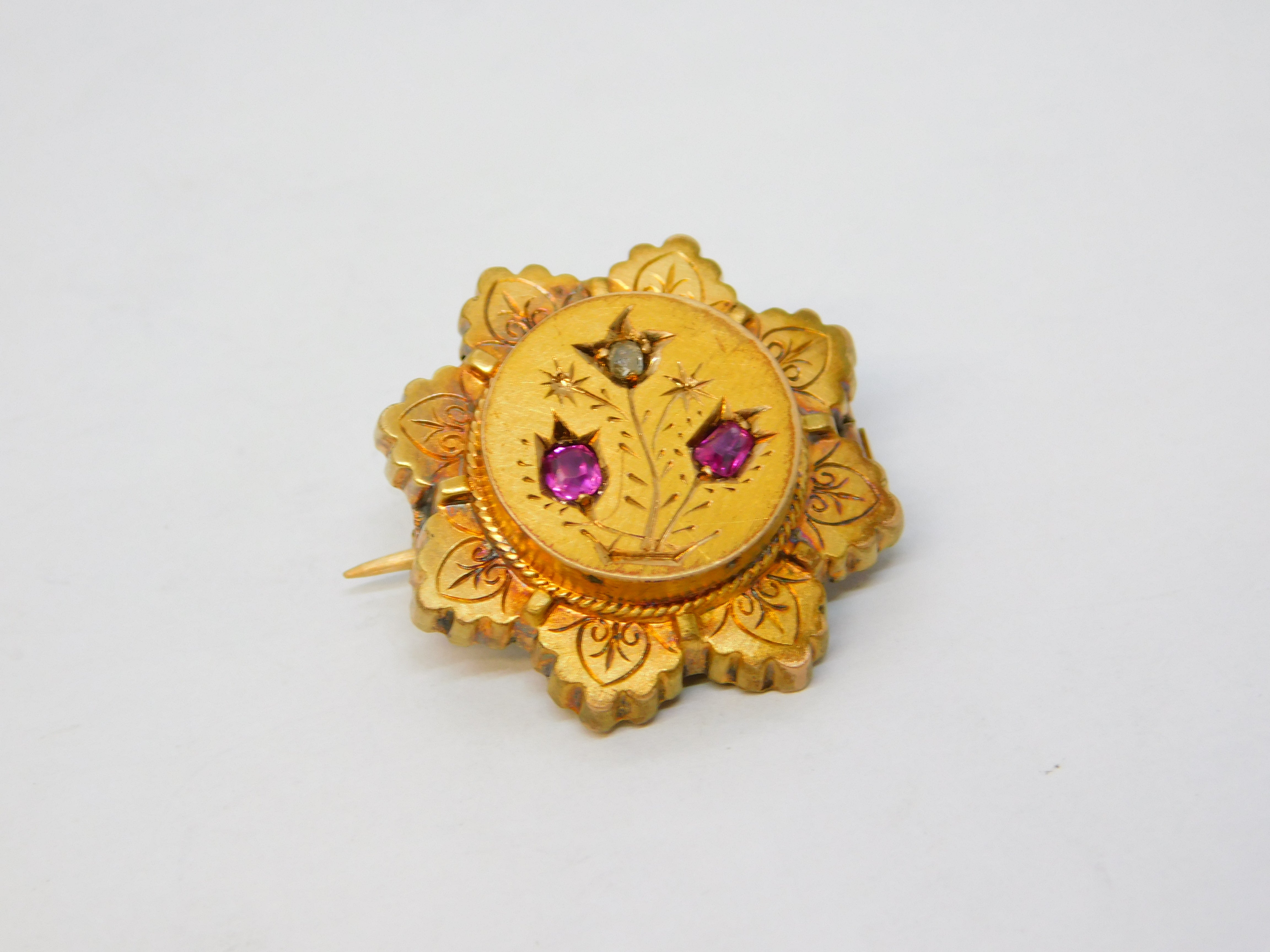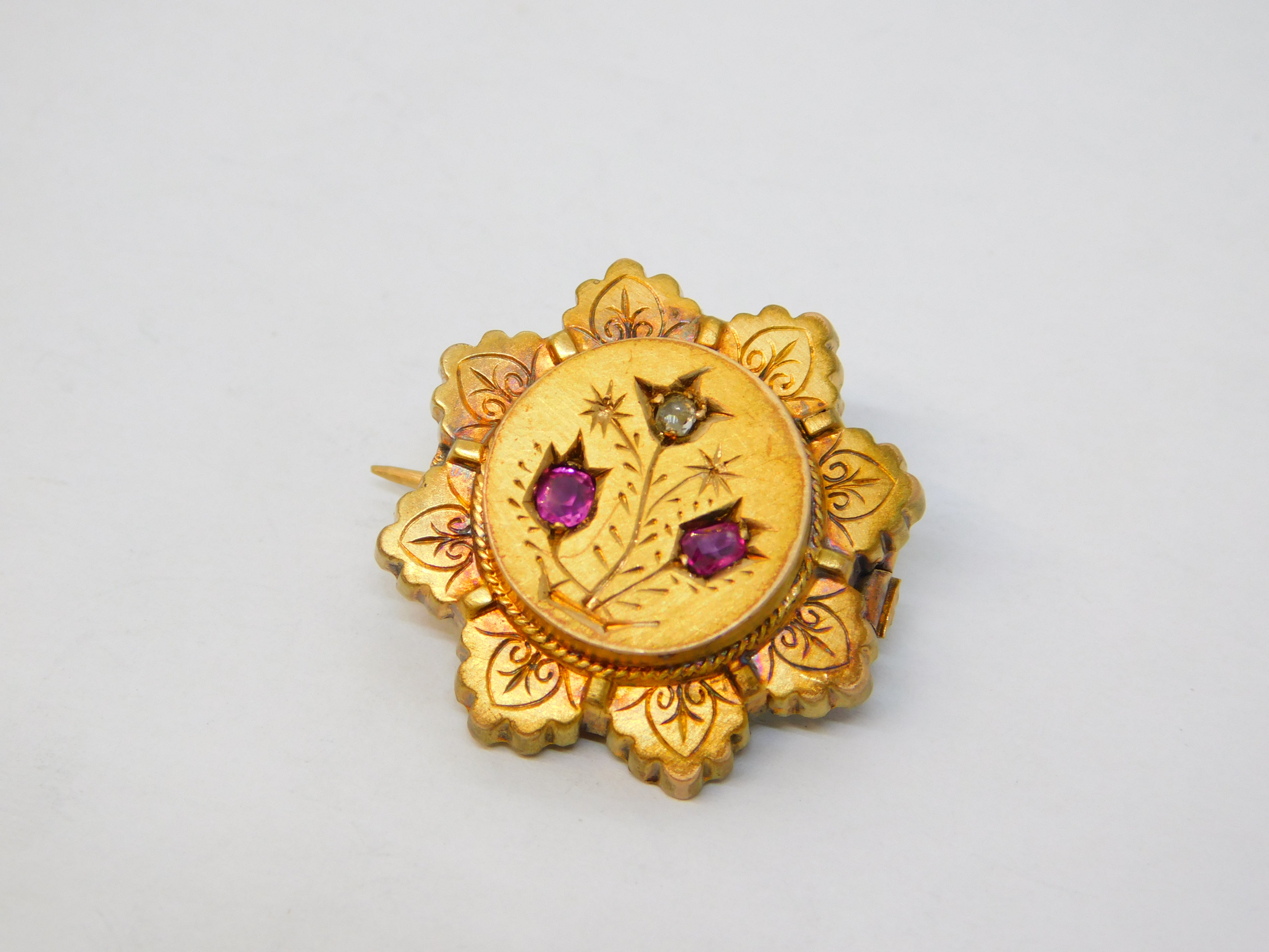 Details: A fantastic and wonderfully designed antique Victorian 9ct yellow gold floral brooch with locket to the reverse set with old-cut diamond and two rubies c1880, the gold has been XRF tested as it is unmarked. This is a wonderful item that would make a perfect gift or addition to any collection.