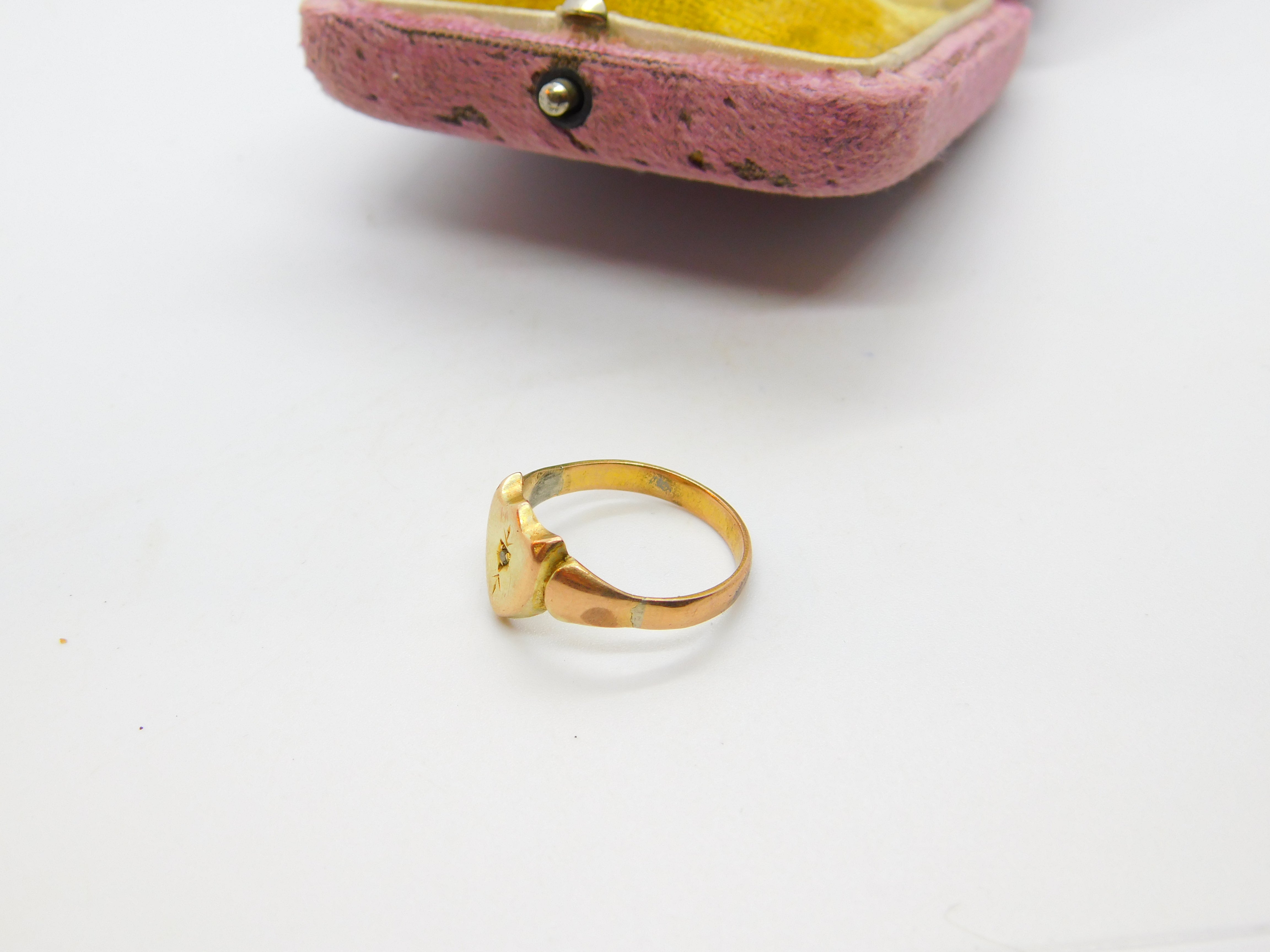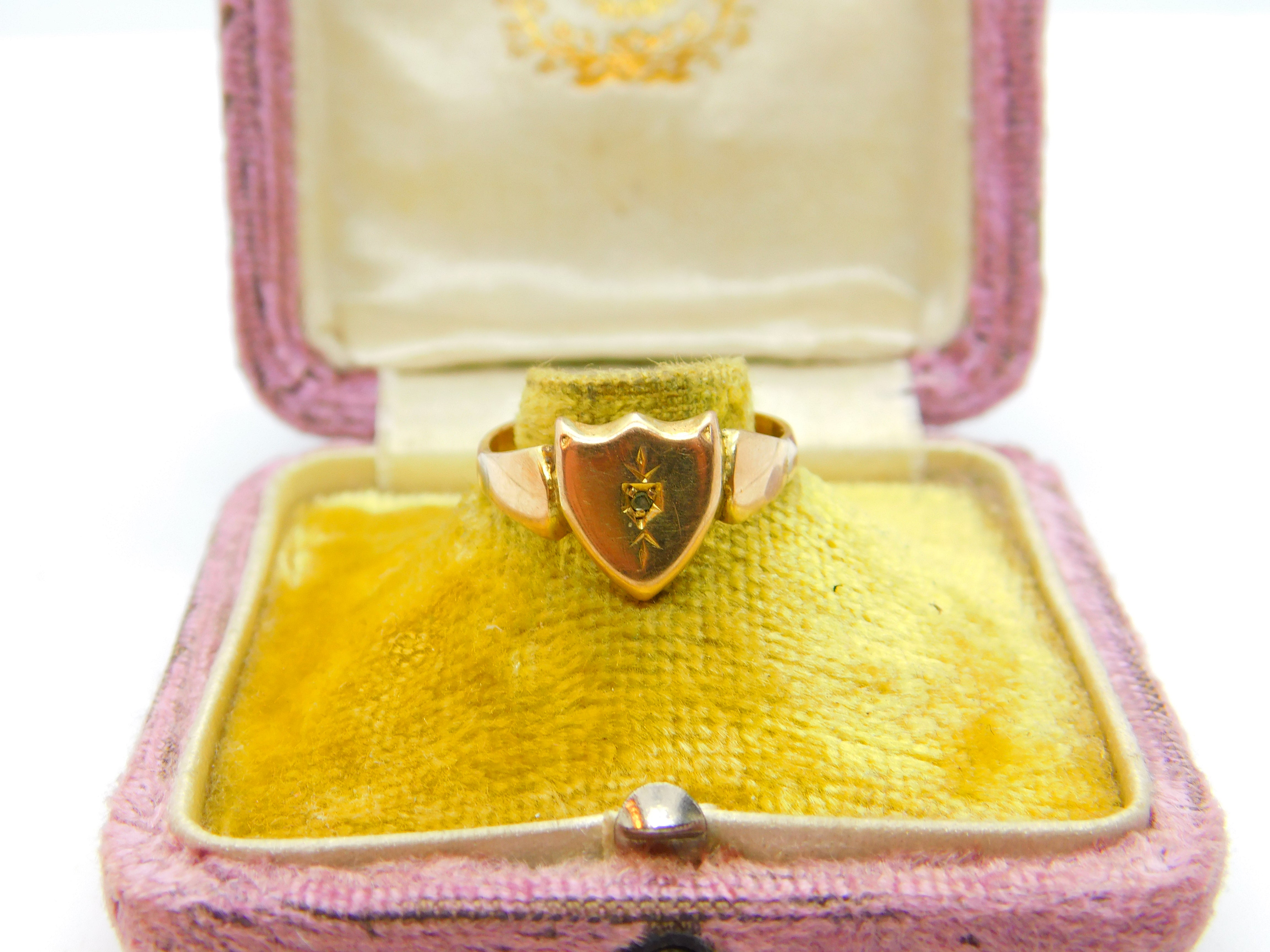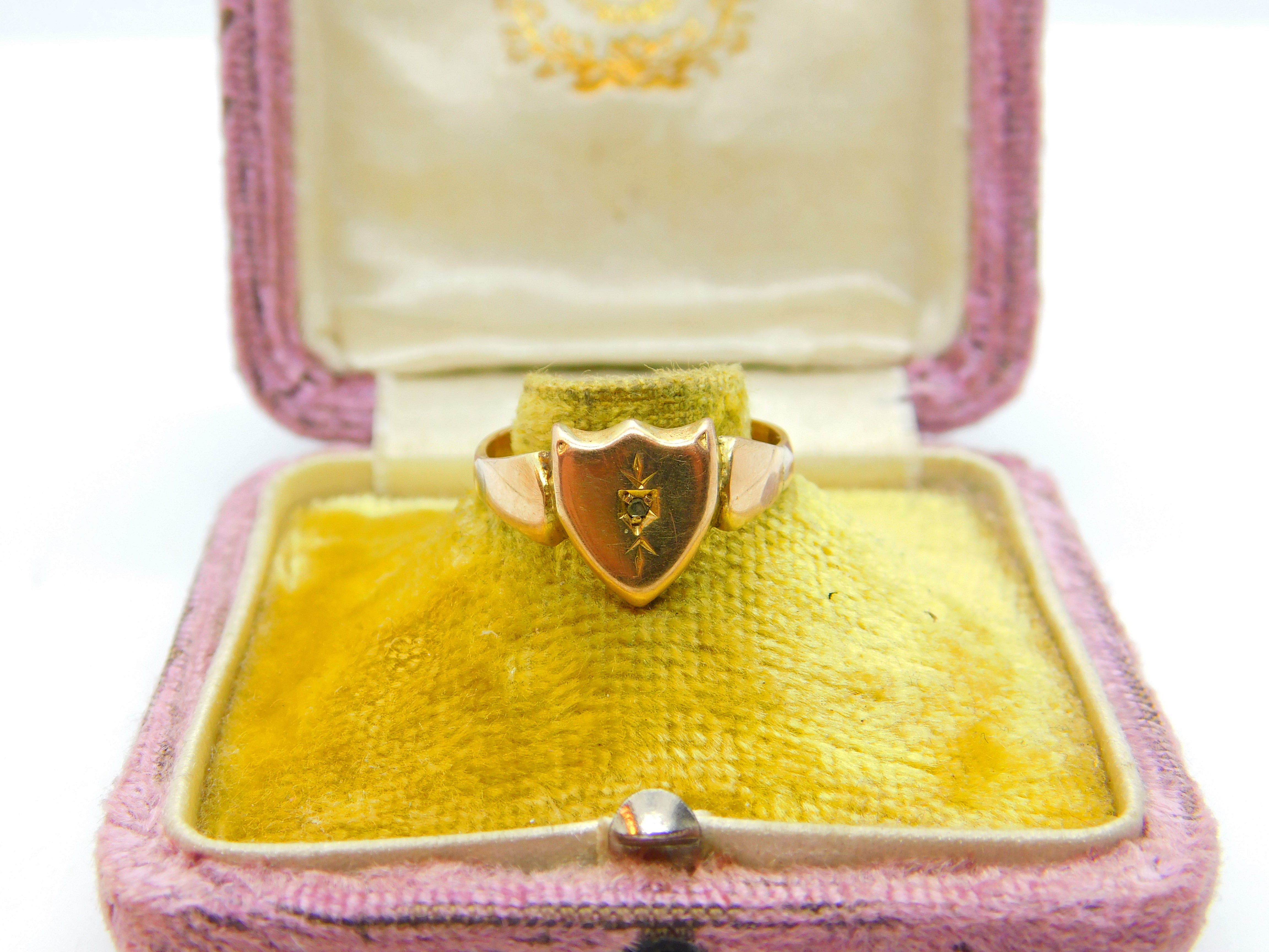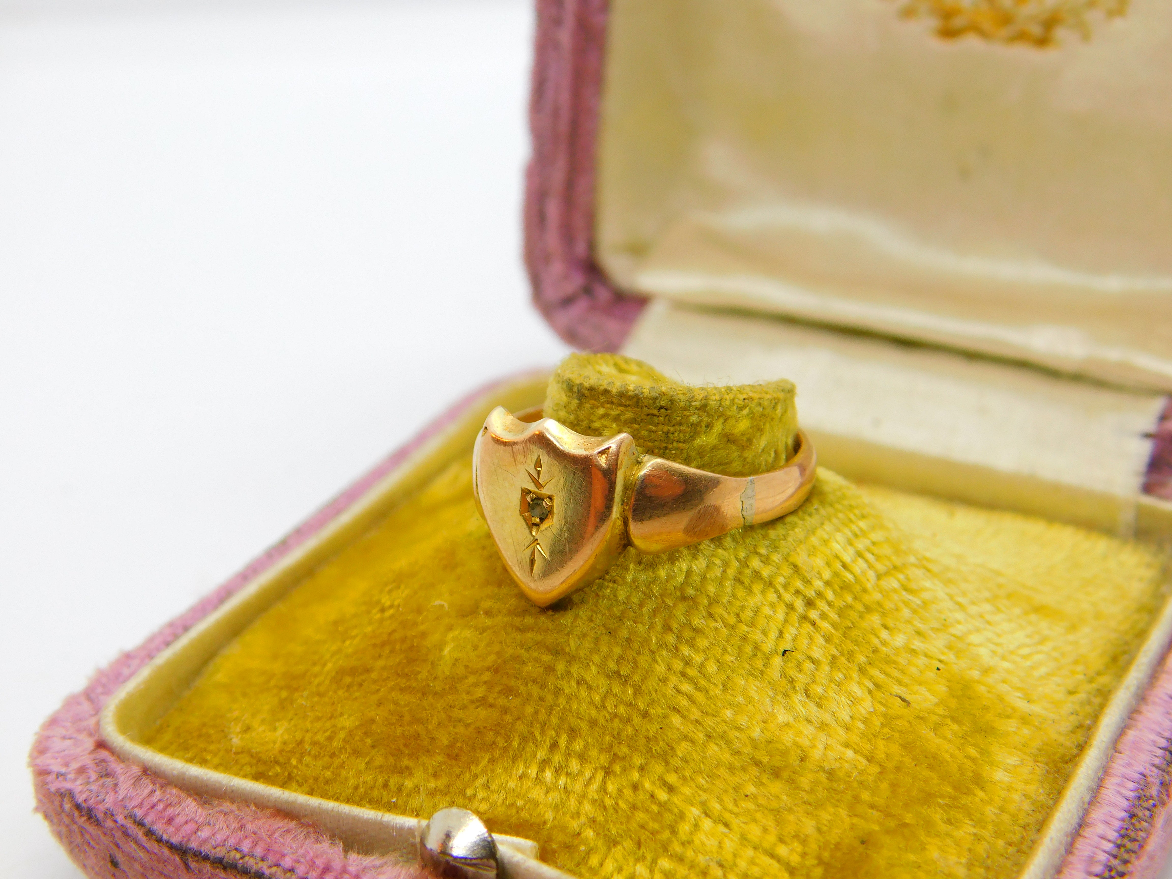 Details: A fantastic and wonderfully designed antique Victorian 9ct rose gold shield shape gents signet ring set with a small diamond c1880, the gold has been XRF tested. This is a wonderful item that would make a perfect gift or addition to any collection. The BOX pictured is for PRESENTATION ONLY and is NOT included in the listings but used to frame the pictures unless specifically stated otherwise.