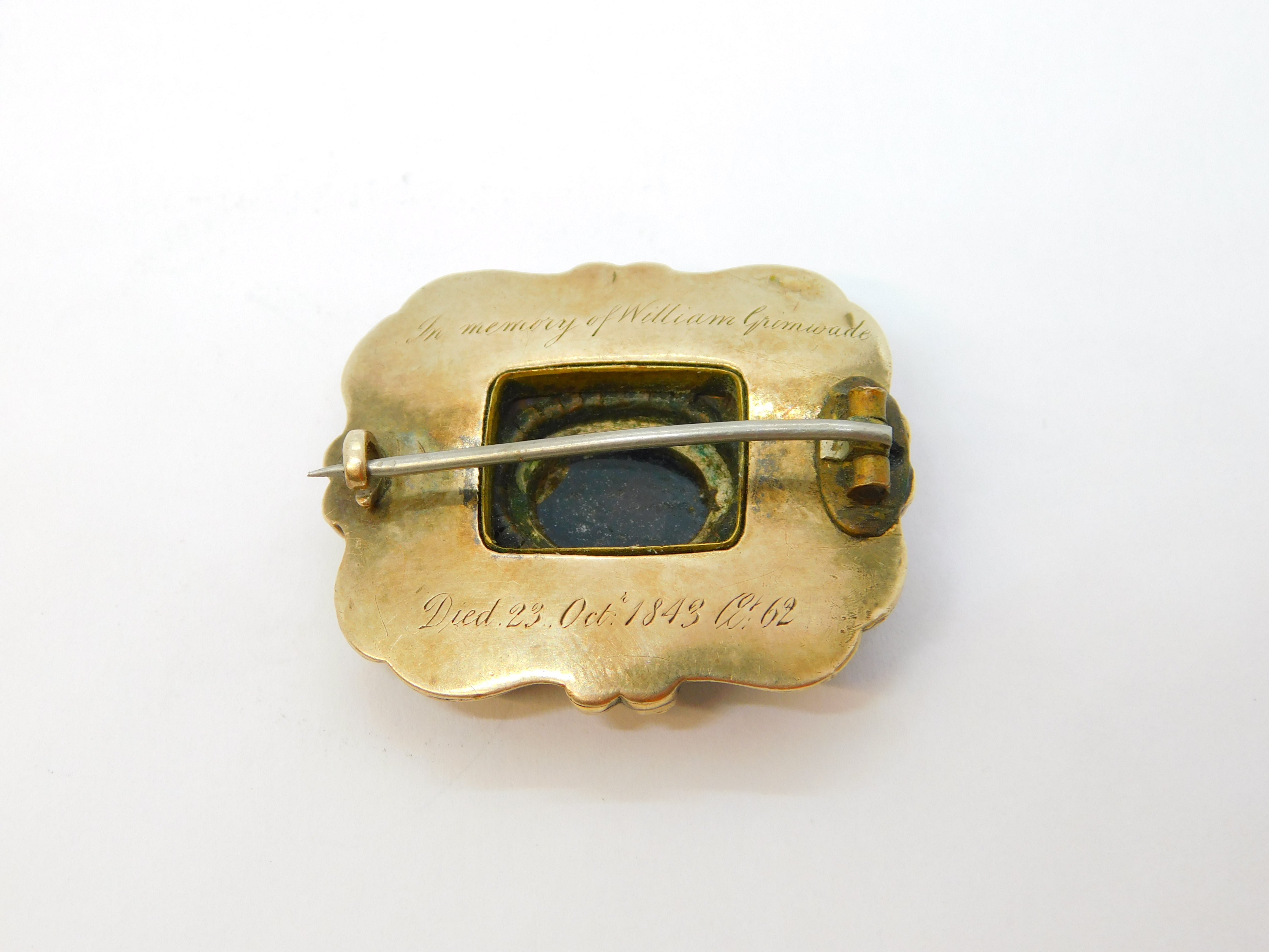 Details: A fantastic and wonderfully designed antique early-Victorian 9ct yellow gold mourning brooch with black enamel surrounding a central carved black hardstone panel with floral detailing flanked with seed pearls, engraved to the reverse 'In Memory of William Grimwade, Died 23 Oct 1843 At 62', the gold has been XRF tested please see pictures, enamel damage to the front. This is a wonderful item that would make a perfect gift or addition to any collection. We are more than happy to provide XRF reports for items upon request.