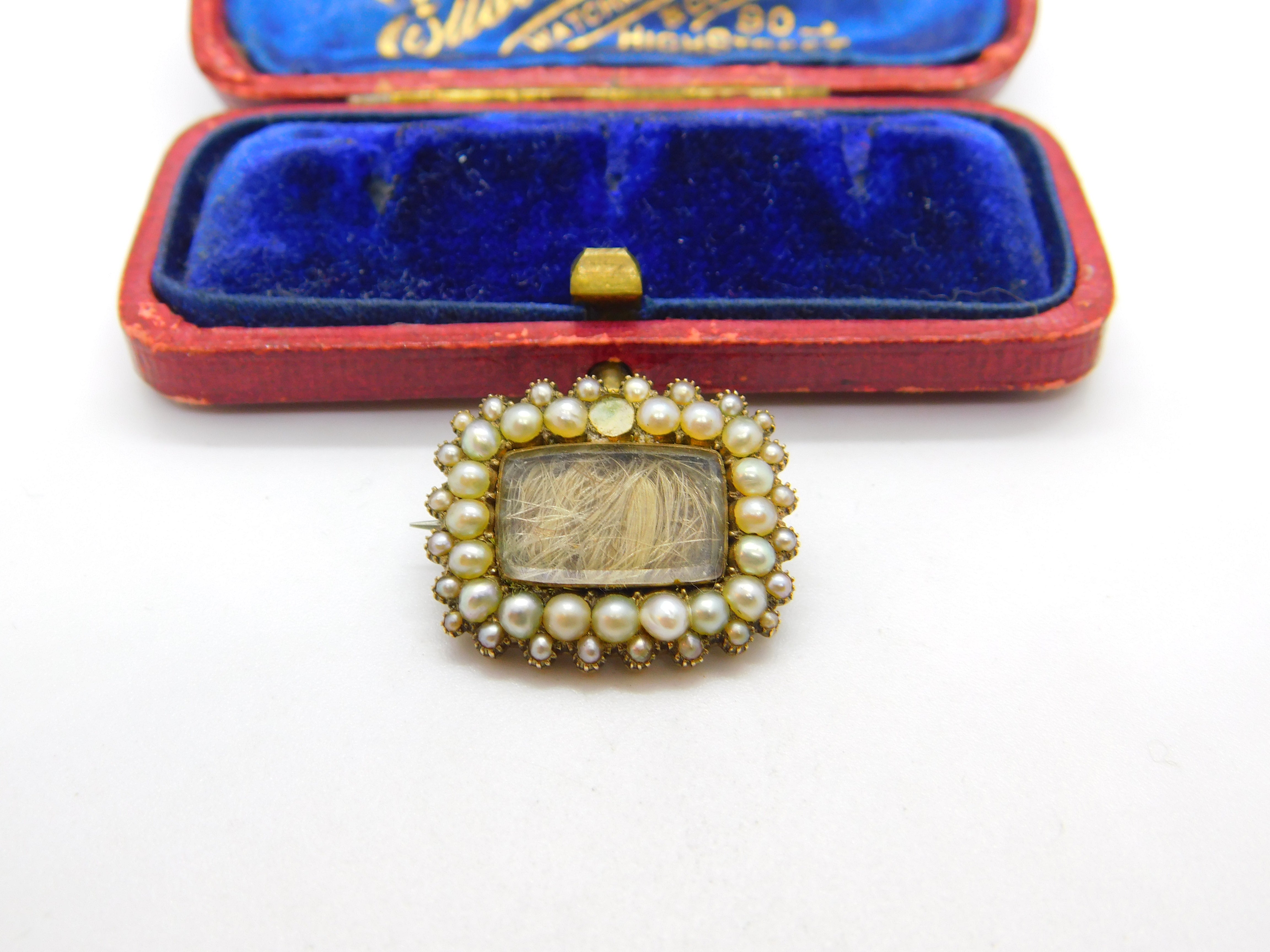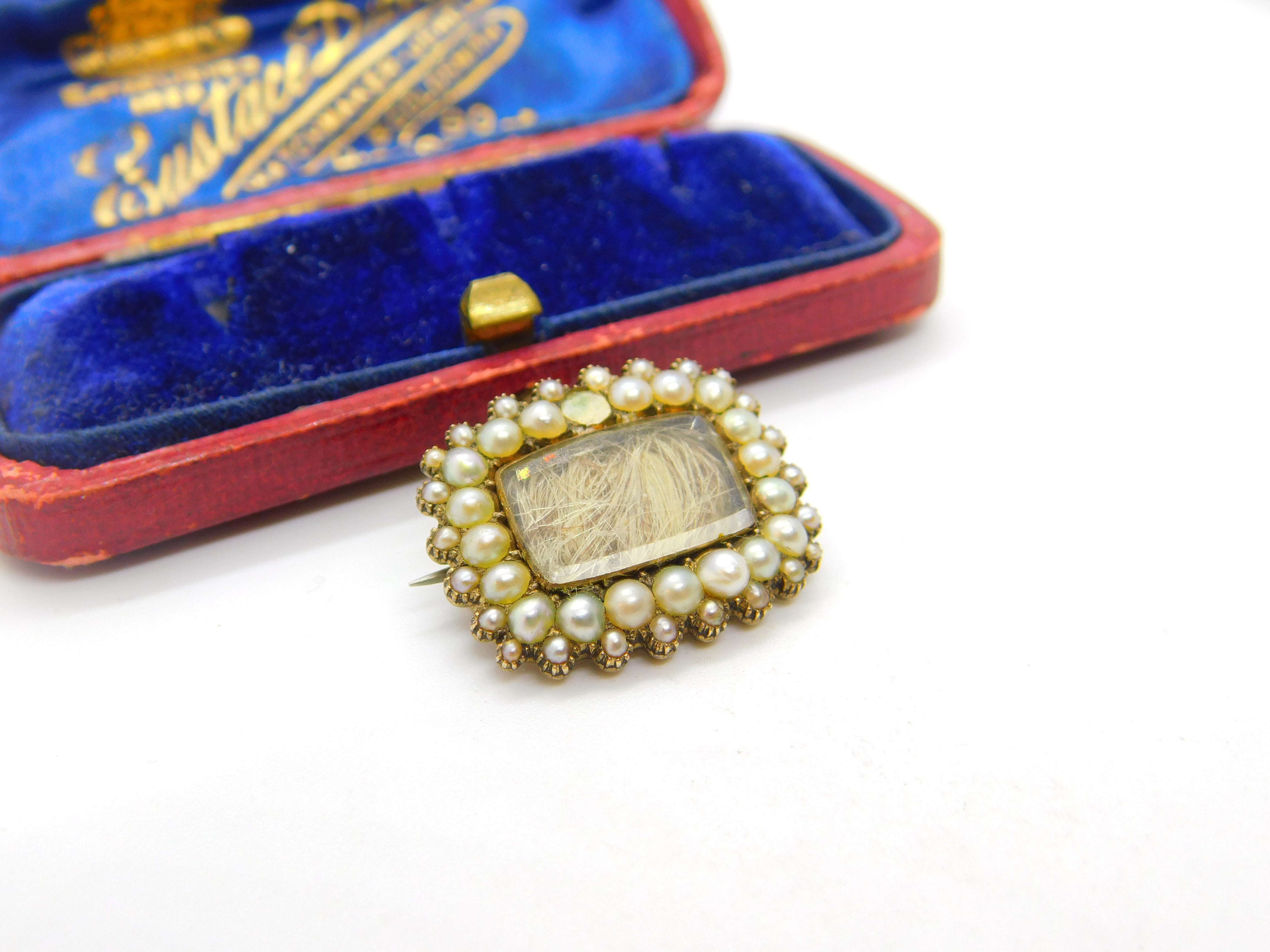 Details: A fantastic and wonderfully designed antique early Victorian 9ct gold, seed pearl and hair plait mourning brooch c1850 - missing one pearl although easily replaced and the gold has been XRF tested. This is a wonderful item that would make a perfect gift or addition to any collection. The BOX pictured is for PRESENTATION ONLY and is NOT included in the listings but used to frame the pictures unless specifically stated otherwise.