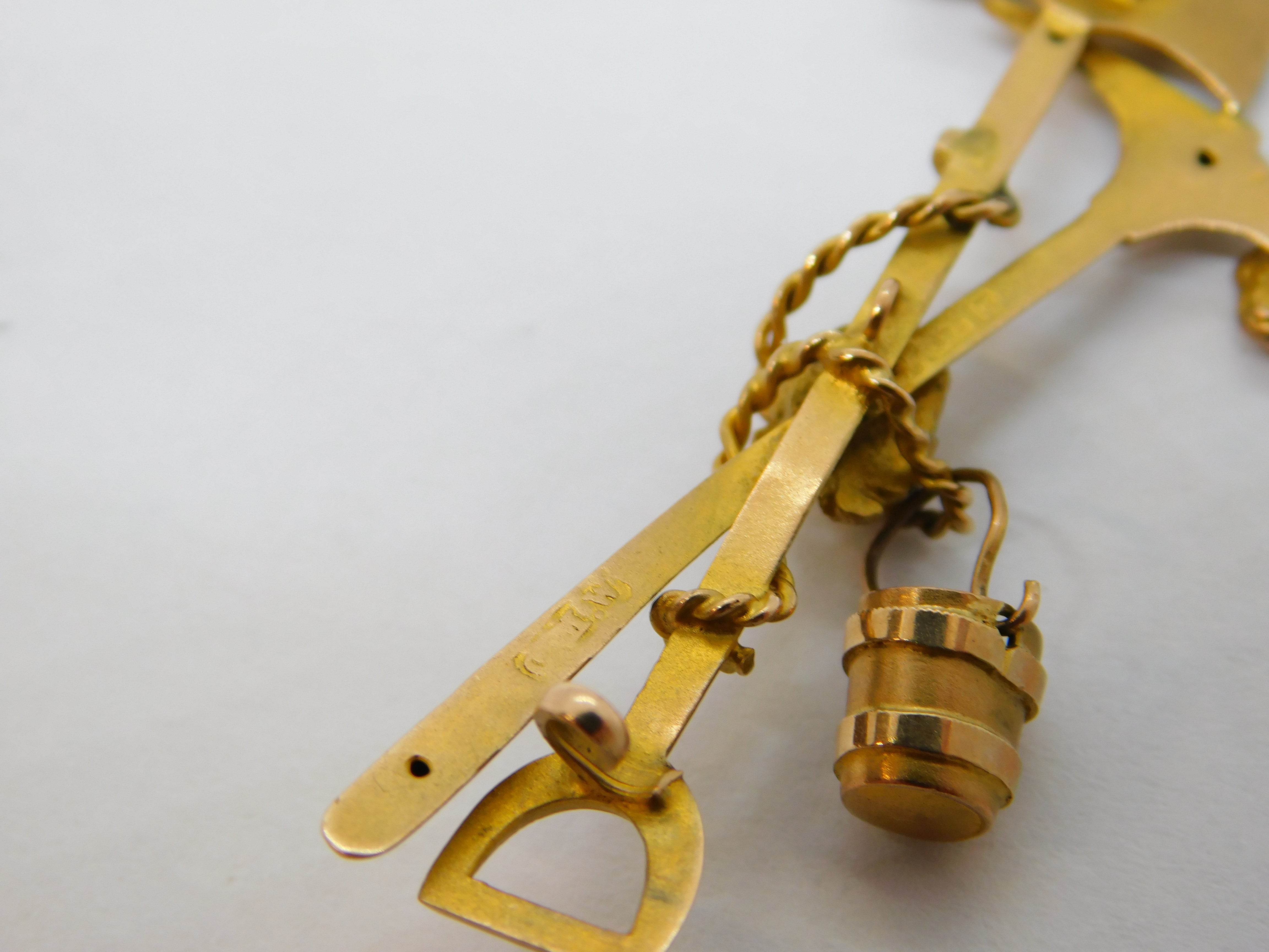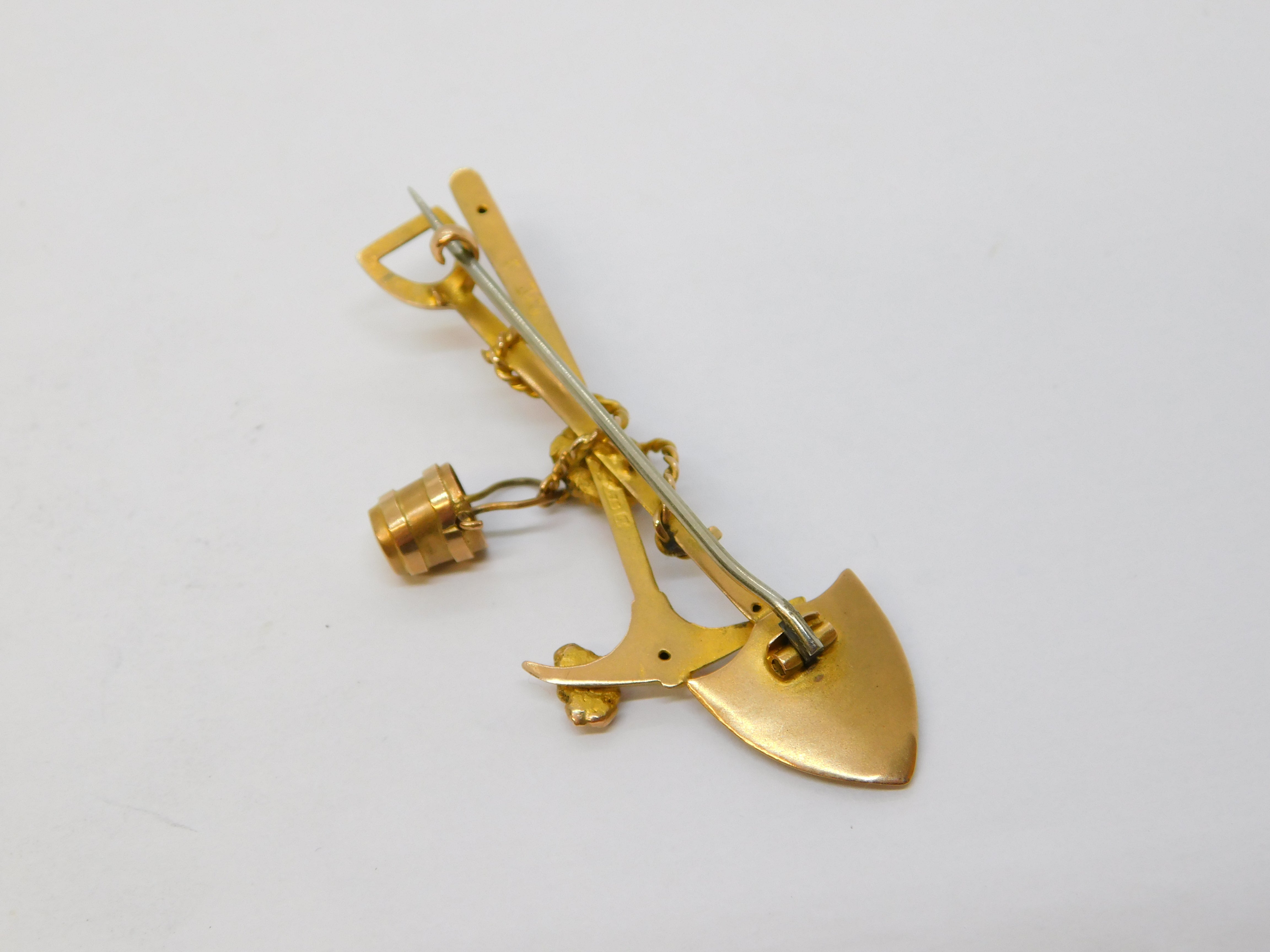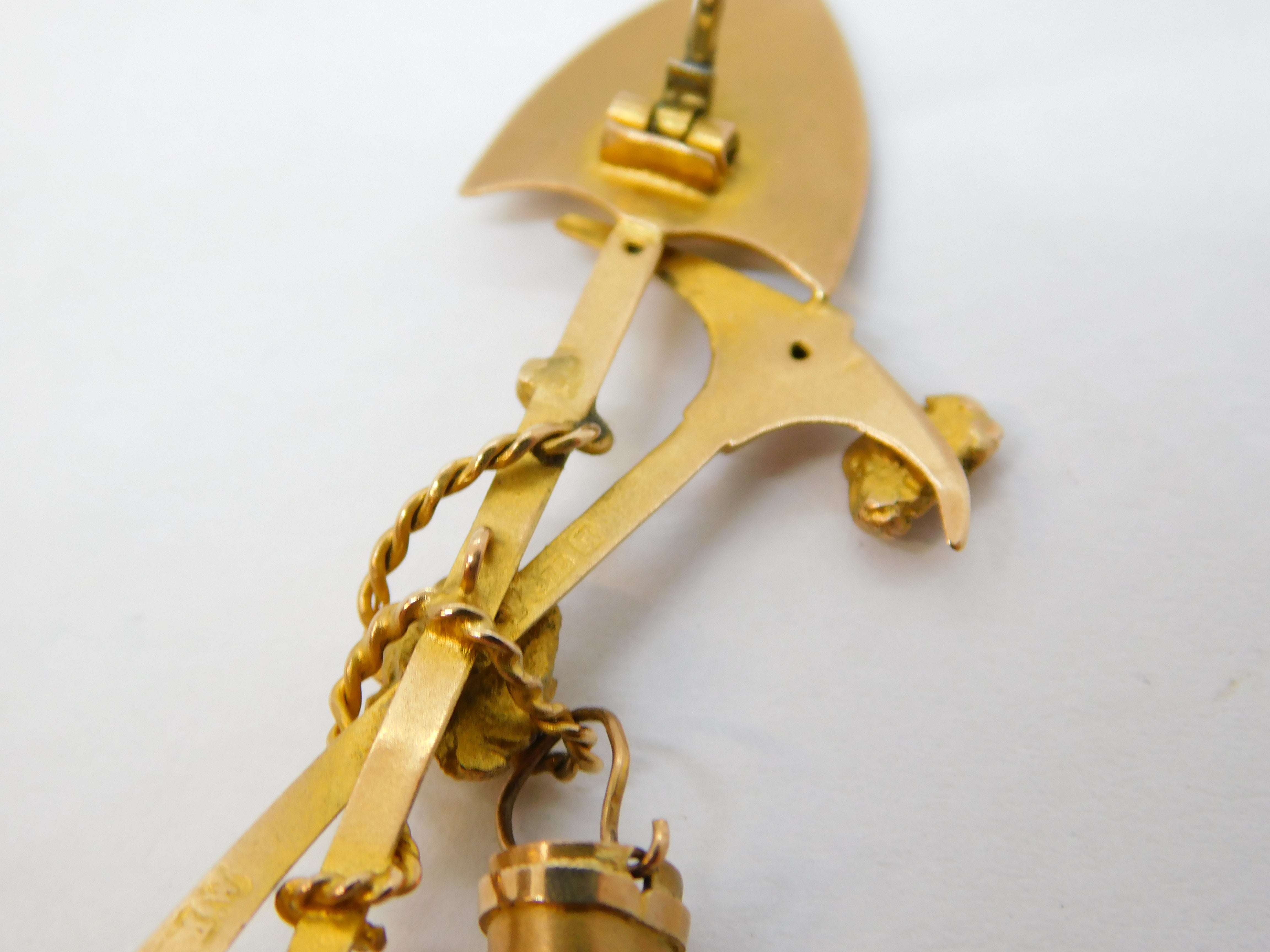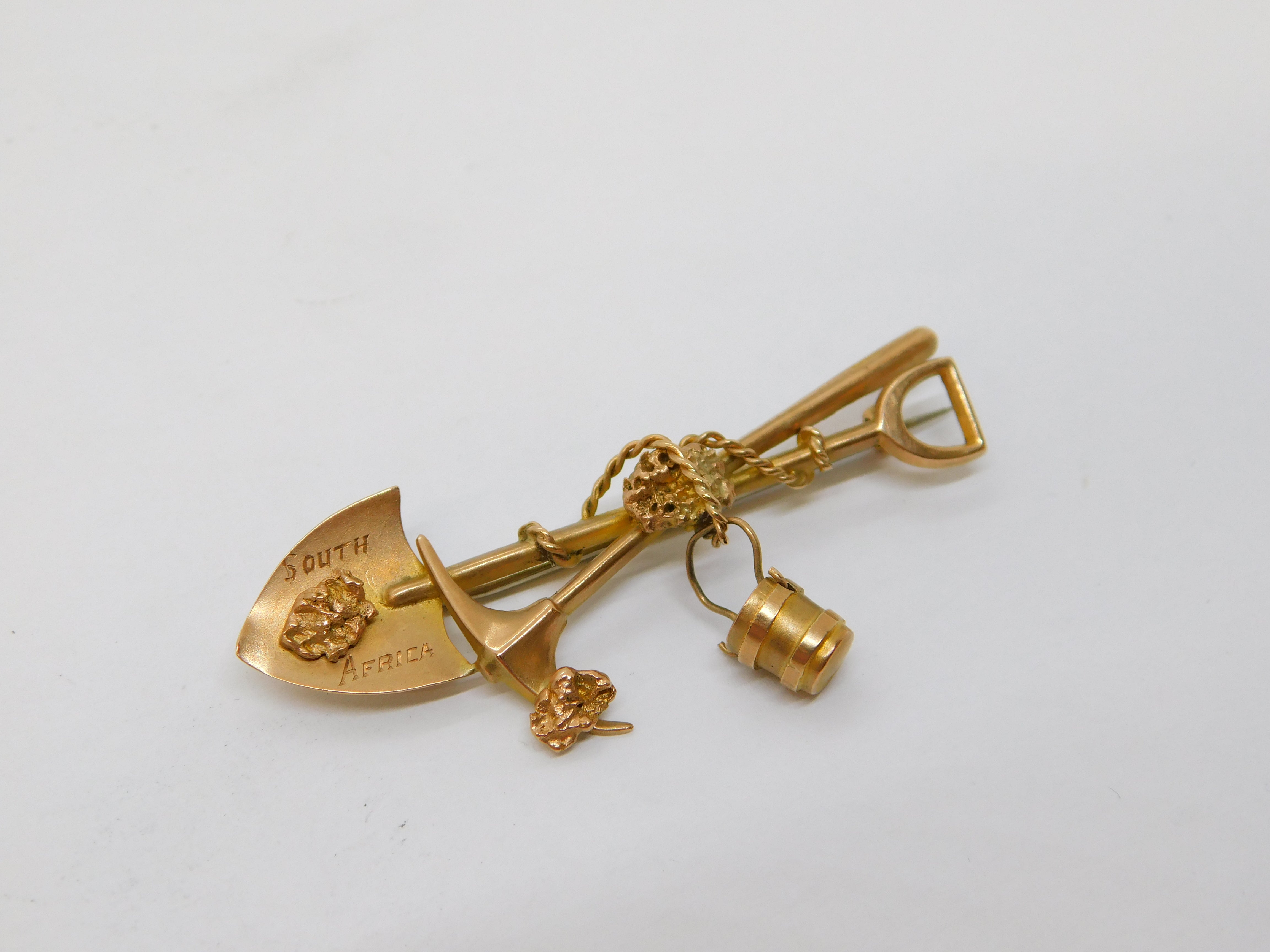 Details: A fantastic and wonderfully designed antique Victorian 9ct yellow gold South African Miner's brooch in the form of a shovel & pick with bucket and gold nugget to the central area engraved South Africa, hallmarked Birmingham 1897 to the reverse of the brooch. This is a wonderful item that would make a perfect gift or addition to any collection.