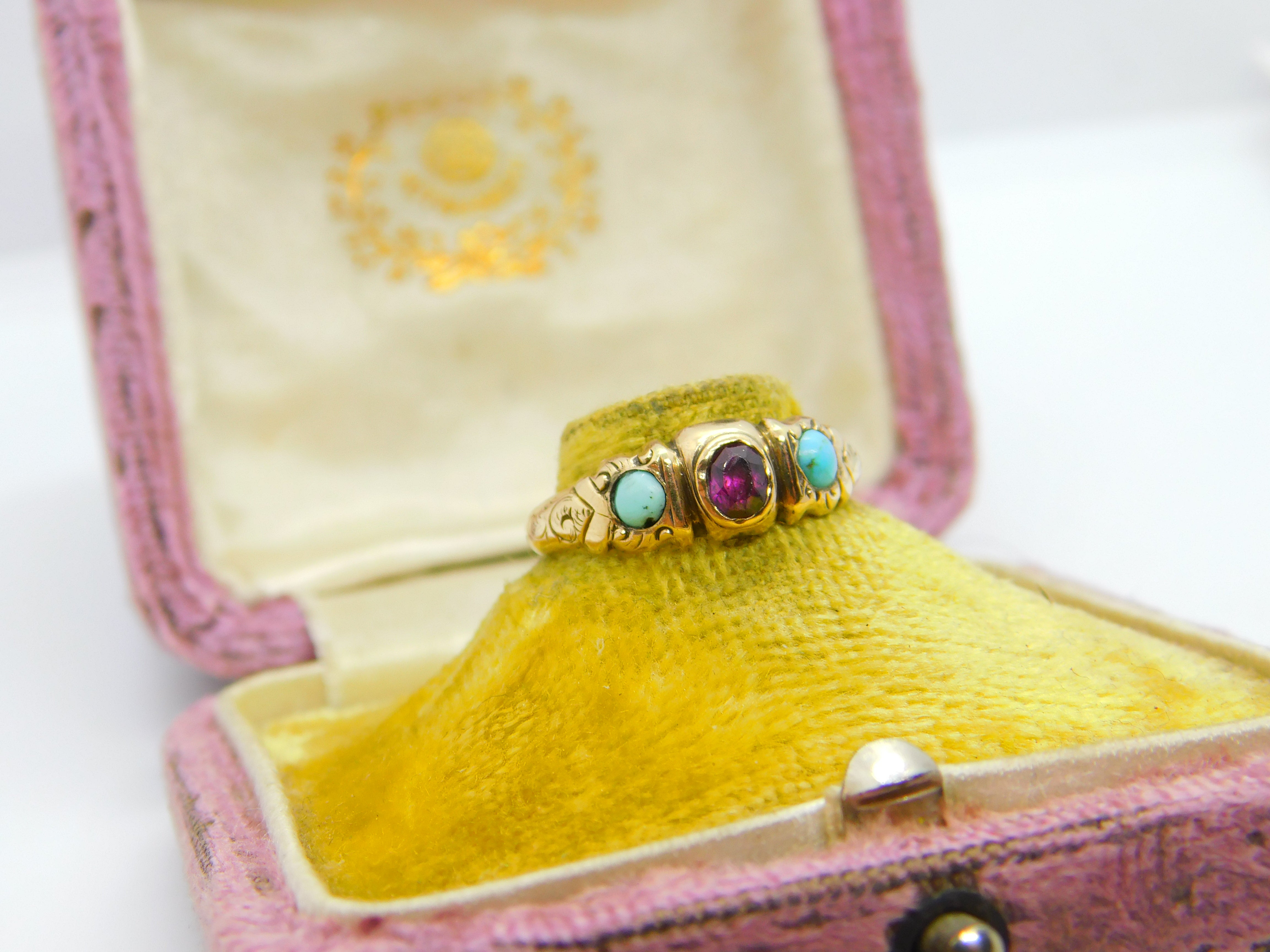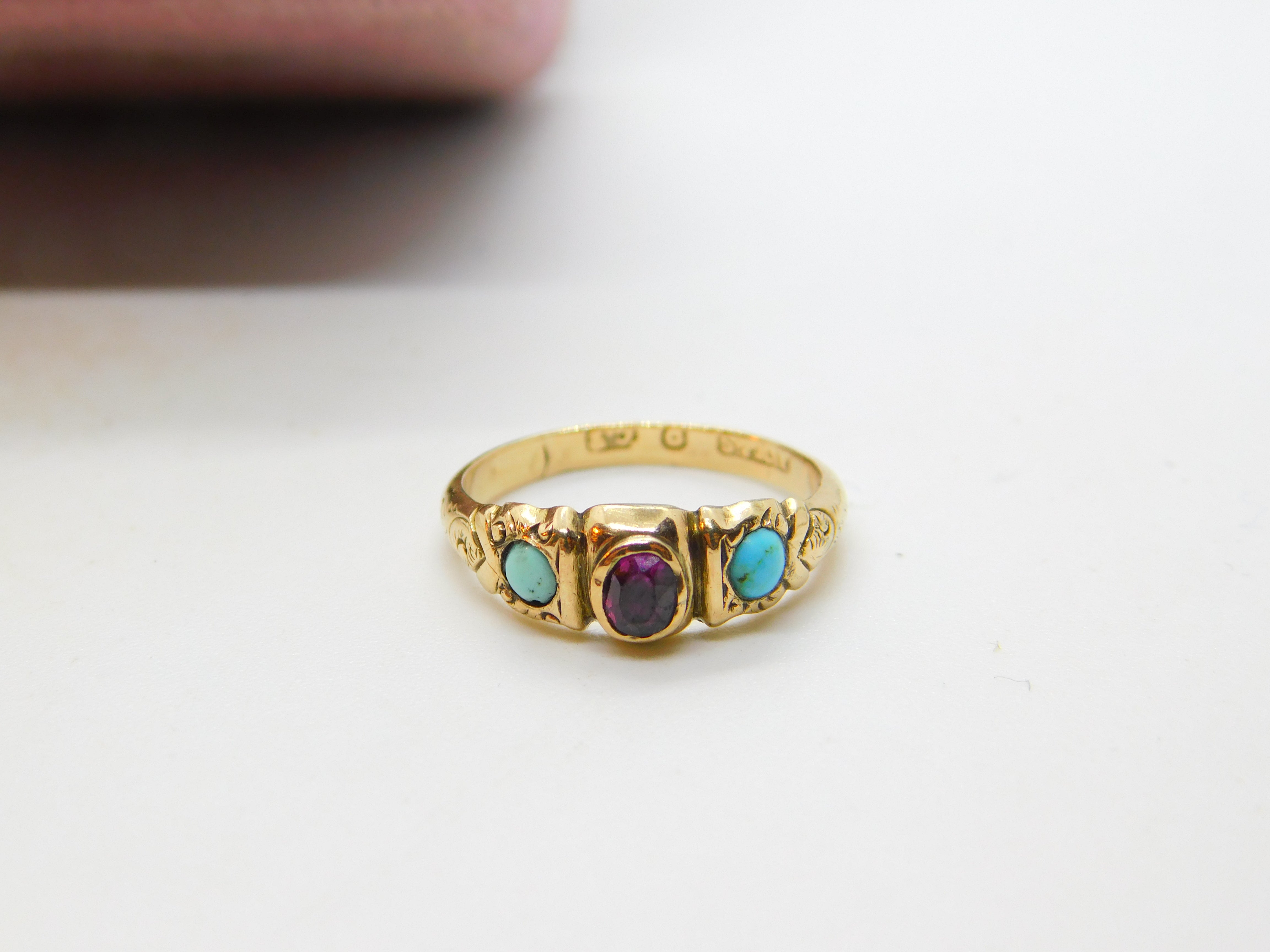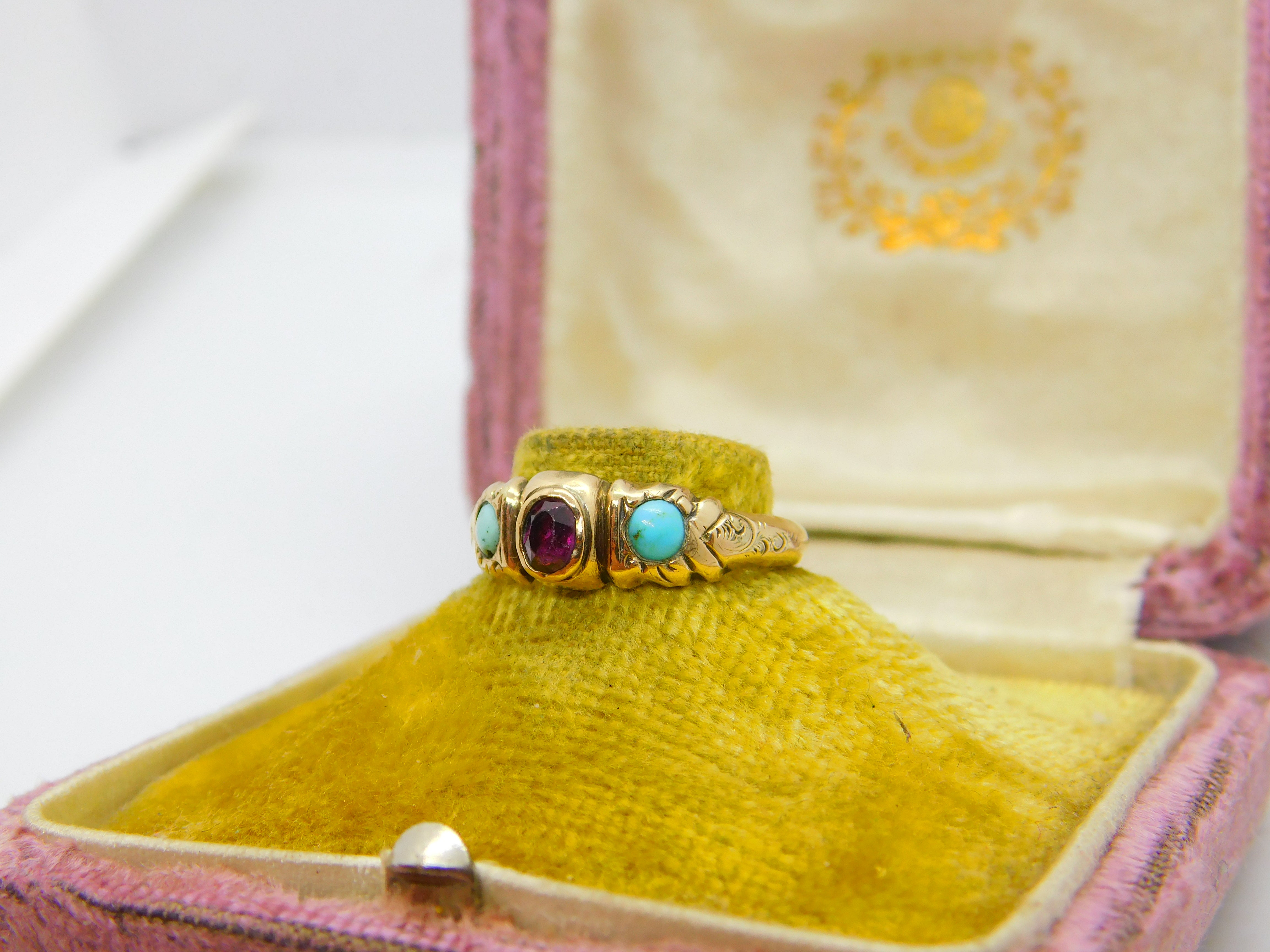 Details: A fantastic and wonderfully designed antique Victorian 9ct yellow gold band ring set with turquoise and almandine garnet hallmarked to the interior band c1880. This is a wonderful item that would make a perfect gift or addition to any collection. The BOX pictured is for PRESENTATION ONLY and is NOT included in the listings but used to frame the pictures unless specifically stated otherwise.