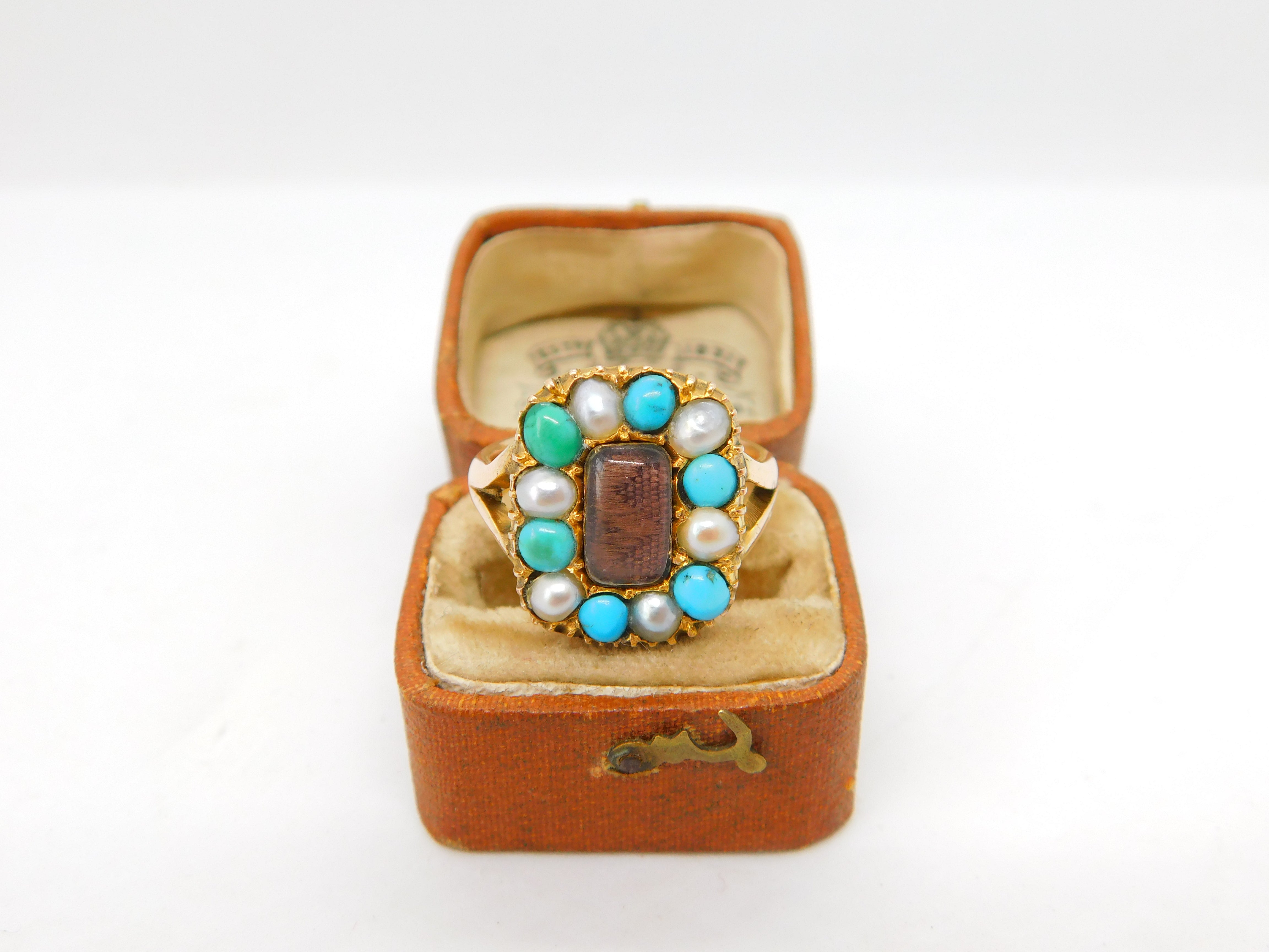 Details: A fantastic and wonderfully designed antique Victorian 9ct yellow gold mourning ring with woven hair surrounded by turquoise & pearls hallmarked 9ct to the interior c1840. This is a wonderful item that would make a perfect gift or addition to any collection. The BOX pictured is for PRESENTATION ONLY and is NOT included in the listings but used to frame the pictures unless specifically stated otherwise.