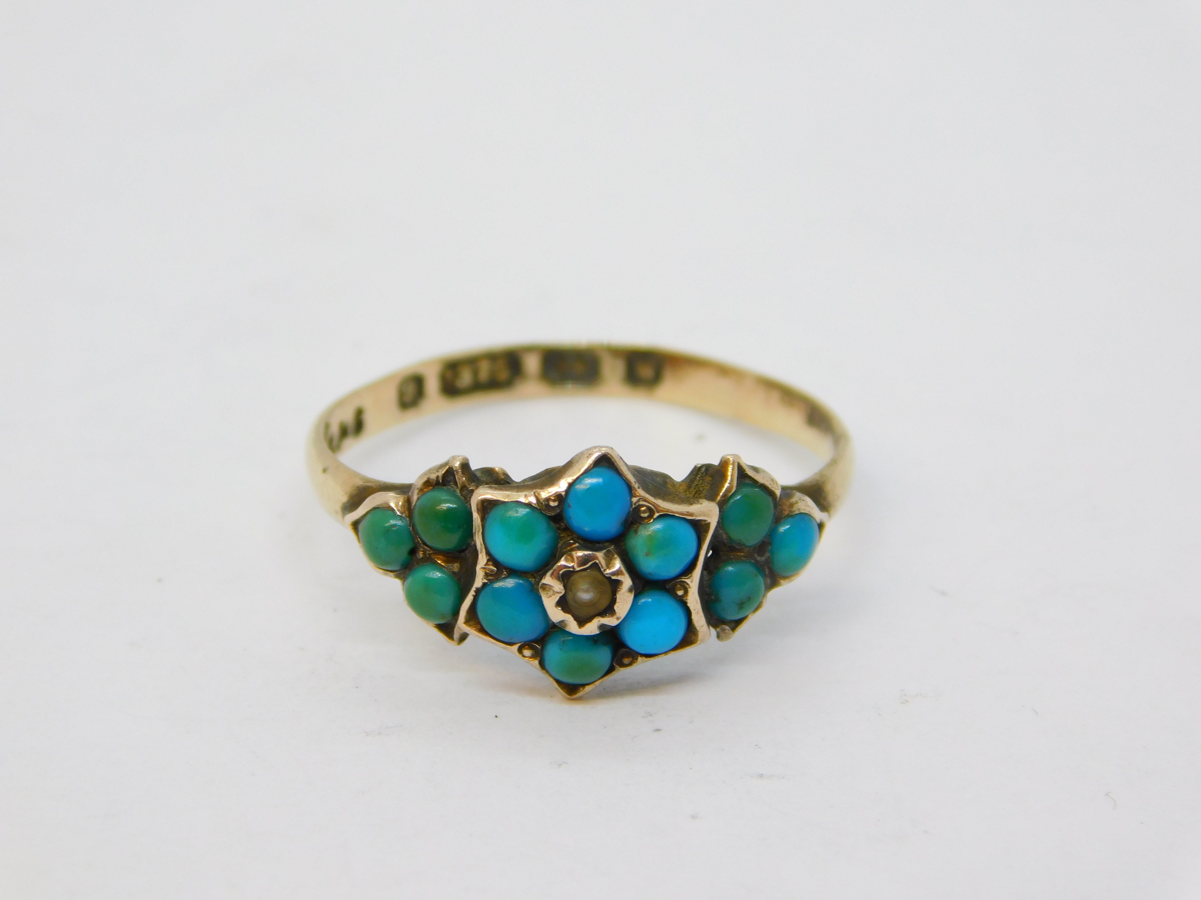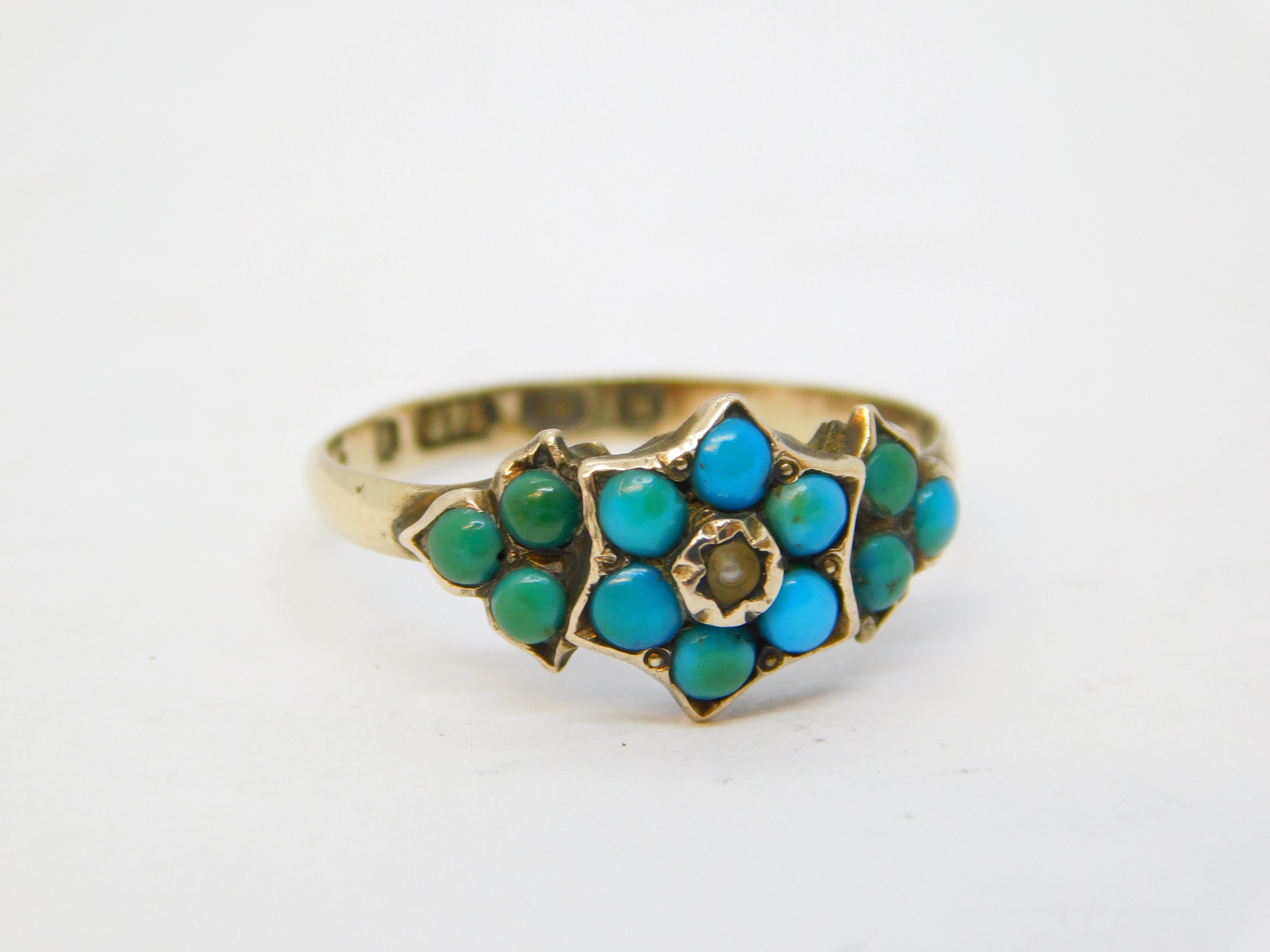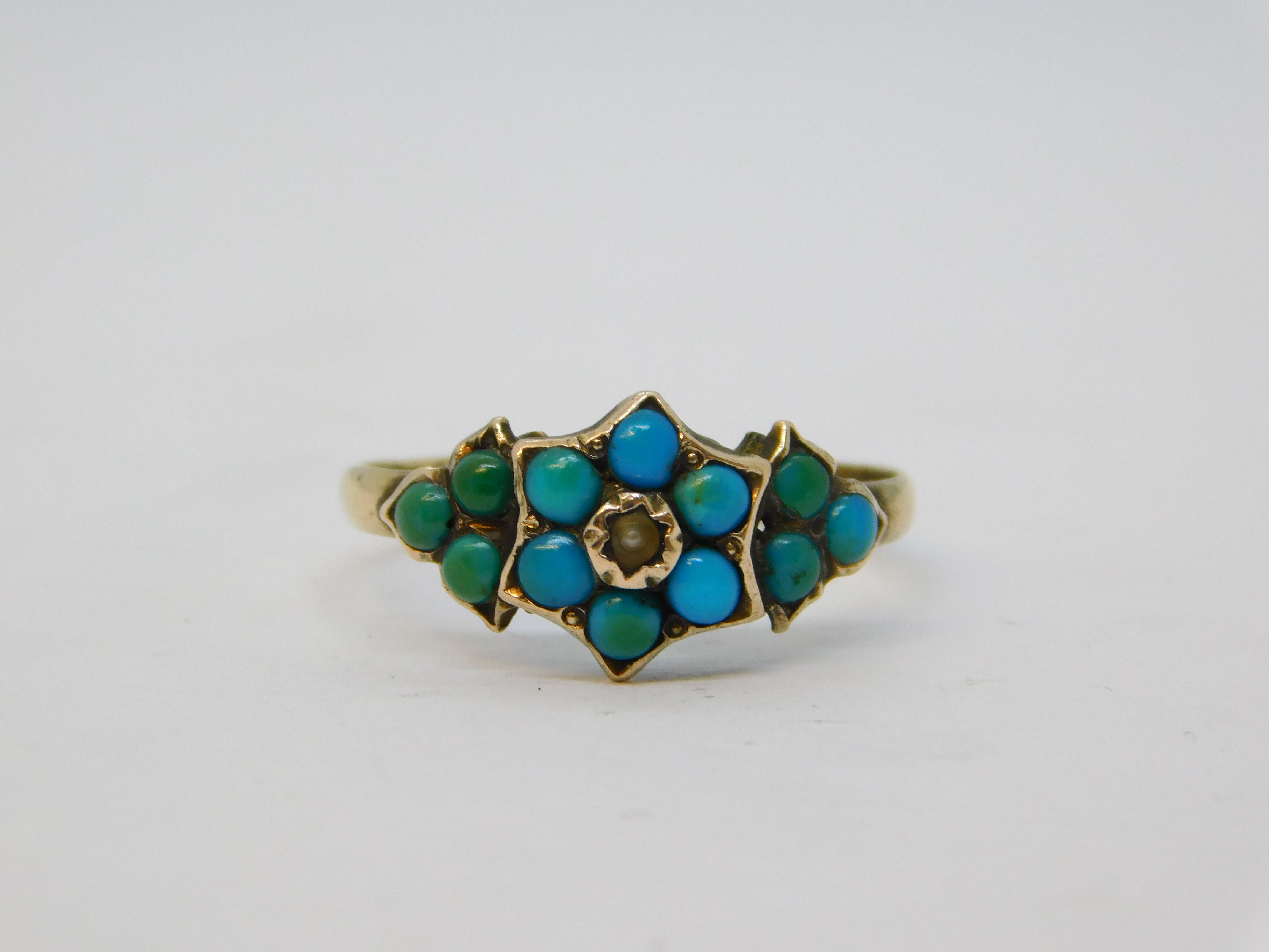 Victorian 9ct Gold, Turquoise, Seed Pearl Floral Ring Antique 1871 Birmingham