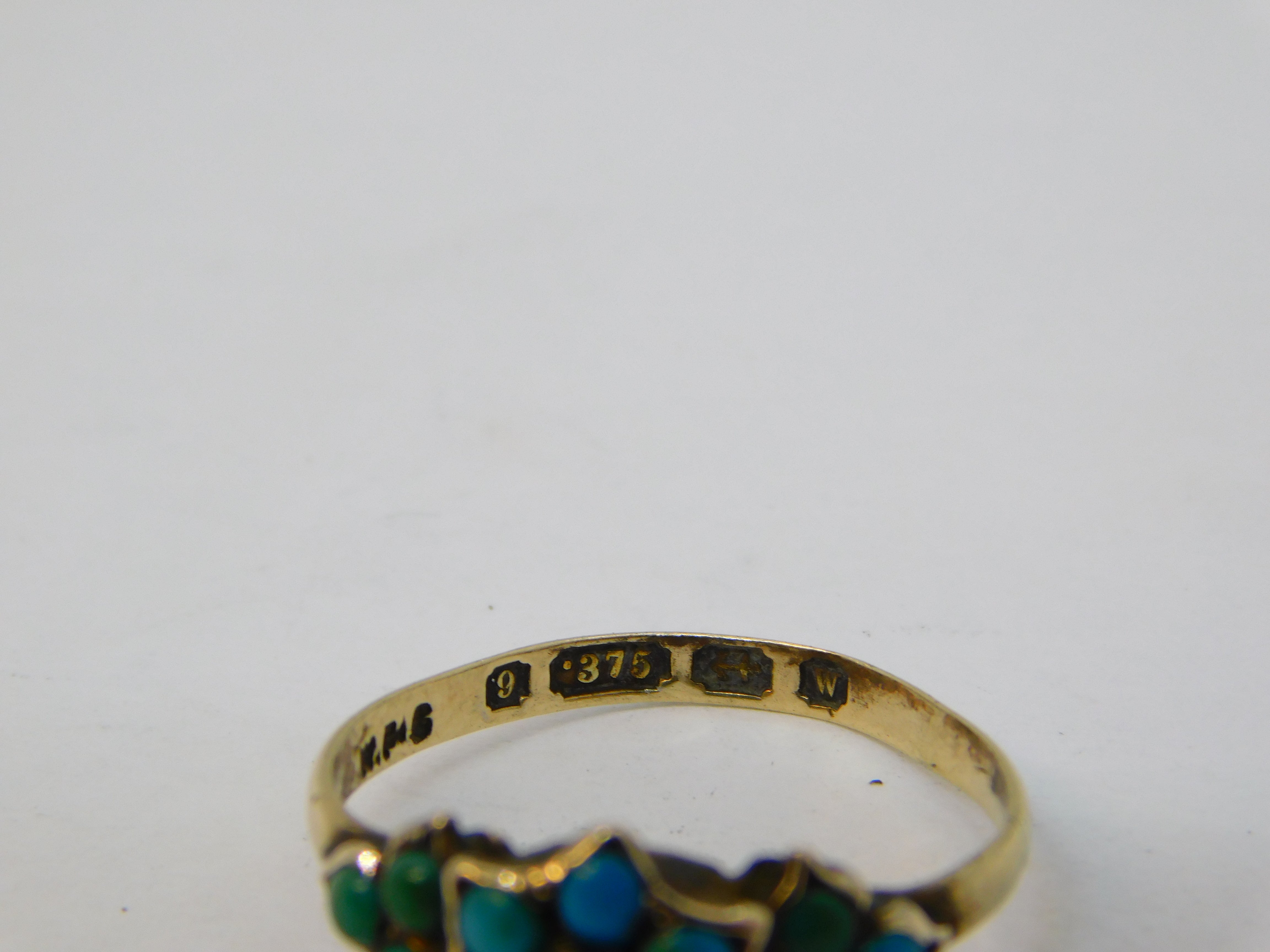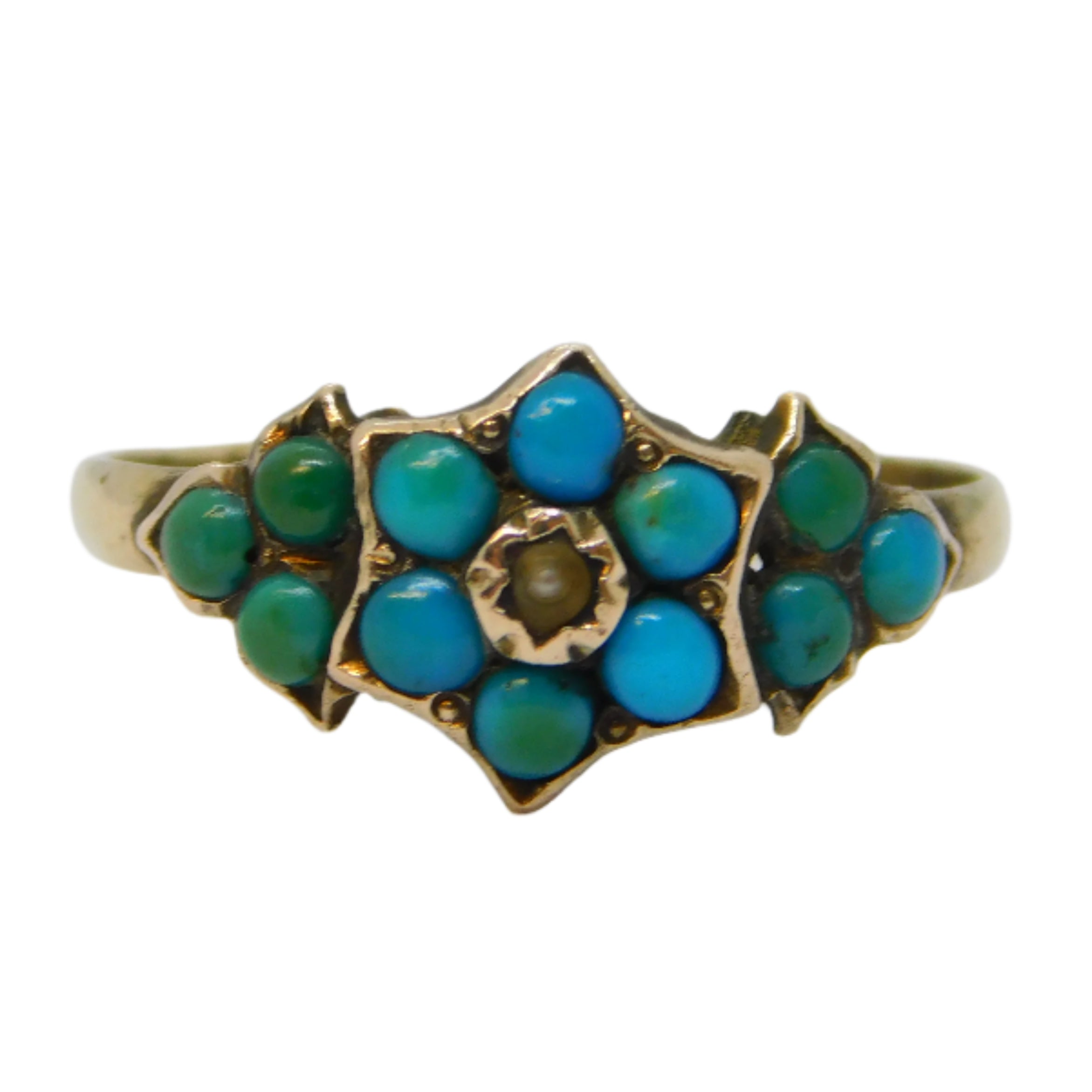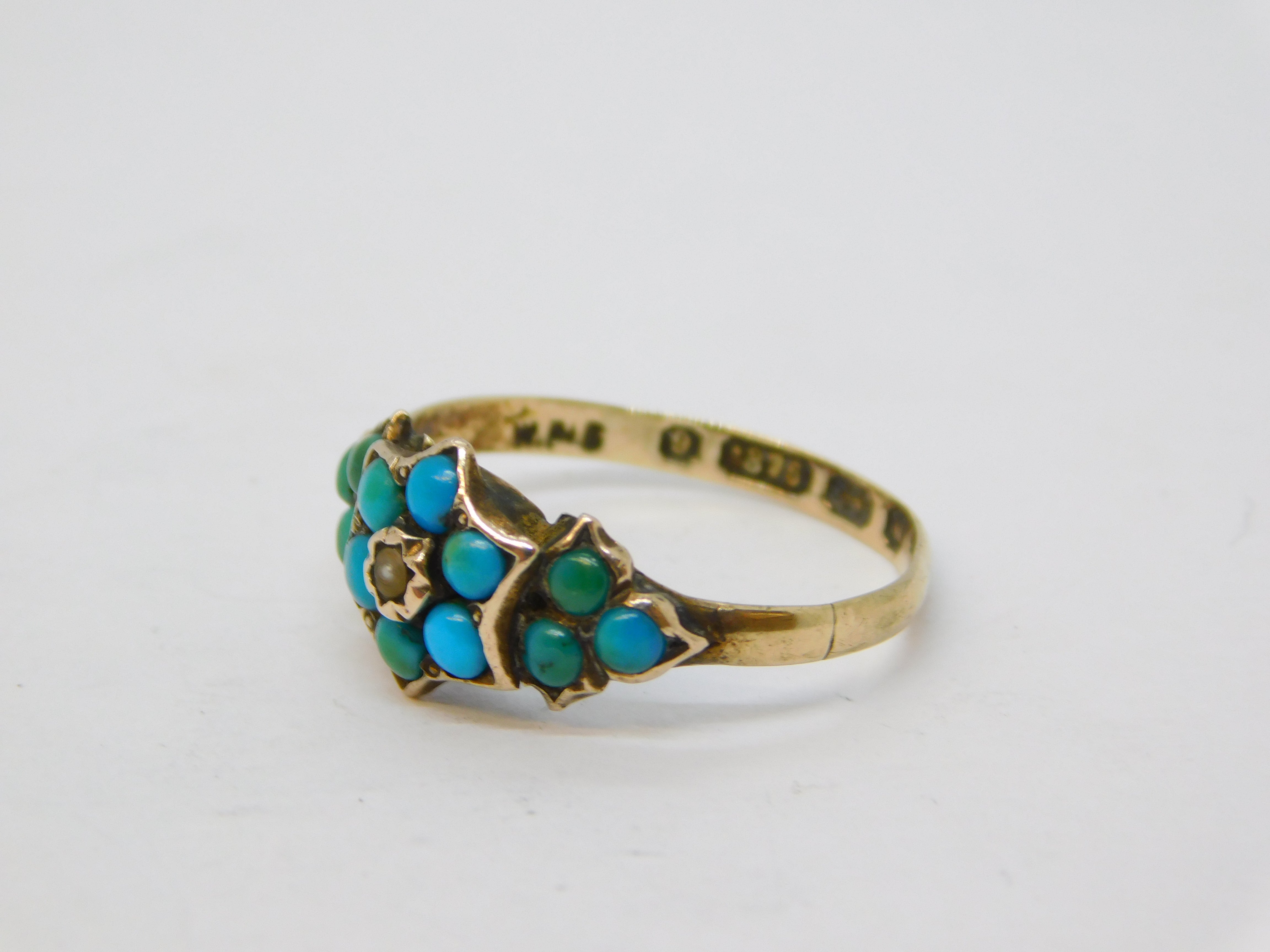Victorian 9ct Gold, Turquoise, Seed Pearl Floral Ring Antique 1871 Birmingham