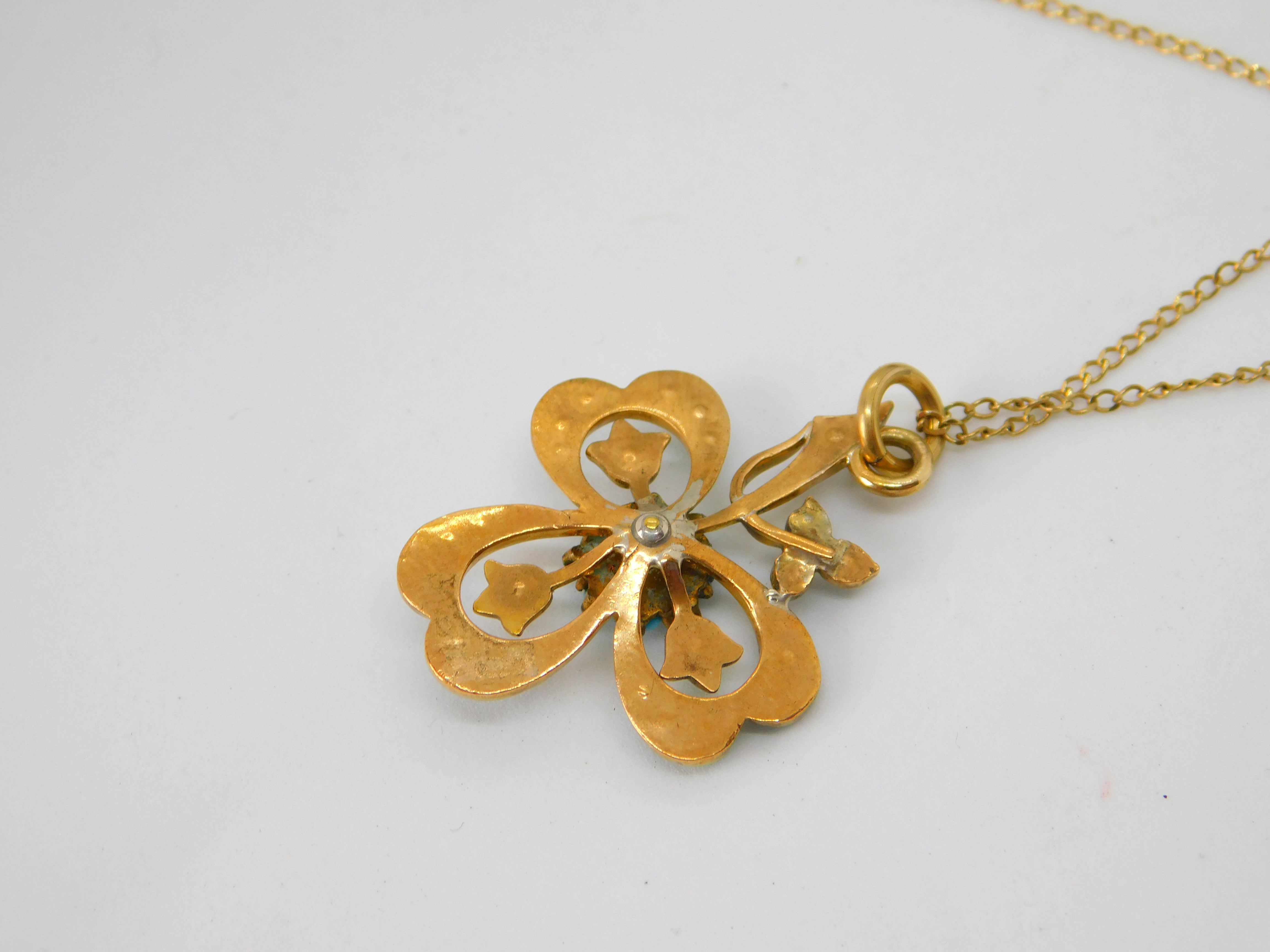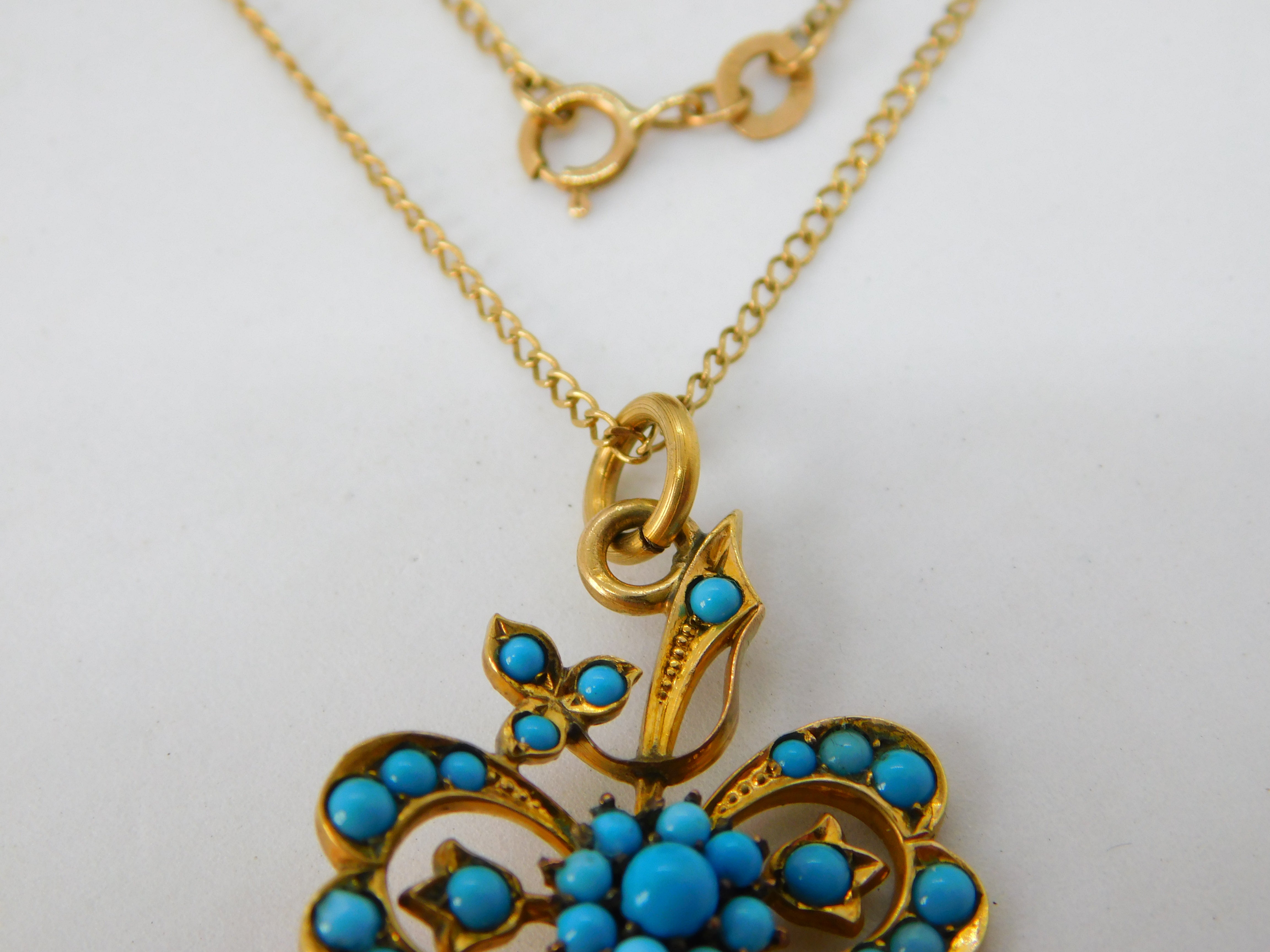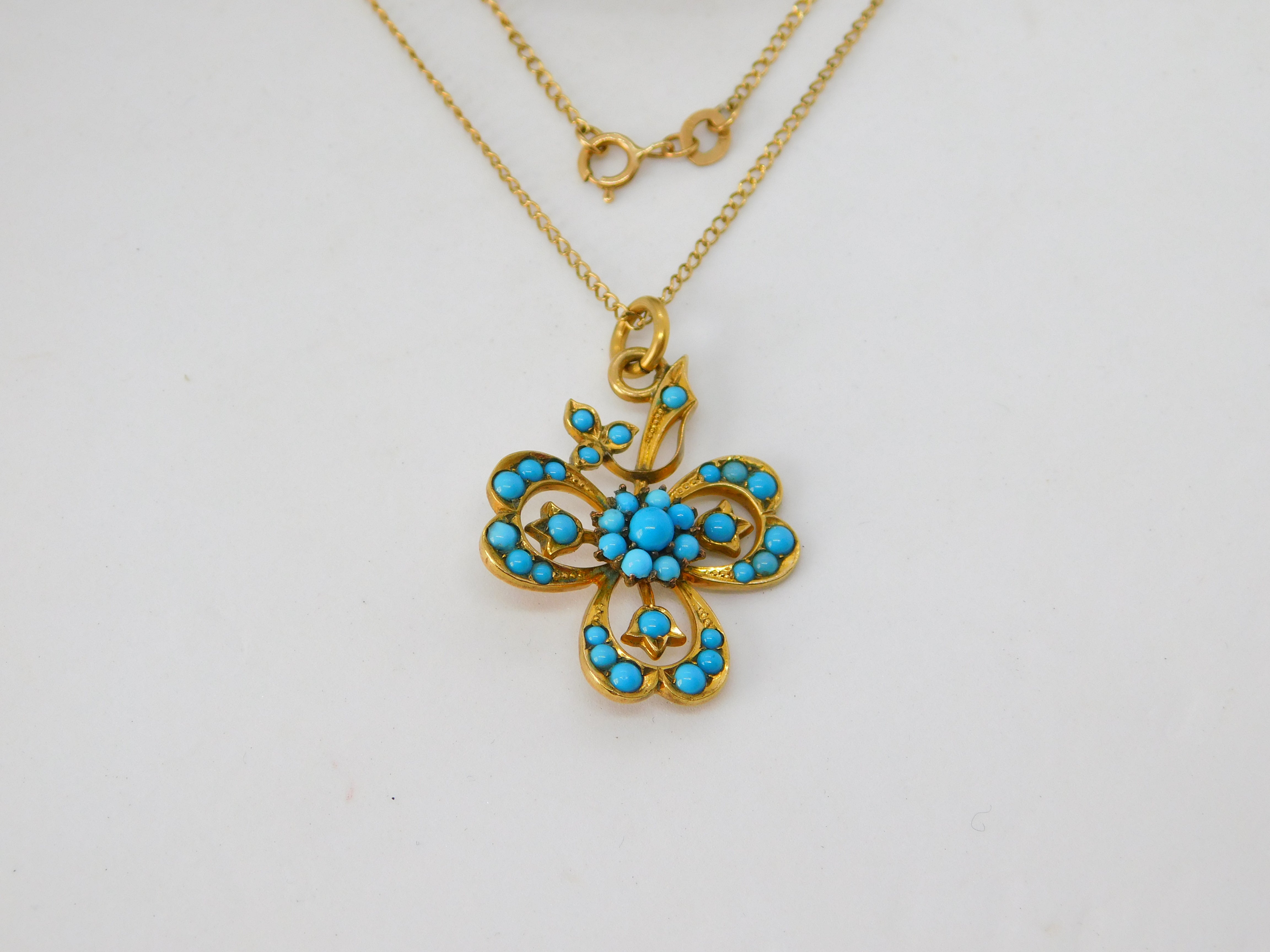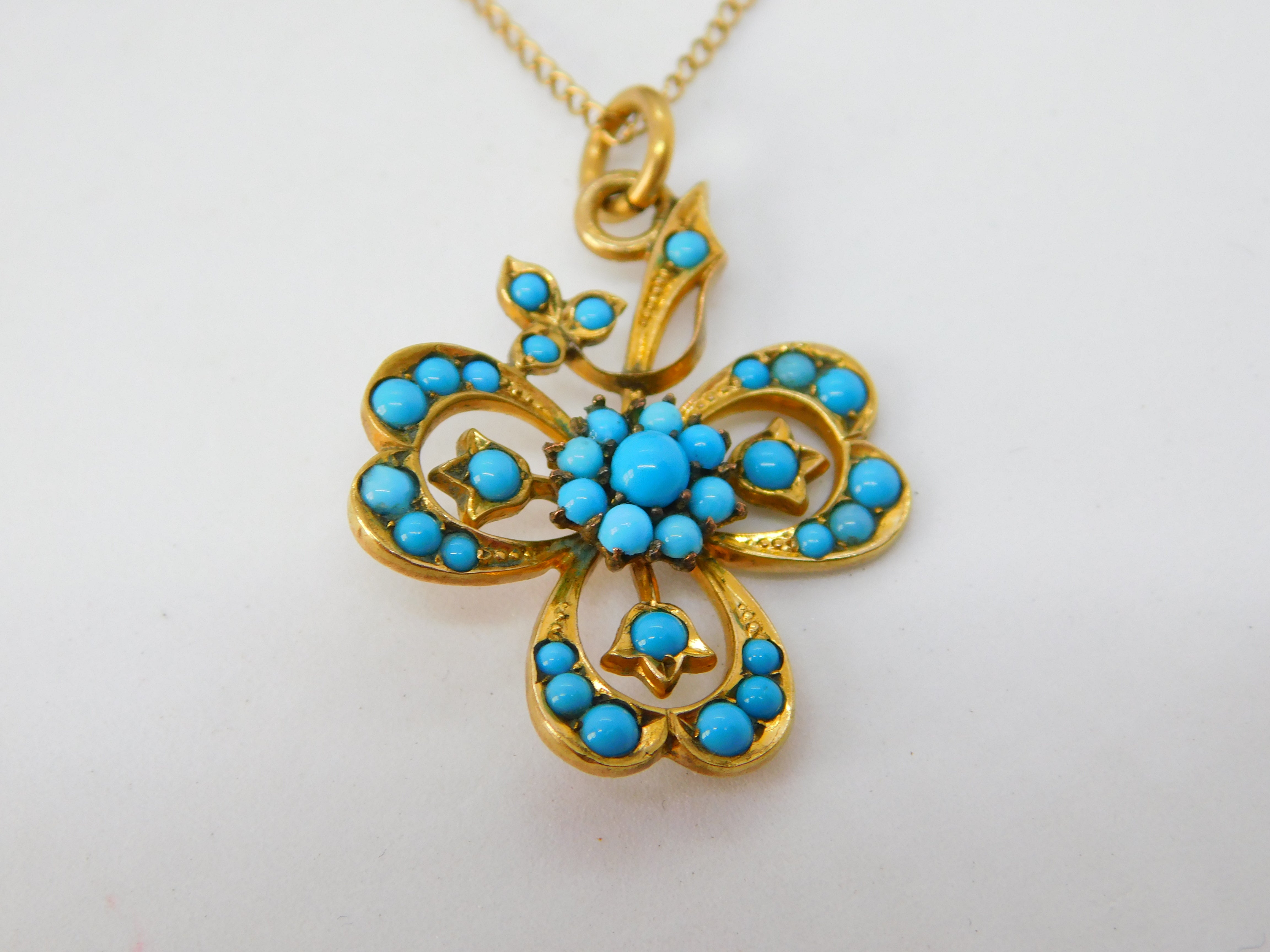 Victorian 9ct Gold Turquoise Set Lucky Shamrock Drop Necklace c1880 Antique
