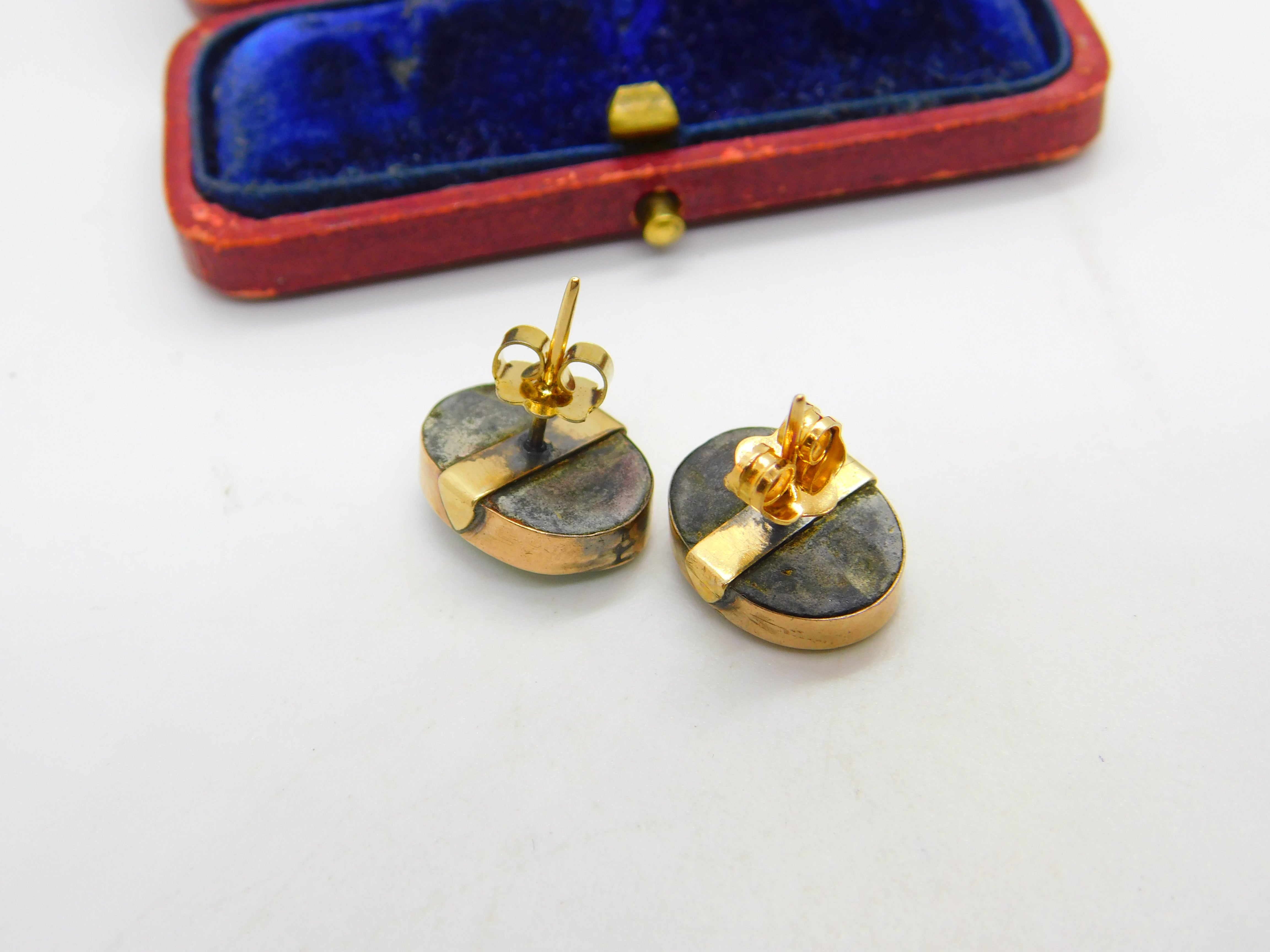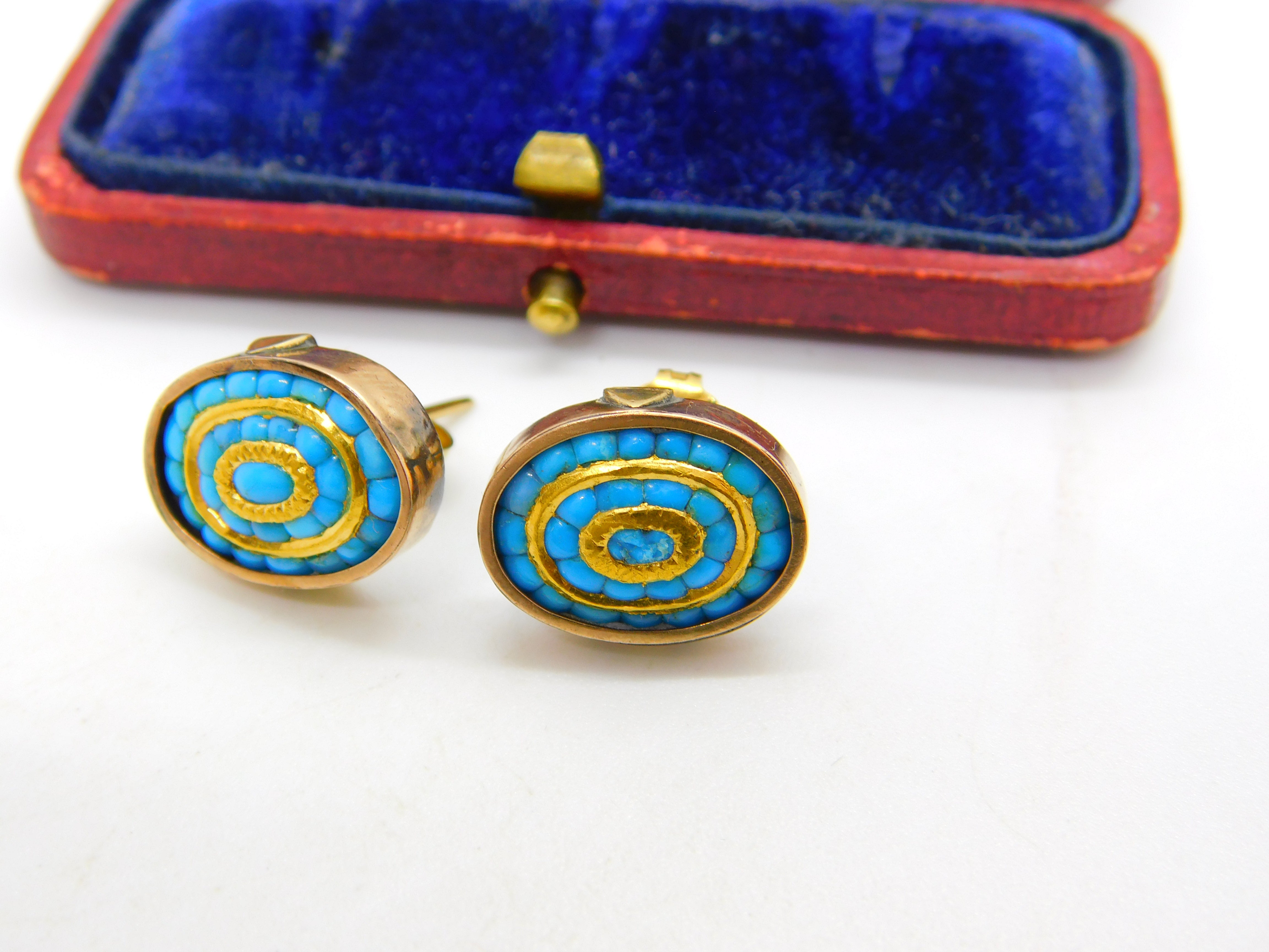 Details: A fantastic and wonderfully designed antique Victorian pair of 9ct rose gold mounted stud earrings, the earrings set throughout with blue turquoise with layers of 24ct yellow gold interspersed. The gold has been XRF tested, dates c1880. Slight bend to one of the back studs. This is a wonderful item that would make a perfect gift or addition to any collection. The BOX pictured is for PRESENTATION ONLY and is NOT included in the listings but used to frame the pictures unless specifically stated otherwise.