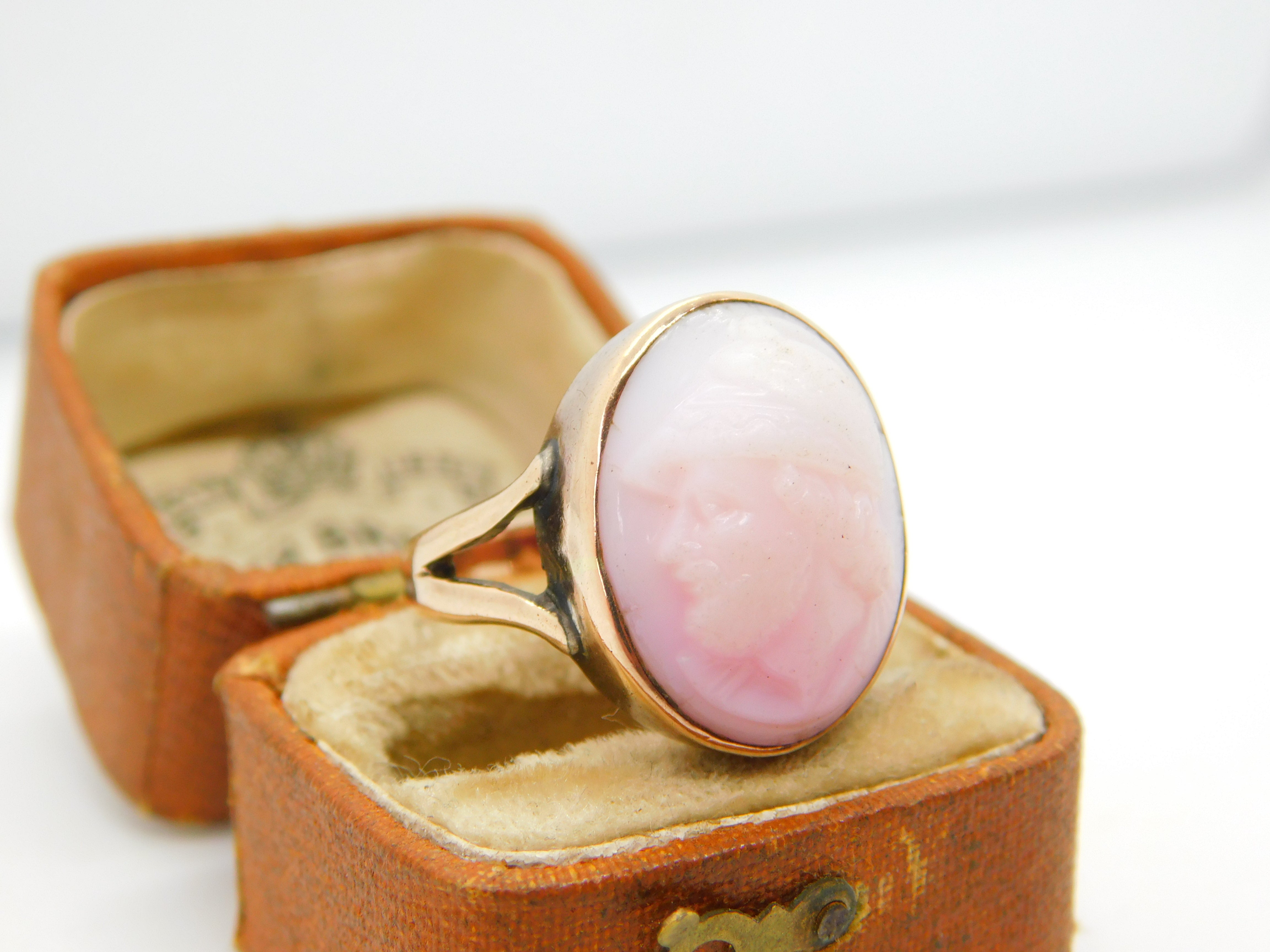Details: A fantastic and wonderfully designed antique Victorian 9ct rose gold signet ring set with classical cameo depicting a greek or roman god carved from angel skin coral hallmarked to the interior c1880. This is a wonderful item that would make a perfect gift or addition to any collection. The BOX pictured is for PRESENTATION ONLY and is NOT included in the listings but used to frame the pictures unless specifically stated otherwise.