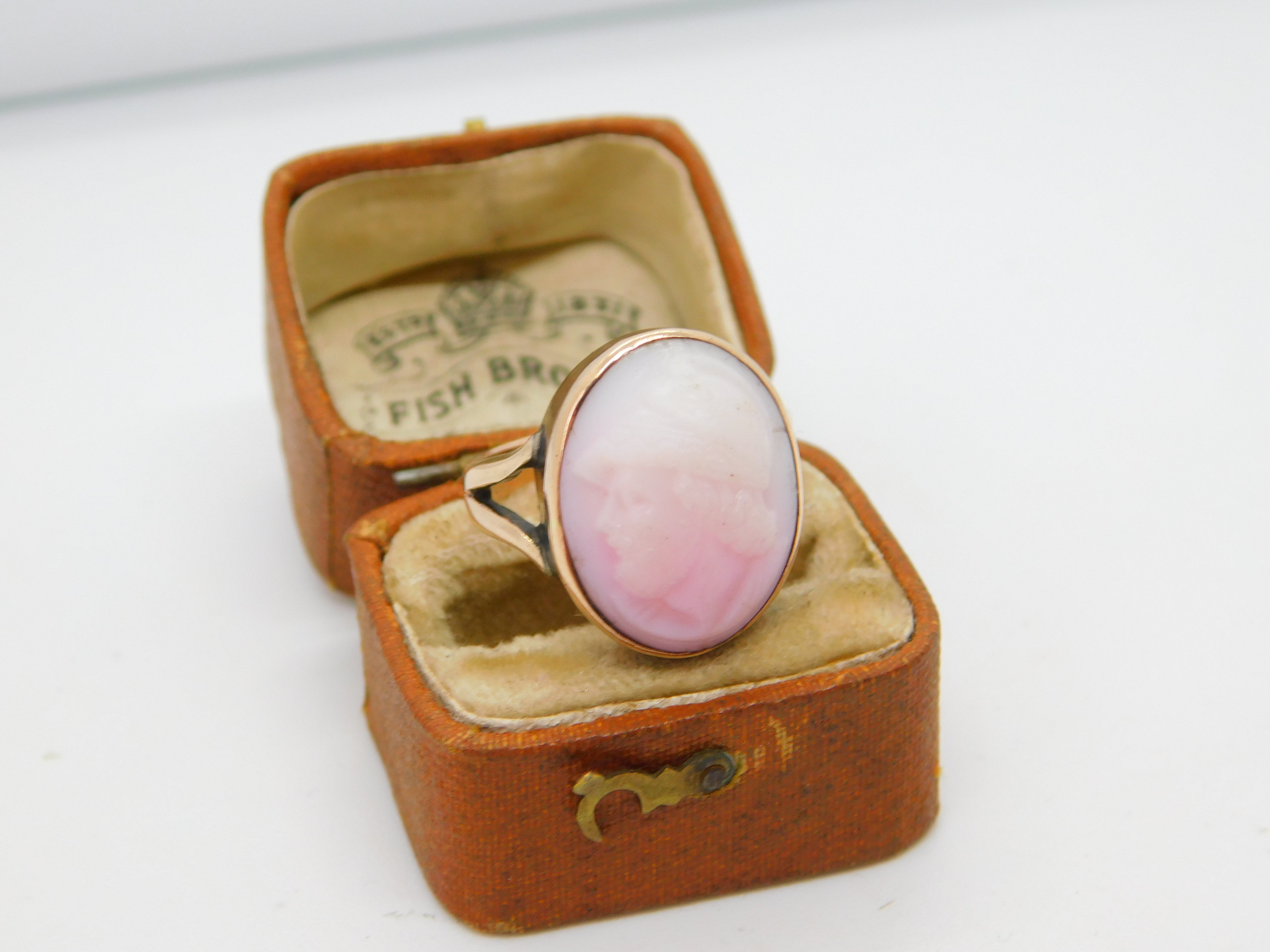 Victorian 9ct Rose Gold Angel Skin Coral Classical Cameo Signet Ring c1880