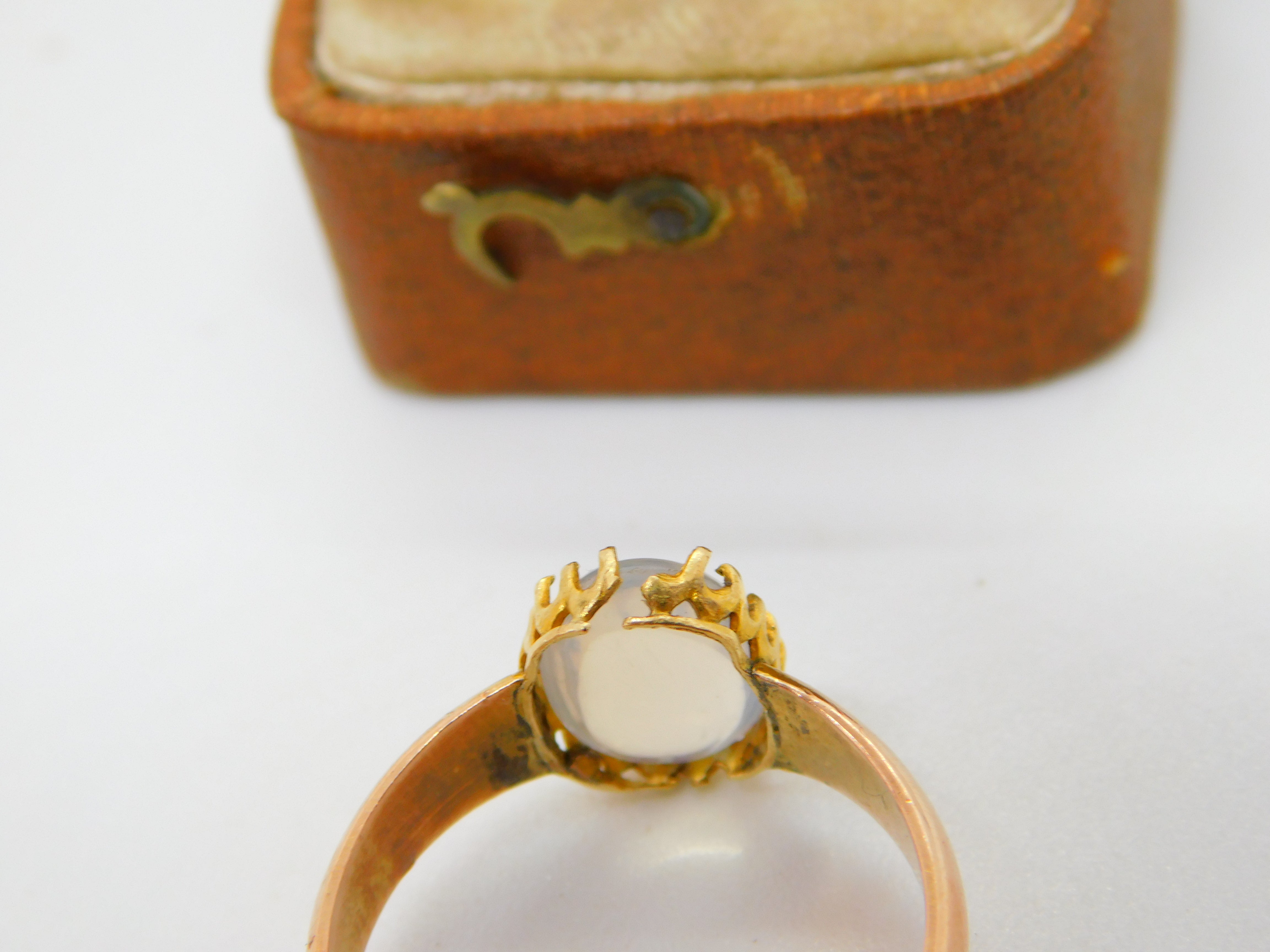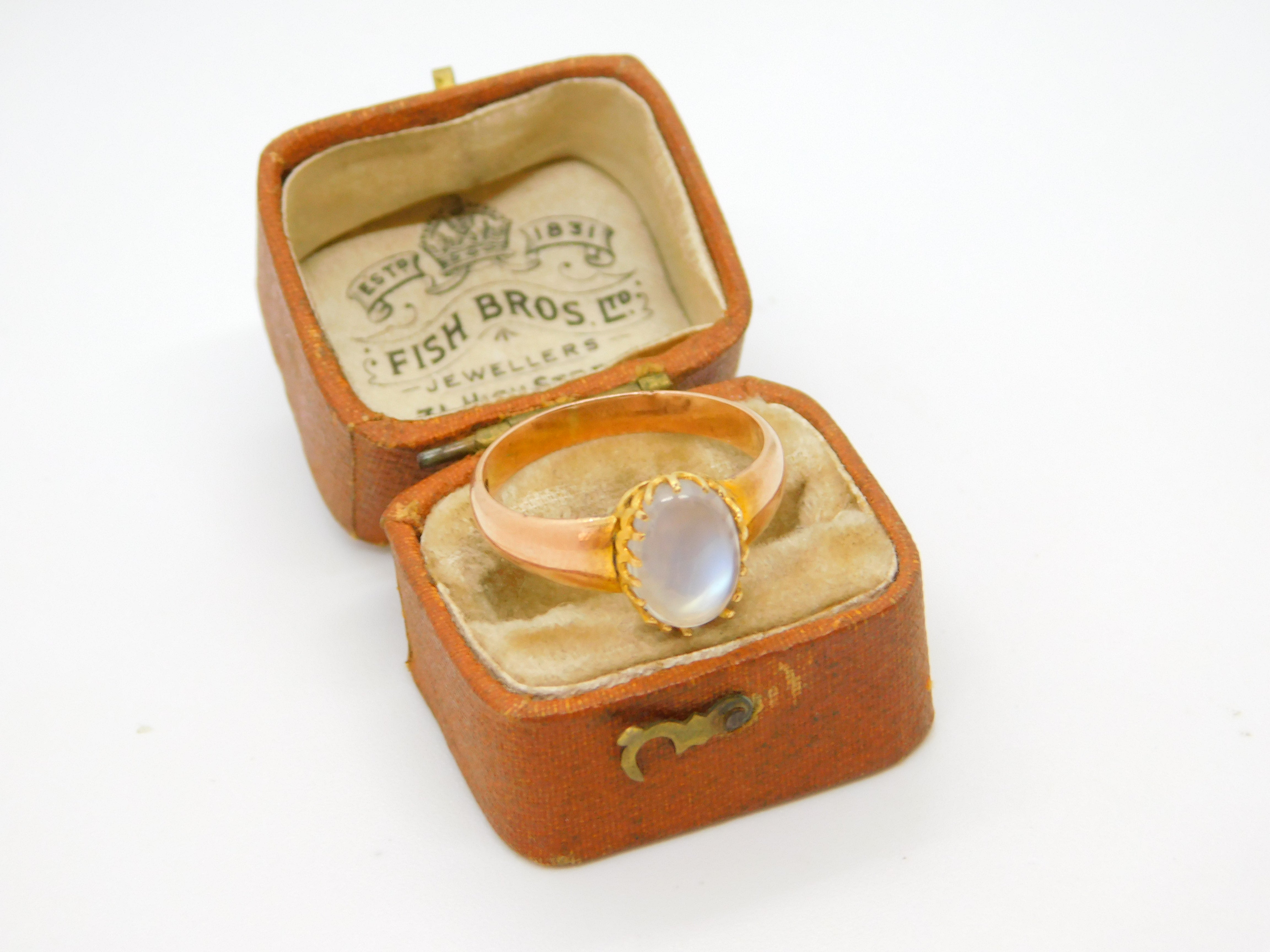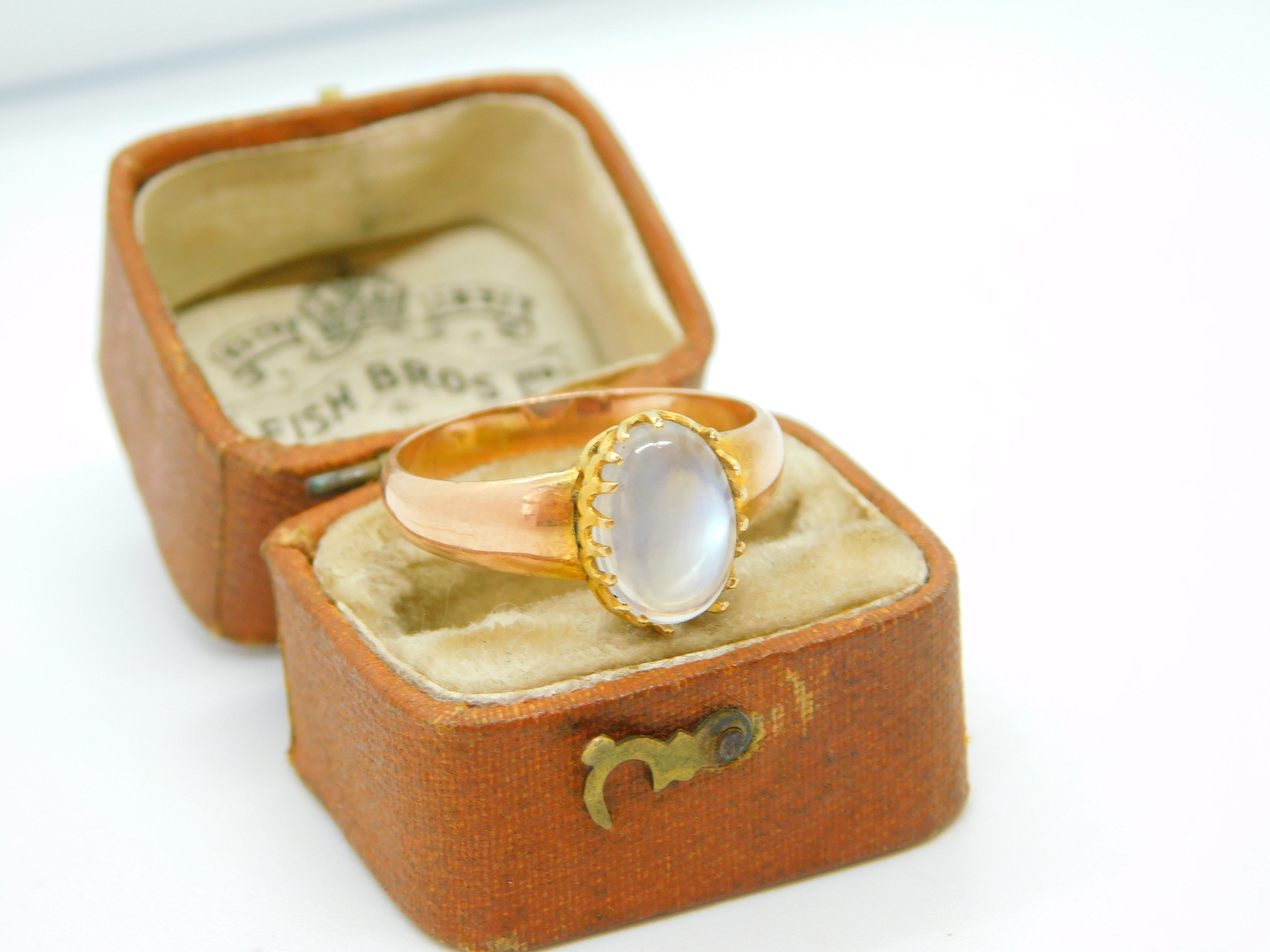 Details: A fantastic and wonderfully designed antique Victorian 9ct rose gold dress ring set with central cabochon cut moonstone hallmarked to the interior band c1860, please note the claws holding the moonstone have a split although this could be repaired. This is a wonderful item that would make a perfect gift or addition to any collection. The BOX pictured is for PRESENTATION ONLY and is NOT included in the listings but used to frame the pictures unless specifically stated otherwise.