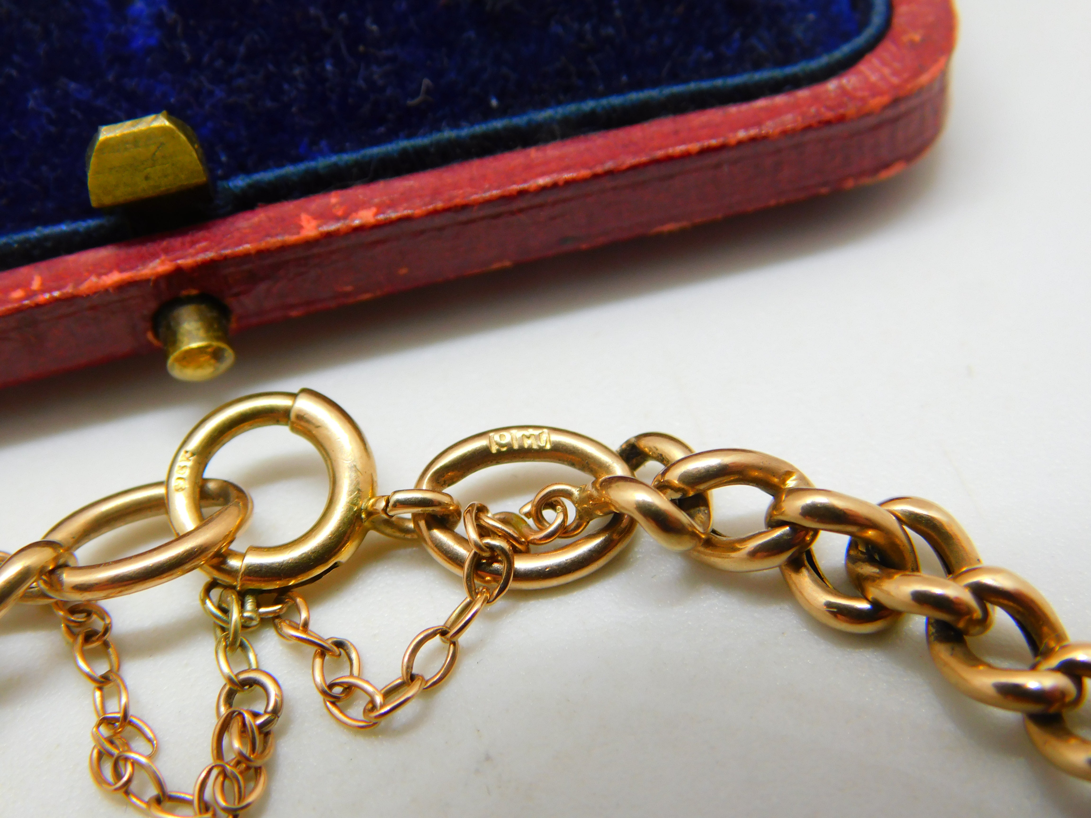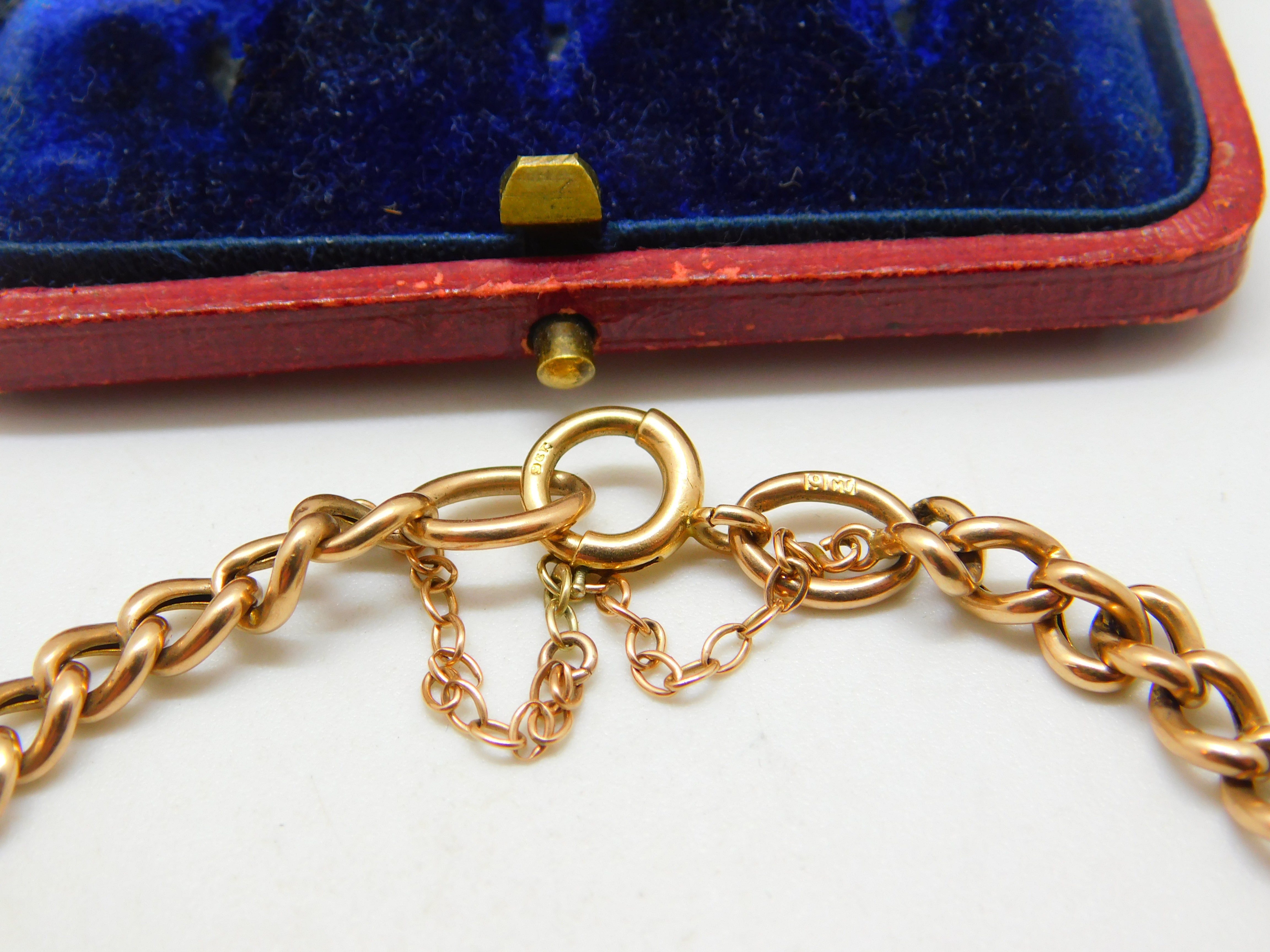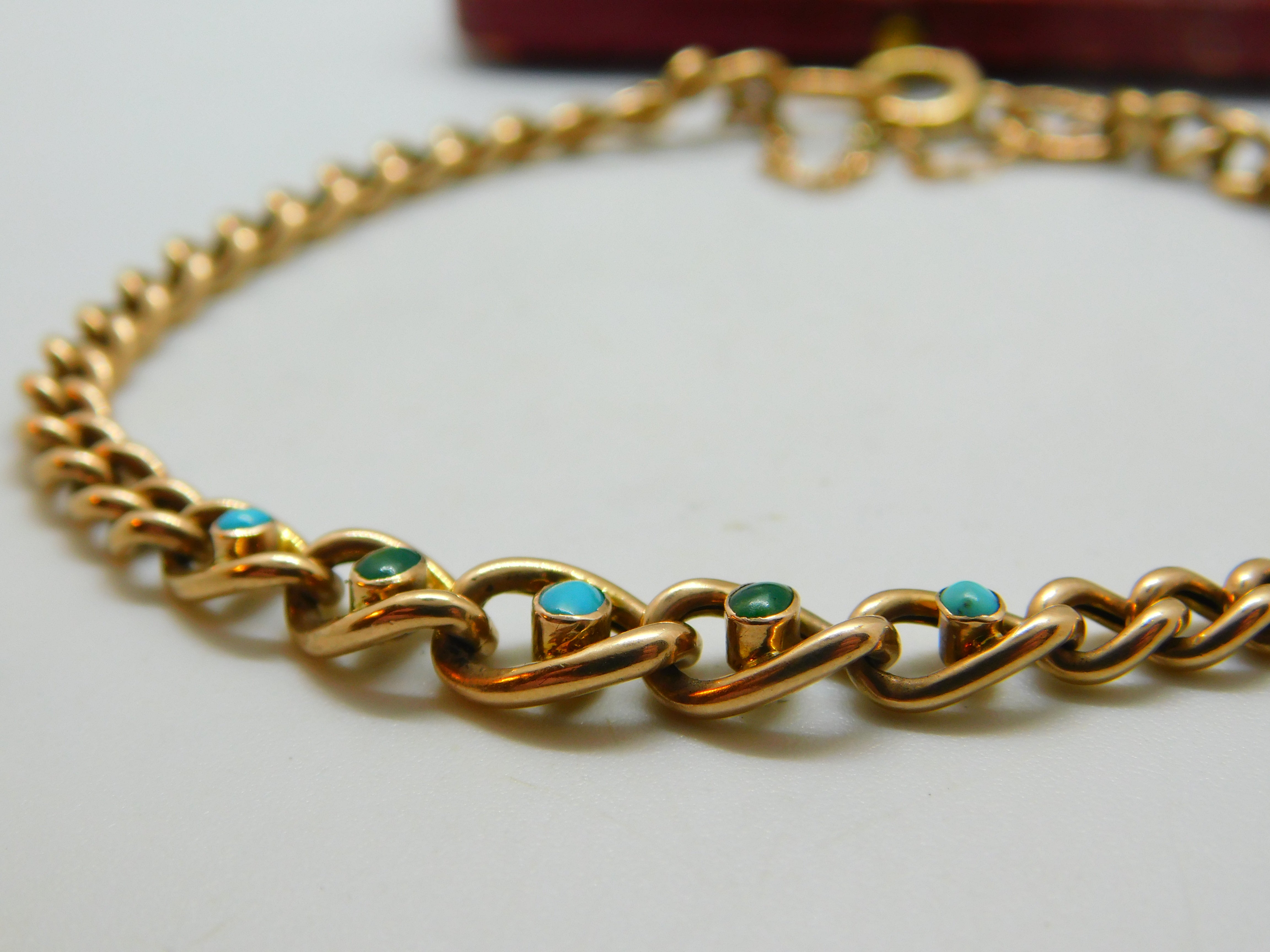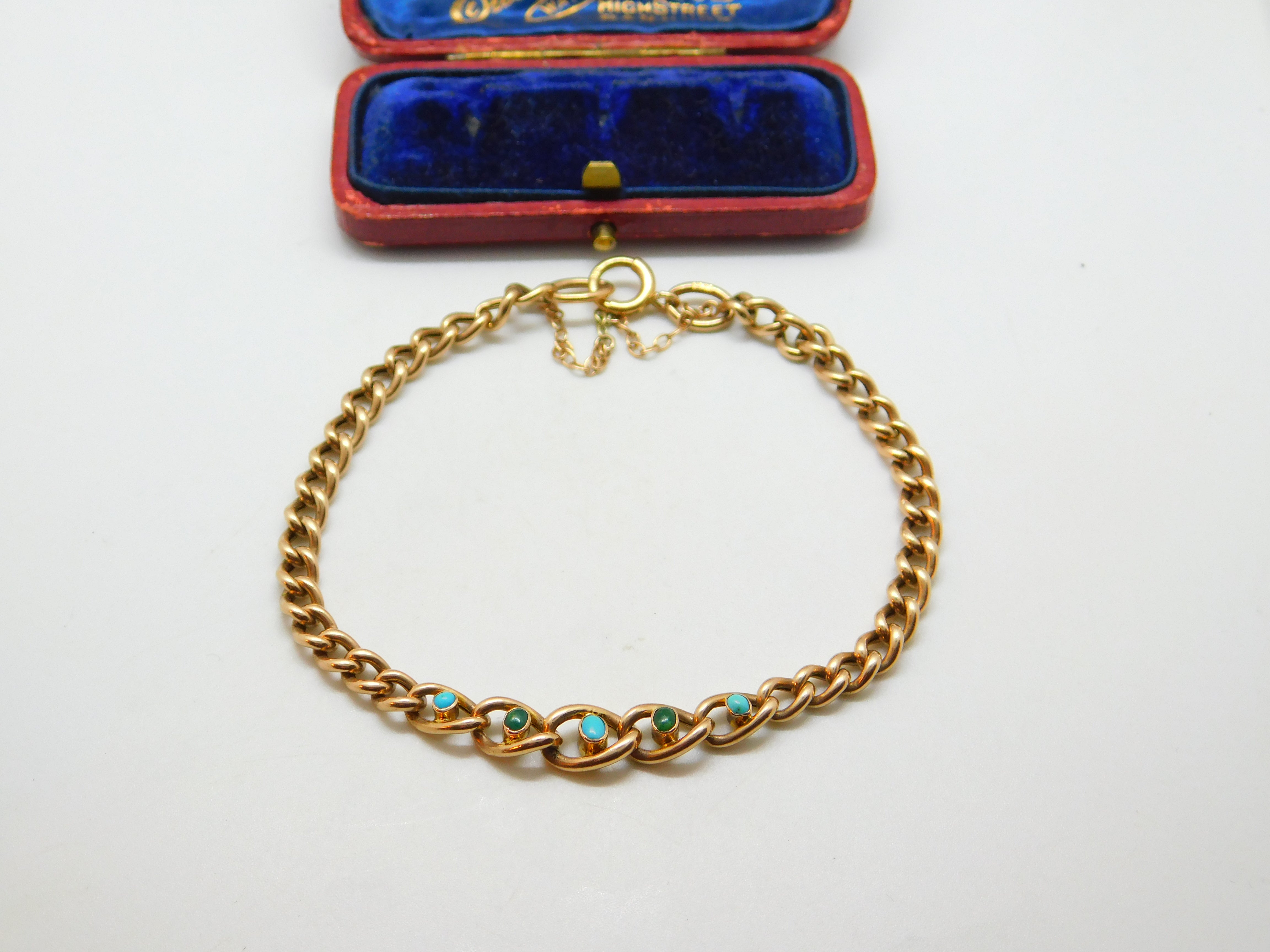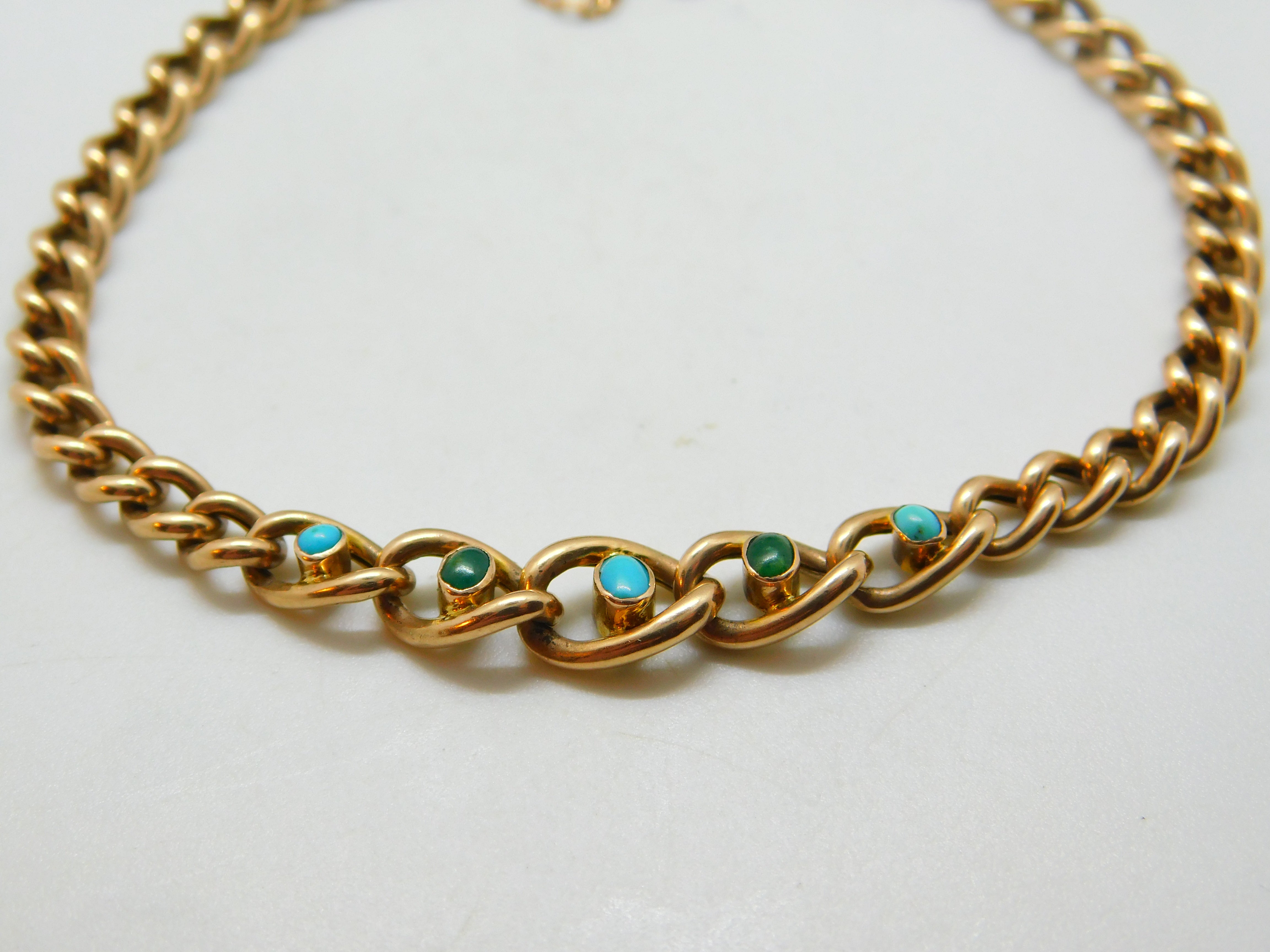 Details: A fantastic and wonderfully designed antique Victorian 9ct rose gold curb link bracelet set with five beautiful turquoise stones to the centre hallmarked to the link adjoining the clasp 9ct and tested c1890. This is a wonderful item that would make a perfect gift or addition to any collection. The BOX pictured is for PRESENTATION ONLY and is NOT included in the listings but used to frame the pictures unless specifically stated otherwise.