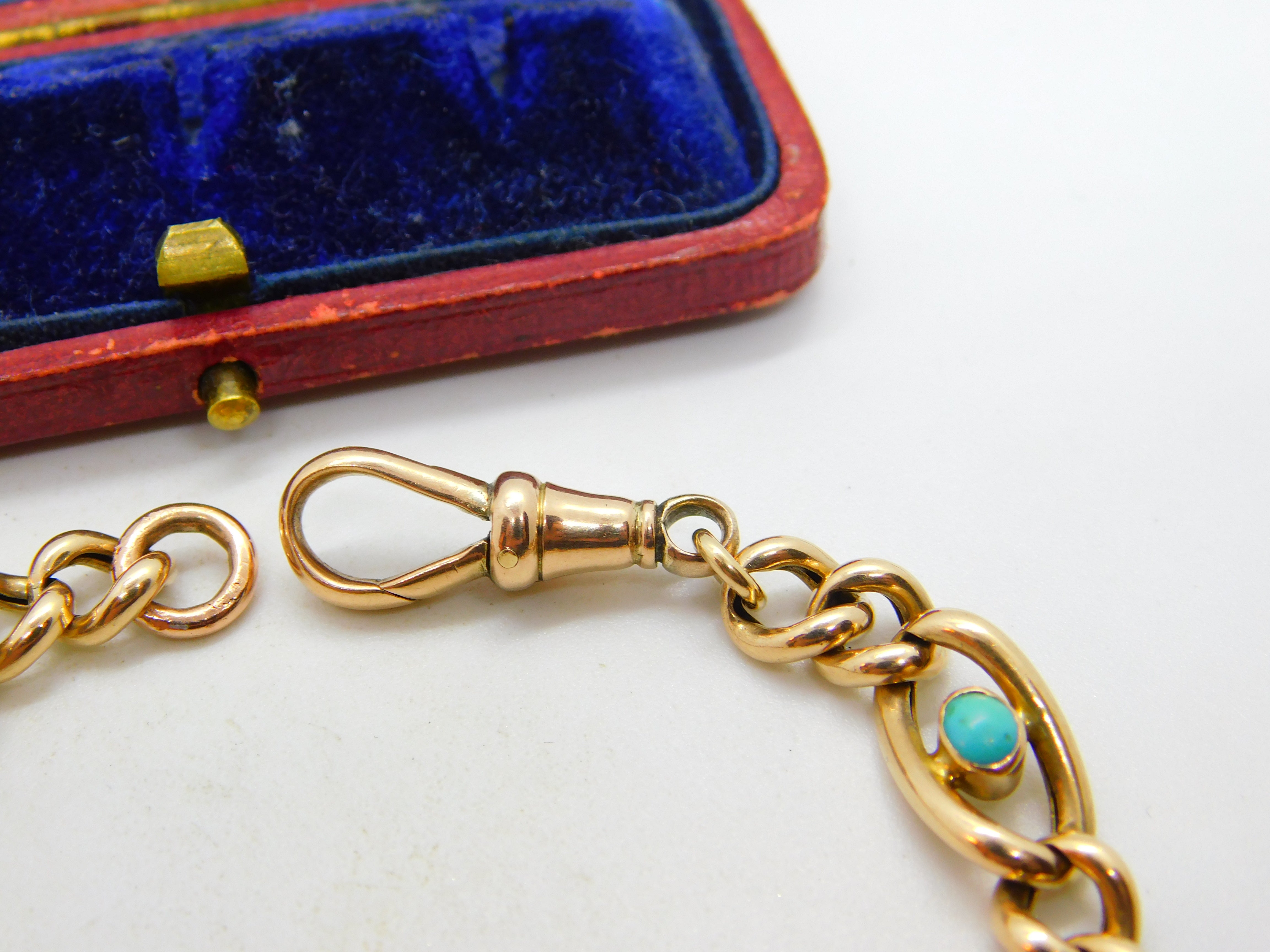 Details: A fantastic and wonderfully designed antique Victorian 9ct rose gold graduating bracelet set with cabochon turquoise stones hallmarked to the dog clip c1890. A beautiful example. This is a wonderful item that would make a perfect gift or addition to any collection. The BOX pictured is for PRESENTATION ONLY and is NOT included in the listings but used to frame the pictures unless specifically stated otherwise.