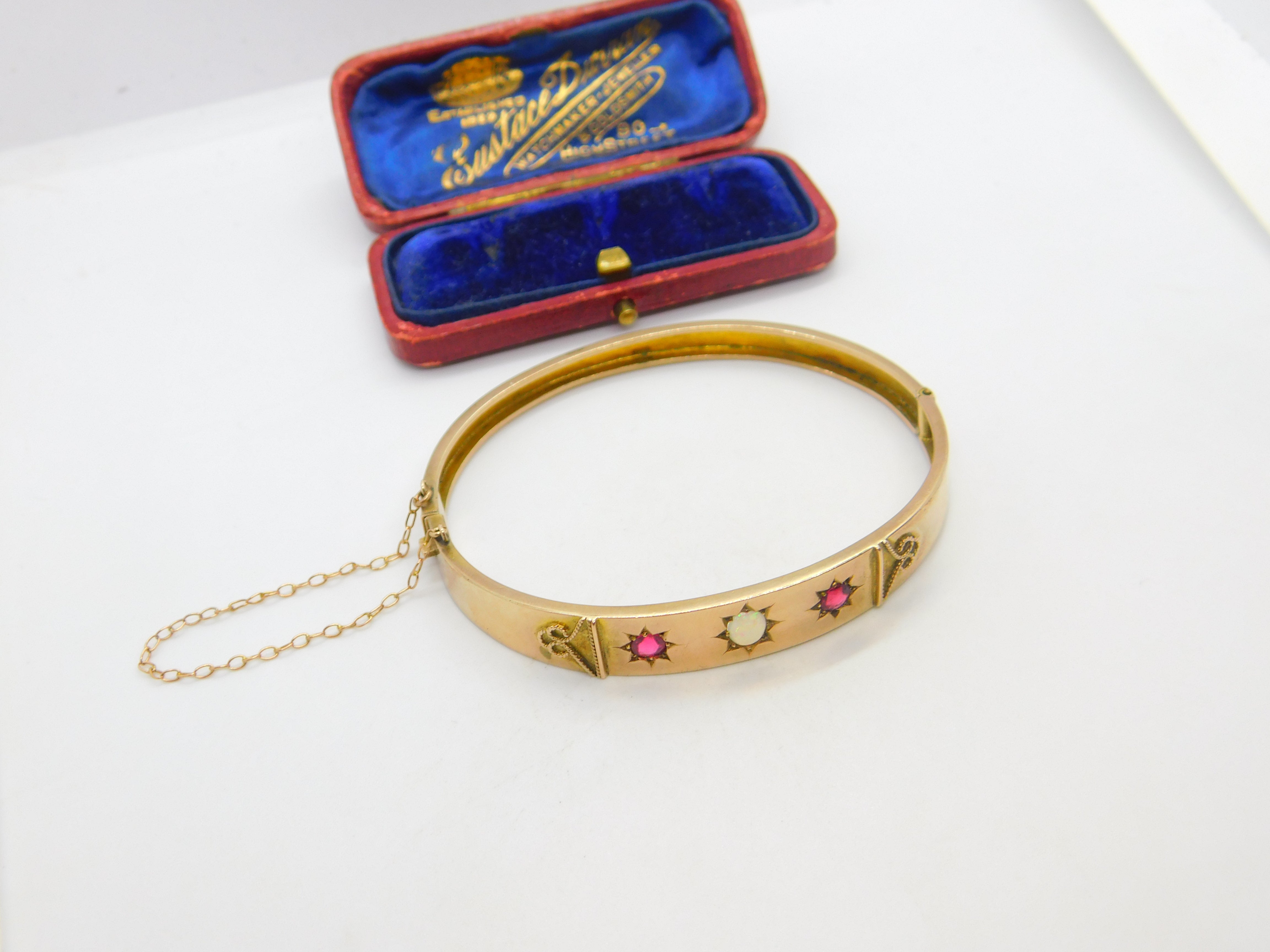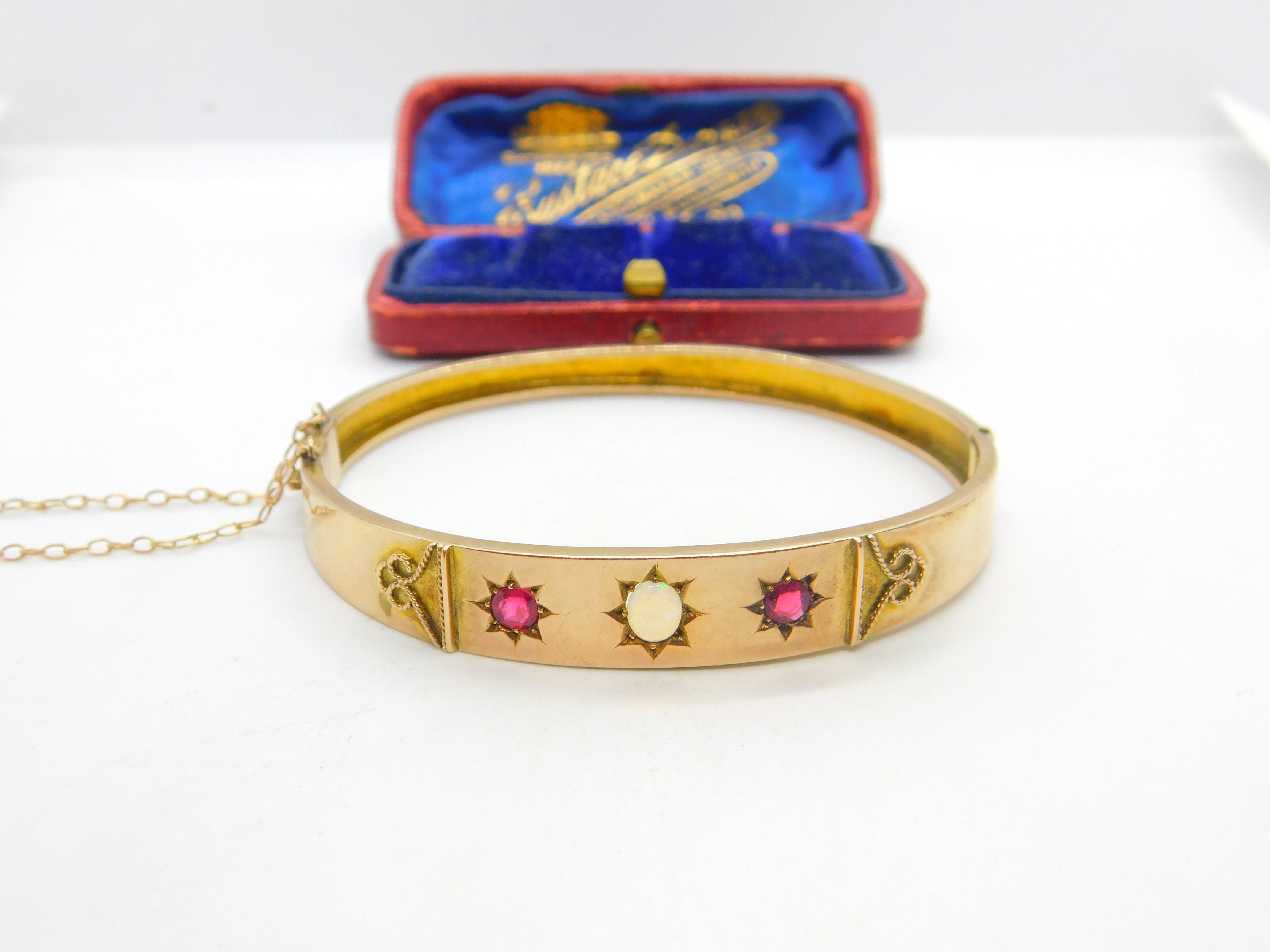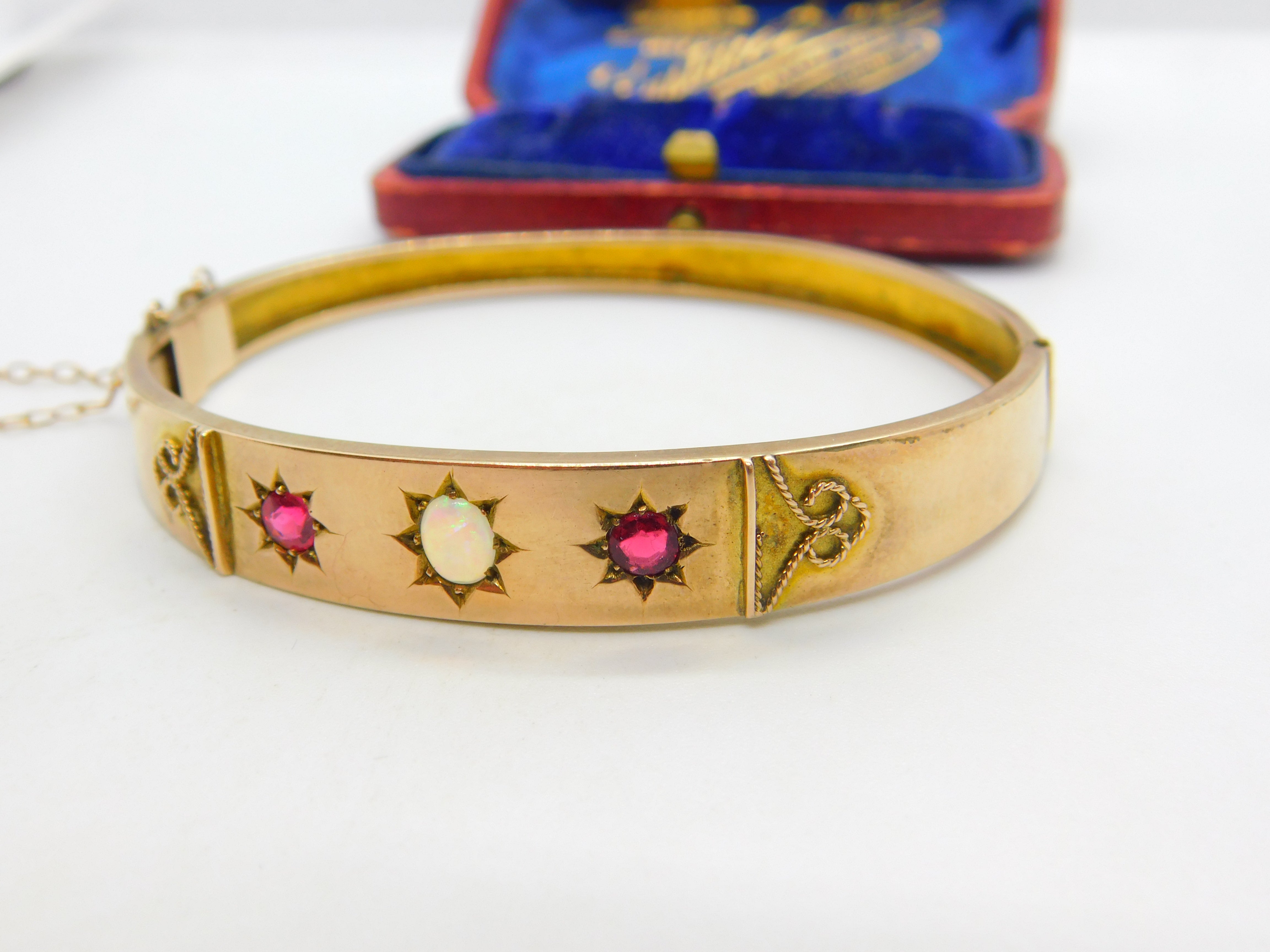 Details: A fantastic and wonderfully designed antique Victorian 9ct rose gold bangle bracelet set with cabochon opal surrounded by garnet stones c1880 - the gold has been XRF tested as there are no marks. This is a wonderful item that would make a perfect gift or addition to any collection. The BOX pictured is for PRESENTATION ONLY and is NOT included in the listings but used to frame the pictures unless specifically stated otherwise.