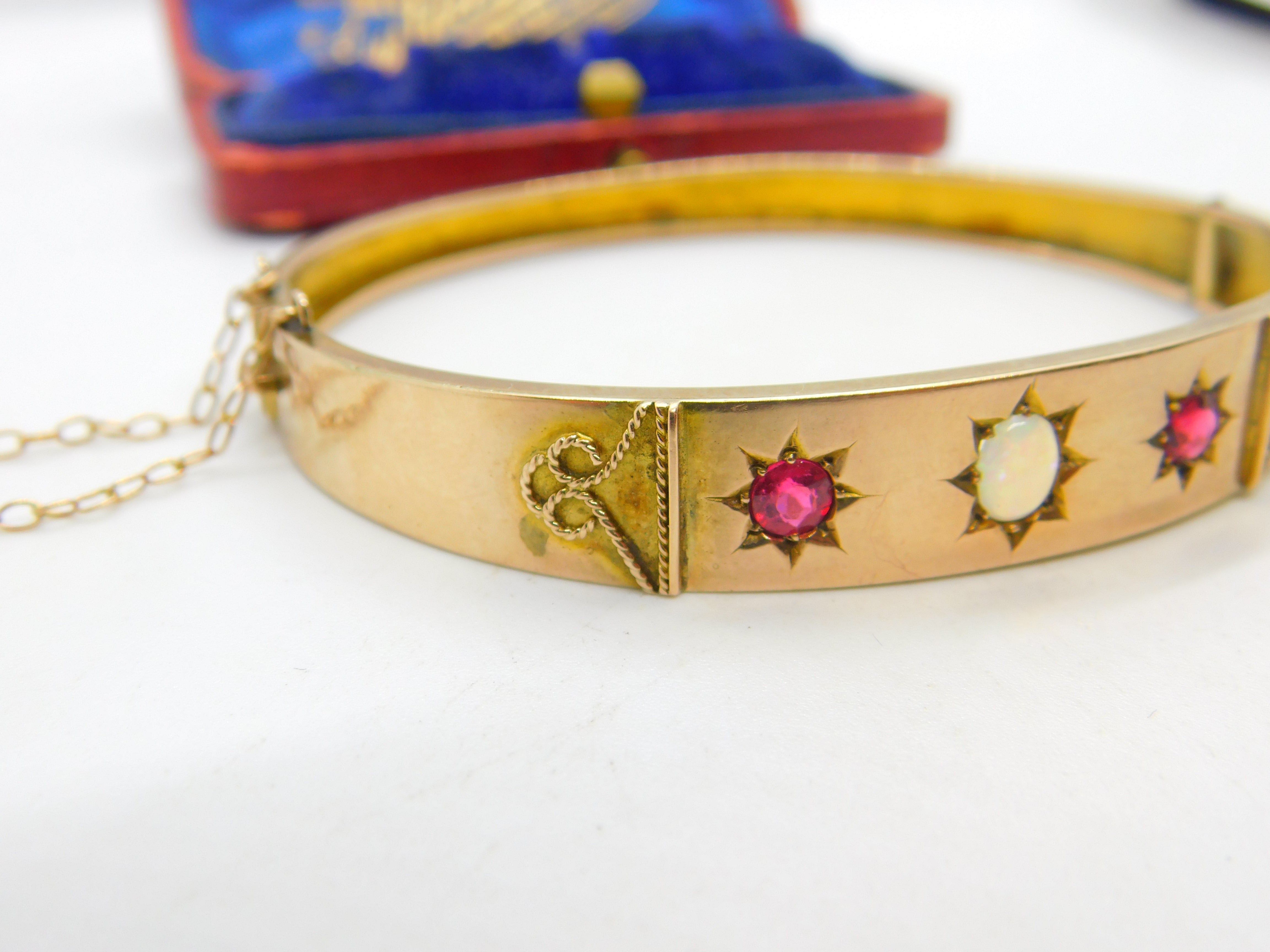 Victorian 9ct Rose Gold, Opal & Garnet Set Bangle Bracelet Antique c1880