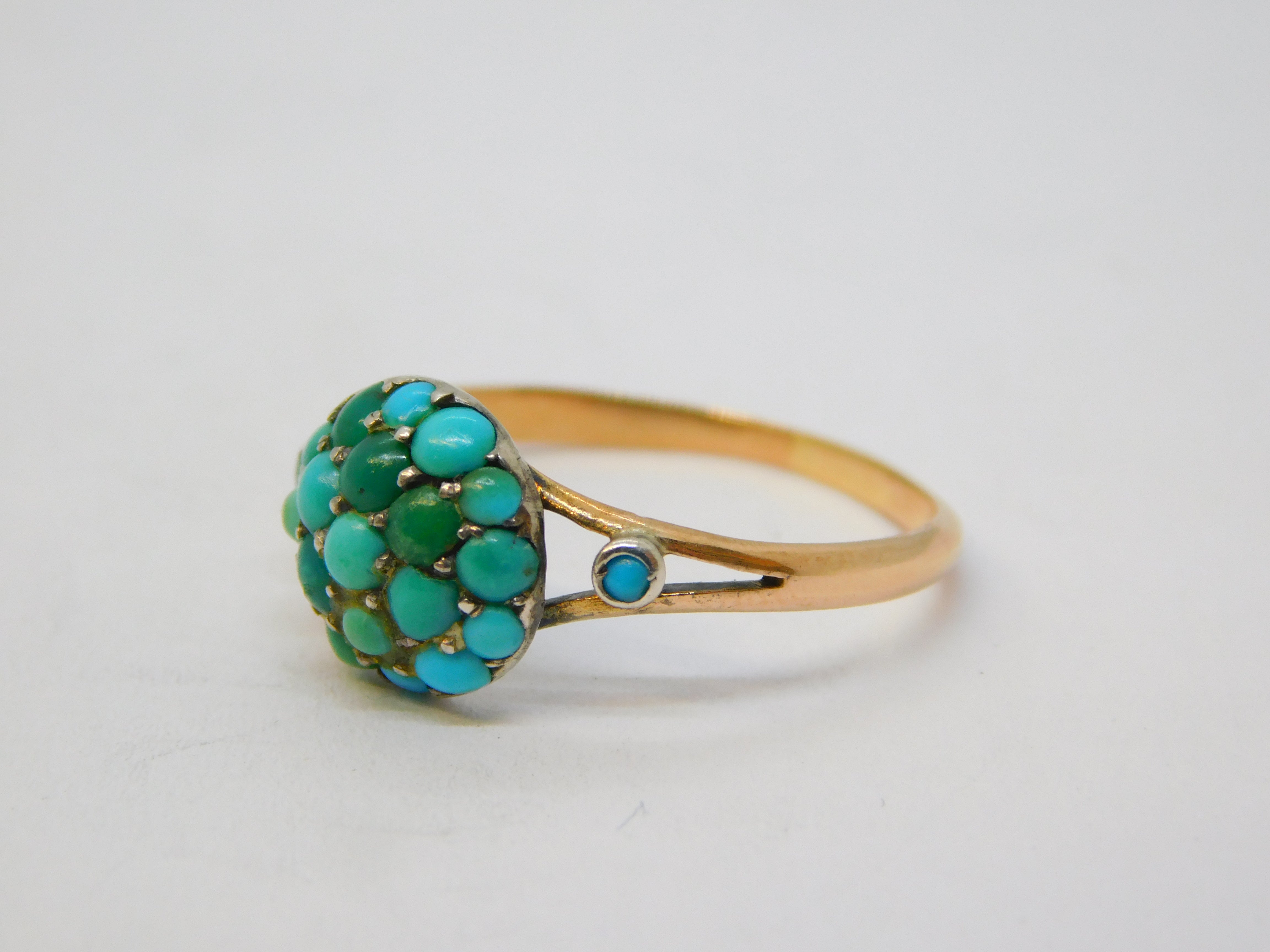 Details: A fantastic and wonderfully designed antique Victorian 9ct rose gold shield form dress ring adorned with pave set natural turquoise c1880, the gold has been XRF tested as it is unmarked. This is a wonderful item that would make a perfect gift or addition to any collection. We are more than happy to provide XRF reports for items upon request.