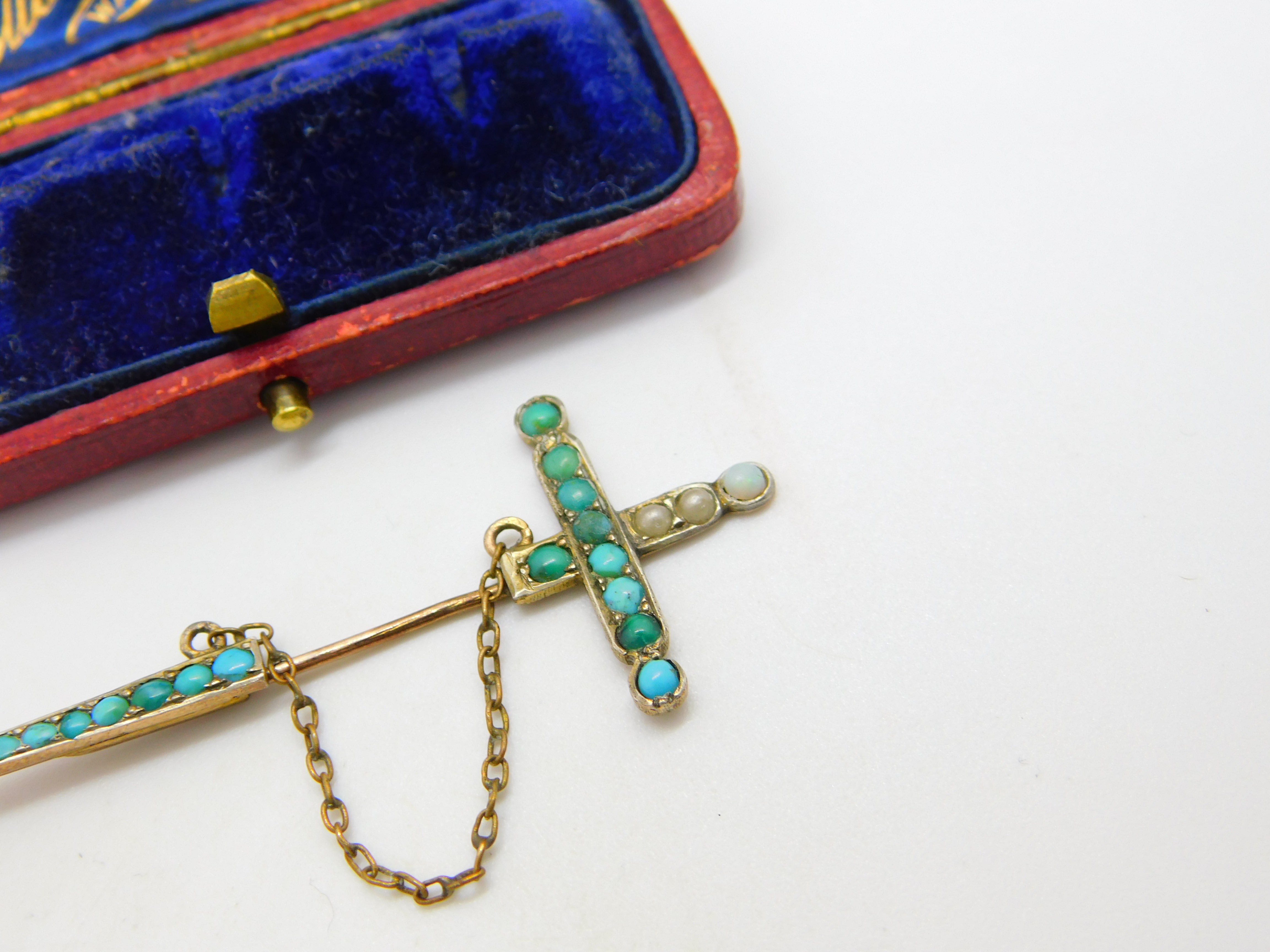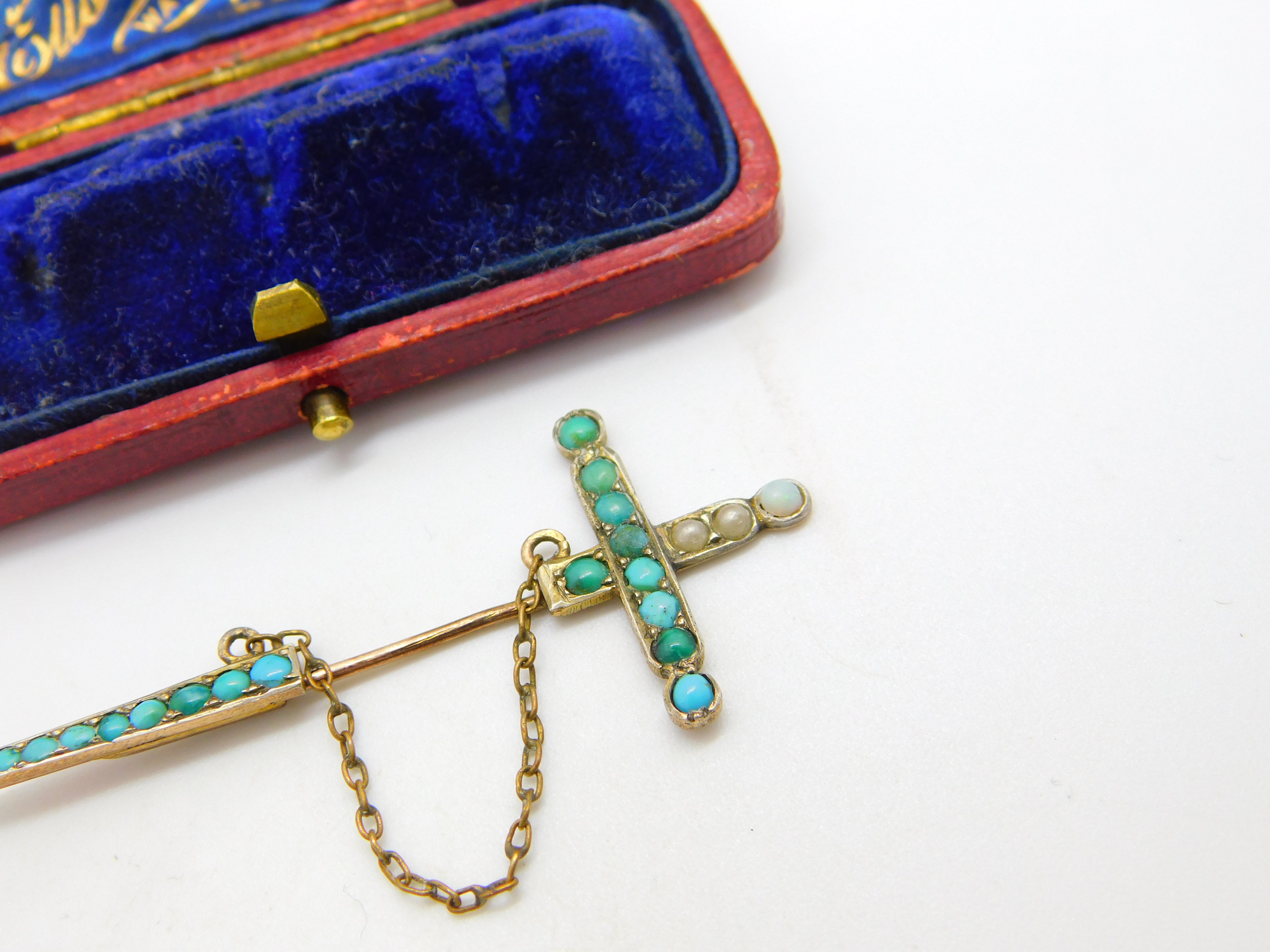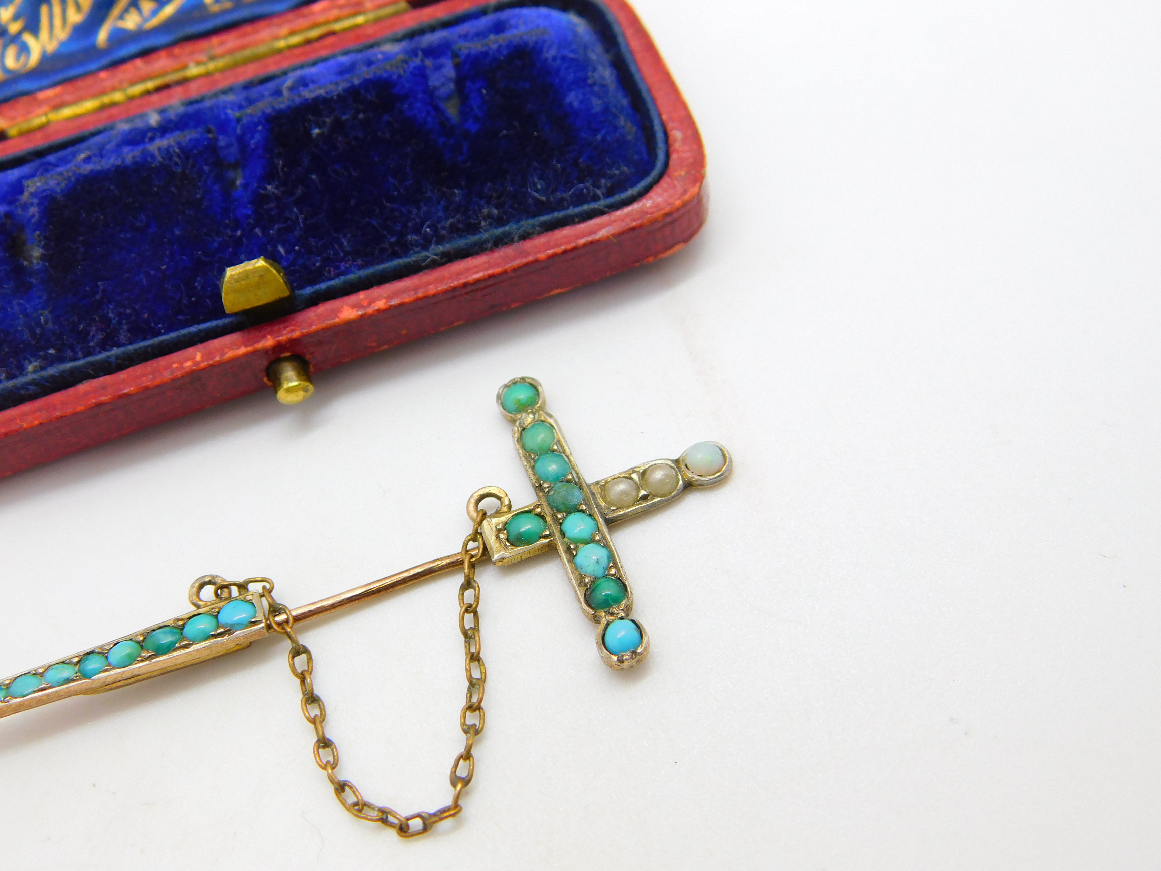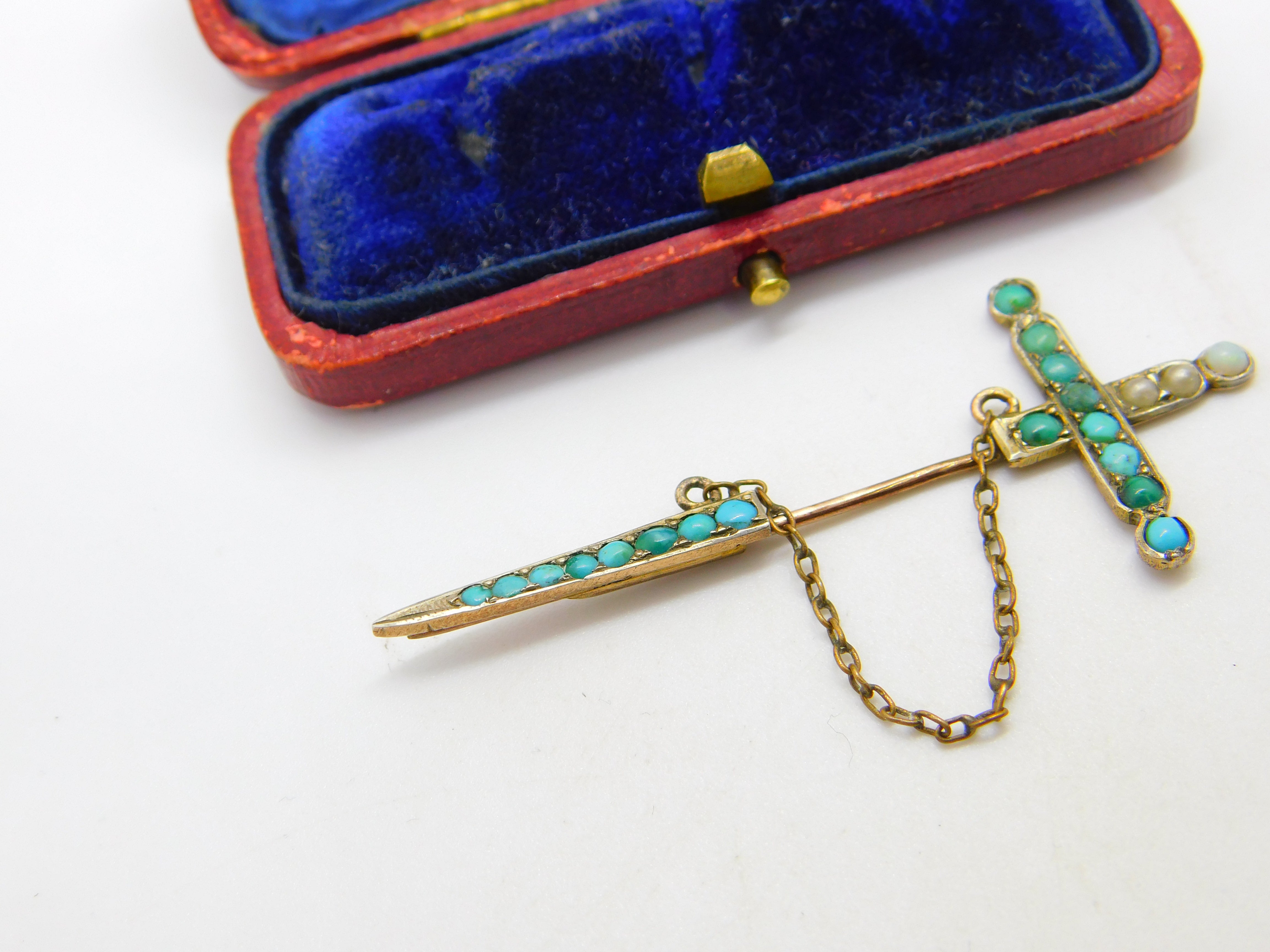 Details: A fantastic and wonderfully designed antique early Victorian 9ct rose gold sword form lapel brooch adorned with pave set turquoise and seed pearls c1840, the gold has been XRF tested, nice condition. This is a wonderful item that would make a perfect gift or addition to any collection. The BOX pictured is for PRESENTATION ONLY and is NOT included in the listings but used to frame the pictures unless specifically stated otherwise.