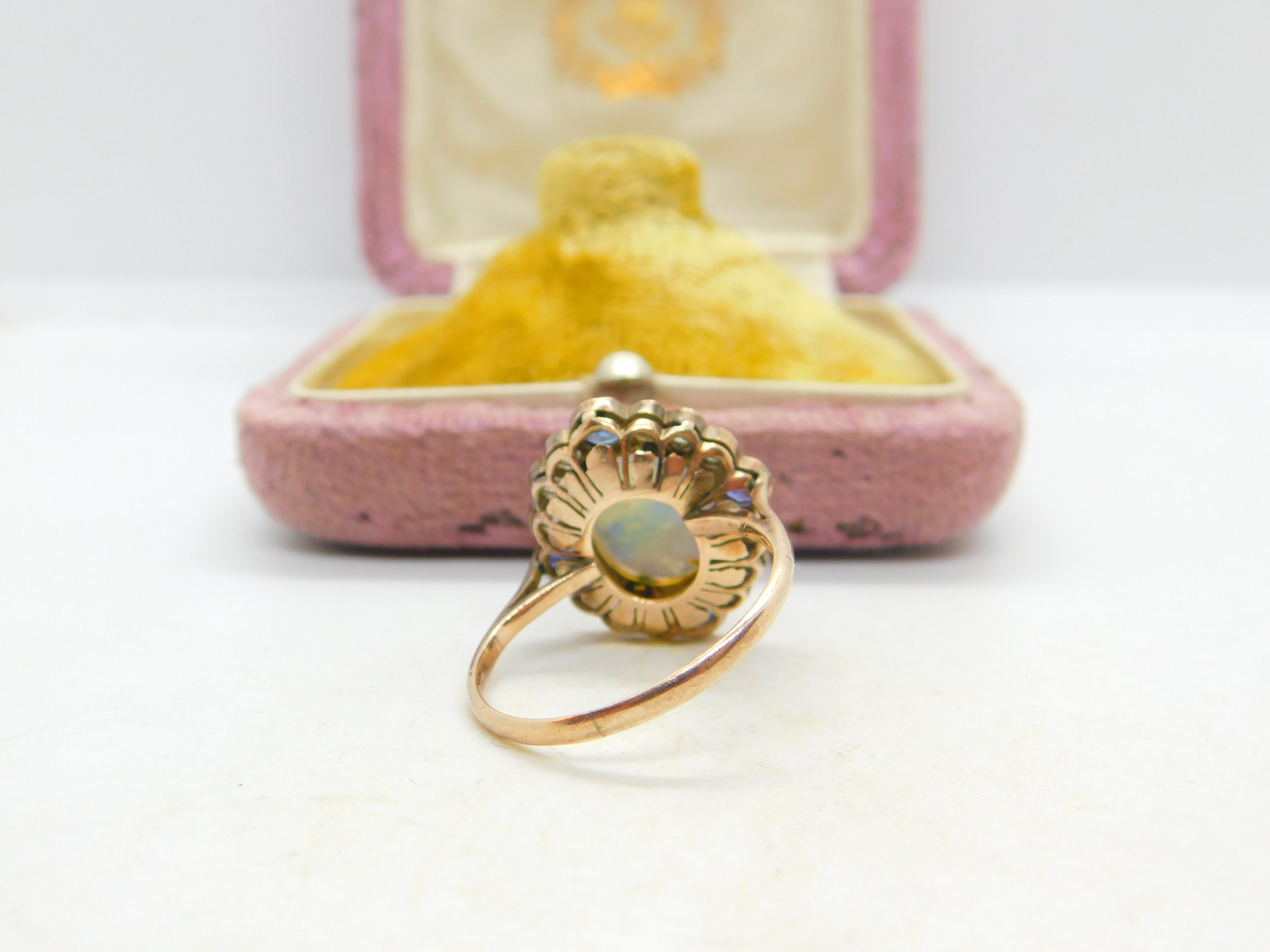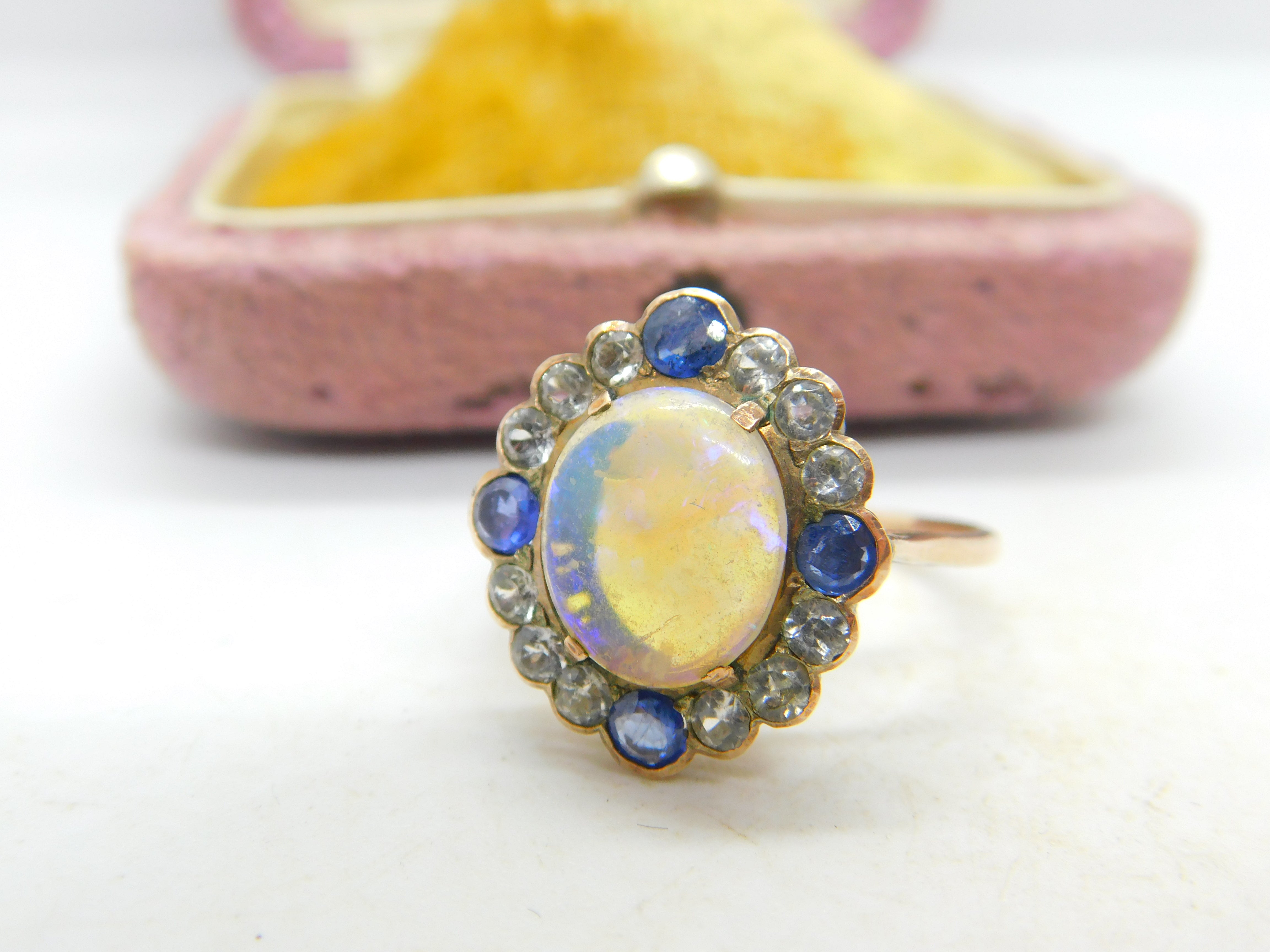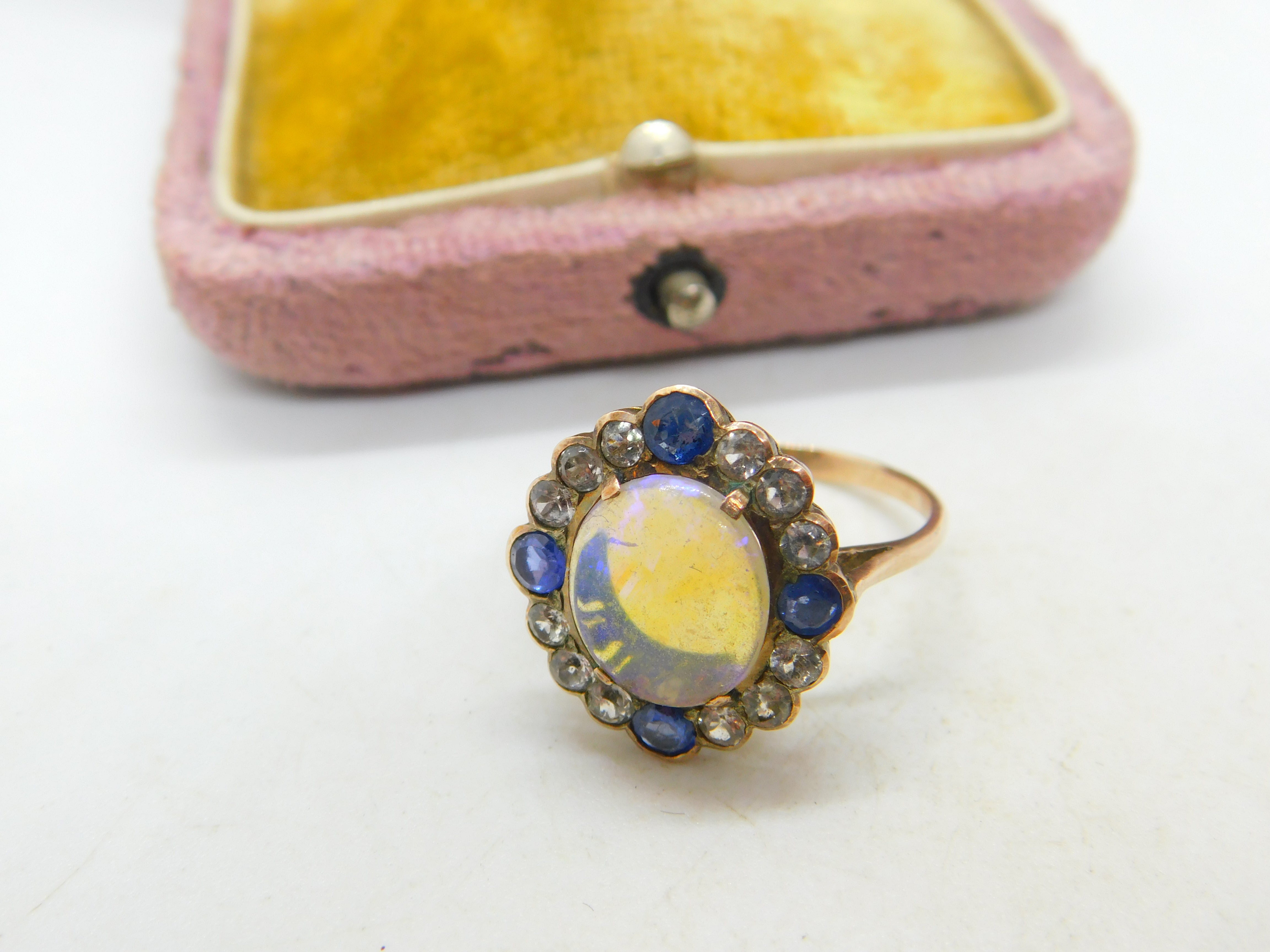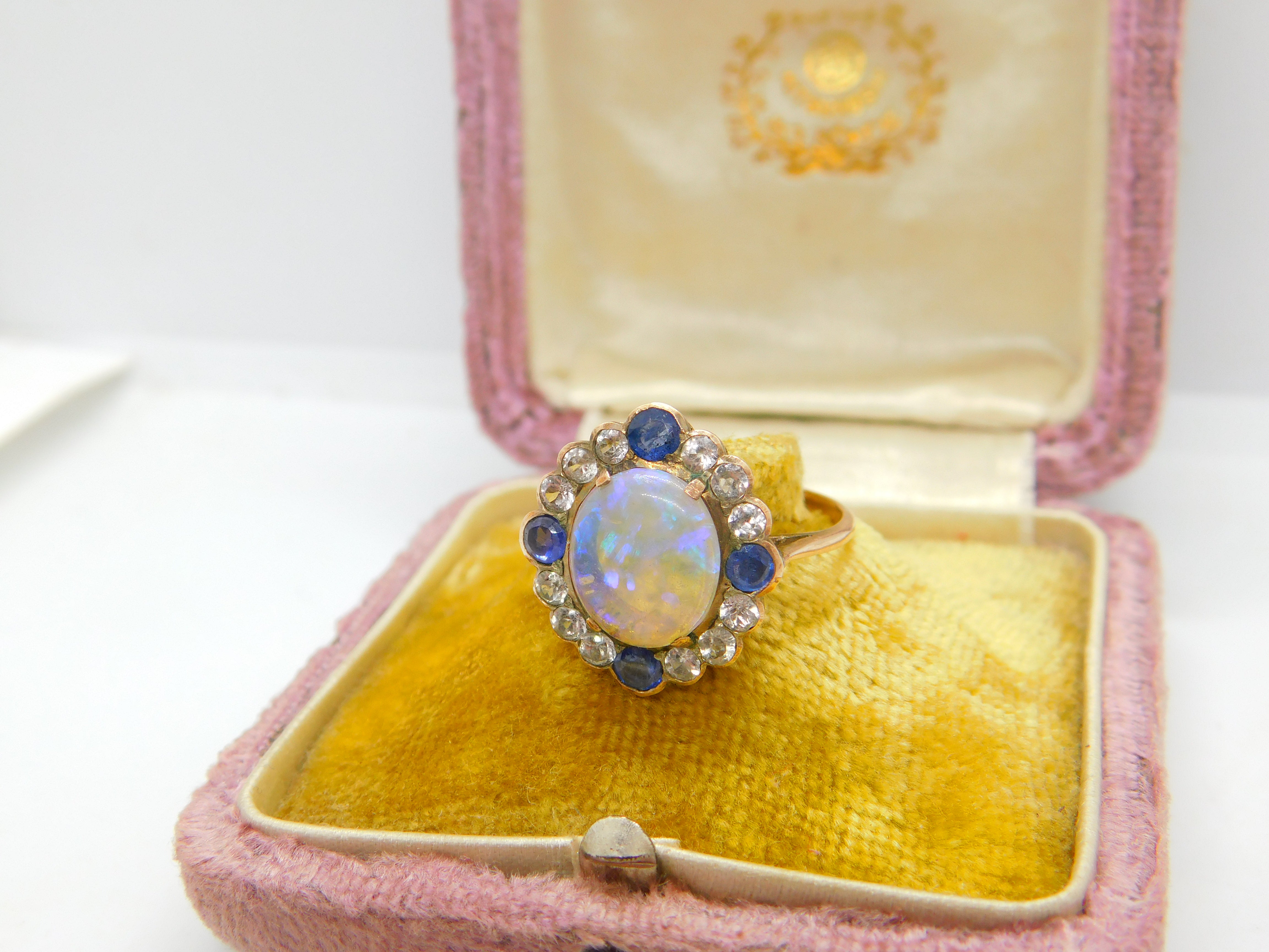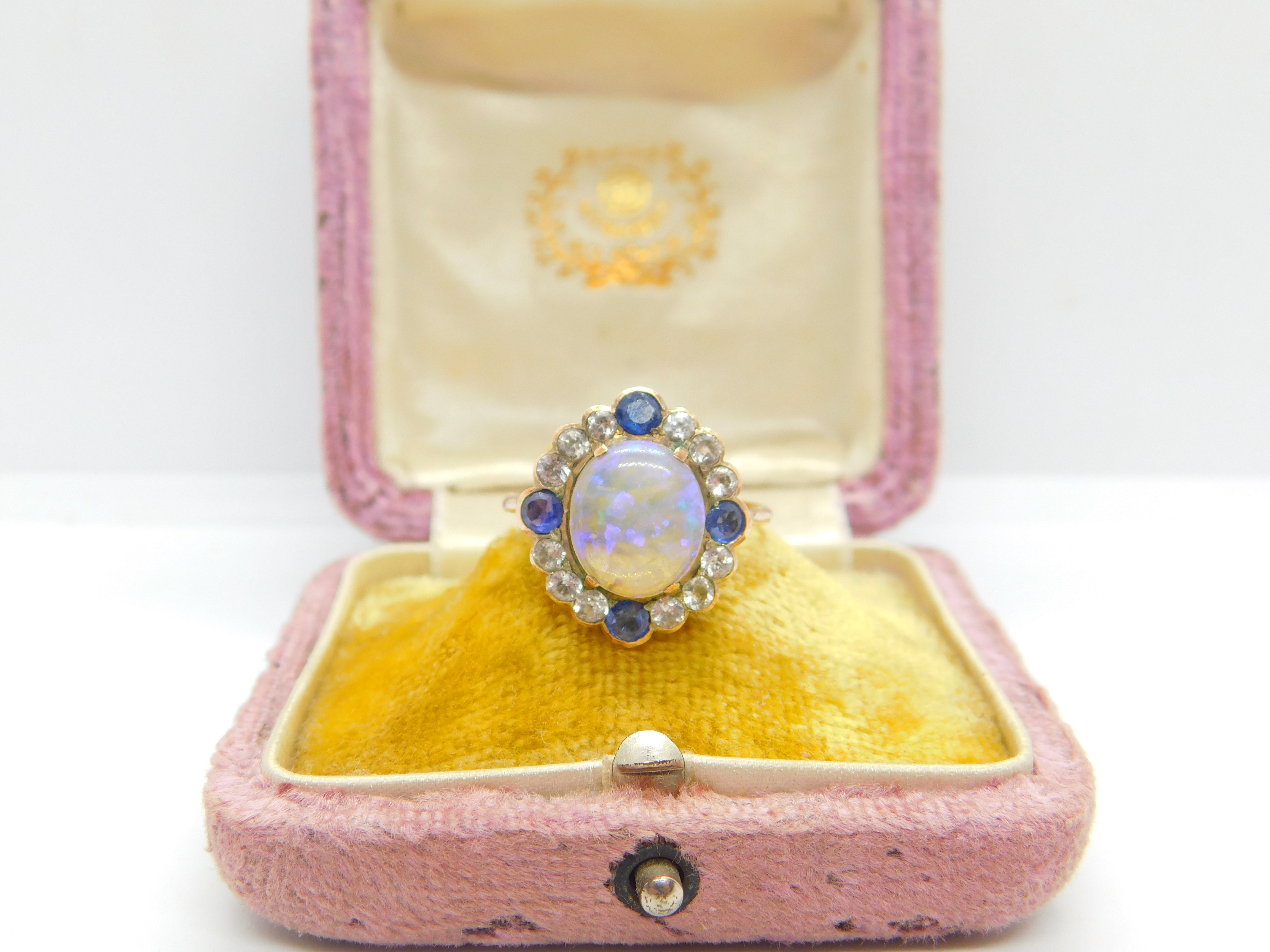 Details: A fantastic and wonderfully designed antique Victorian 9ct rose gold set dress ring with the most stunning water opal to the centre surrounded by blue & white sapphires c1850. The gold has been XRF tested and the stones have equally been tested. This is a wonderful item that would make a perfect gift or addition to any collection. The BOX pictured is for PRESENTATION ONLY and is NOT included in the listings but used to frame the pictures unless specifically stated otherwise.