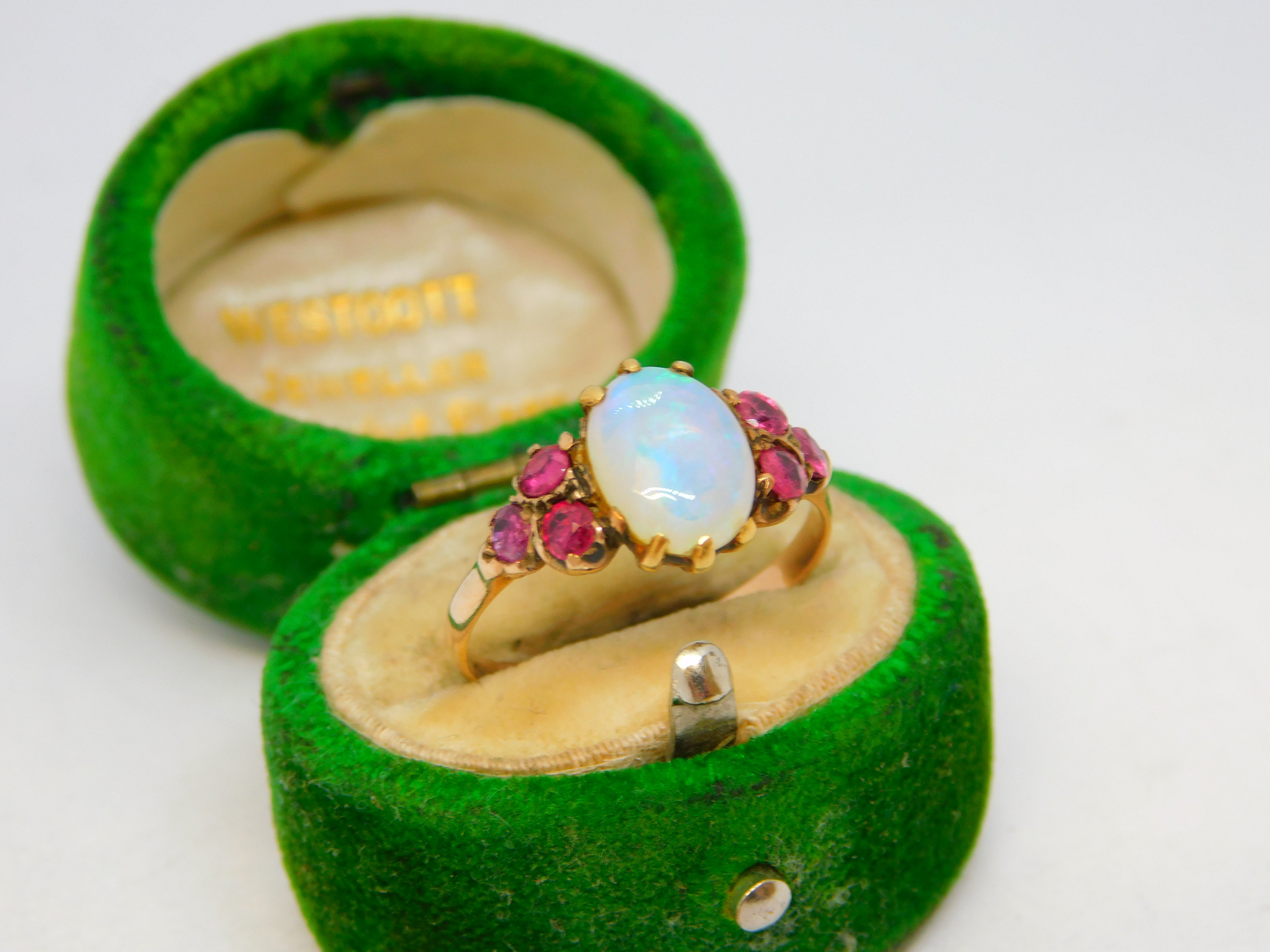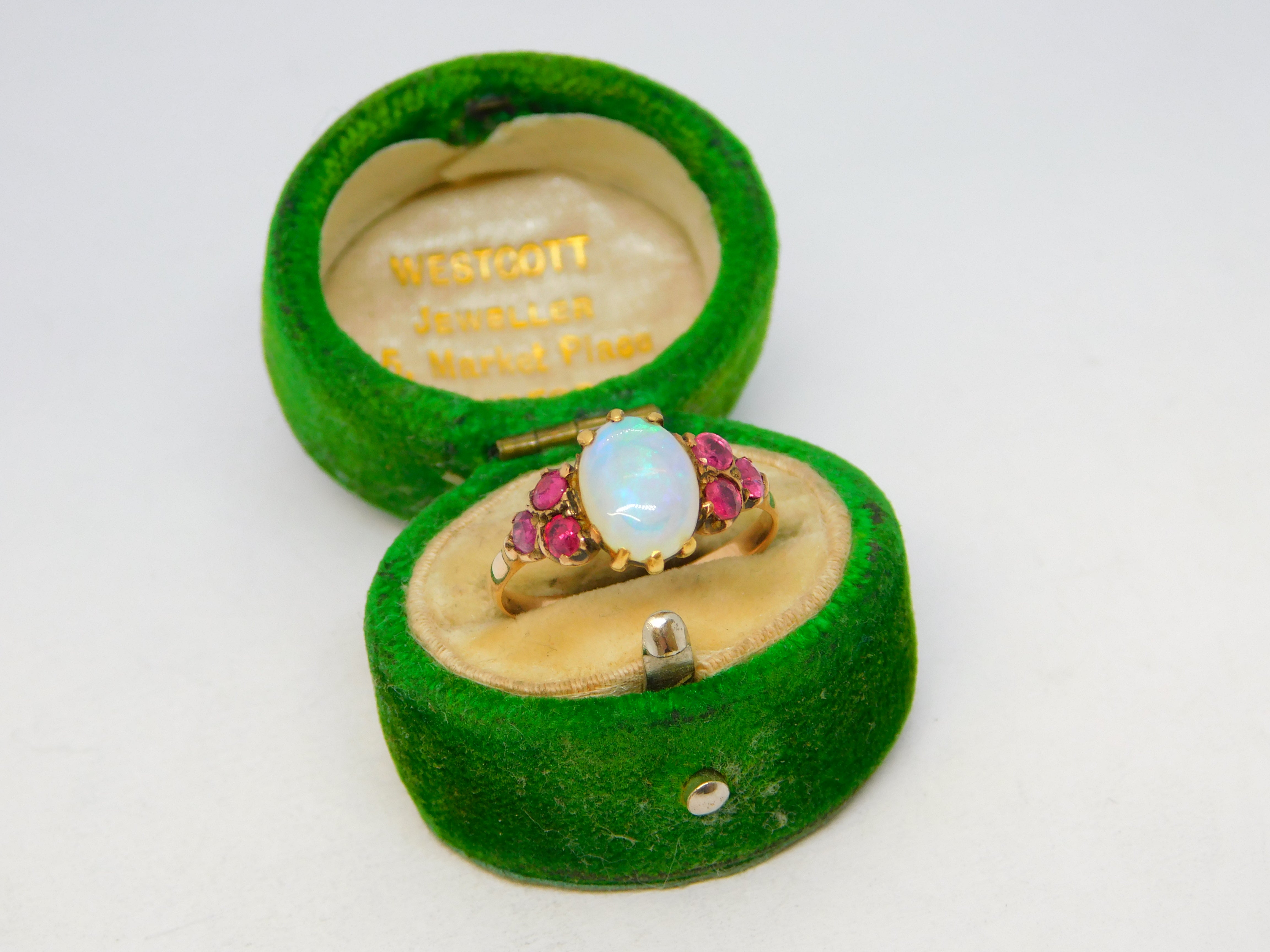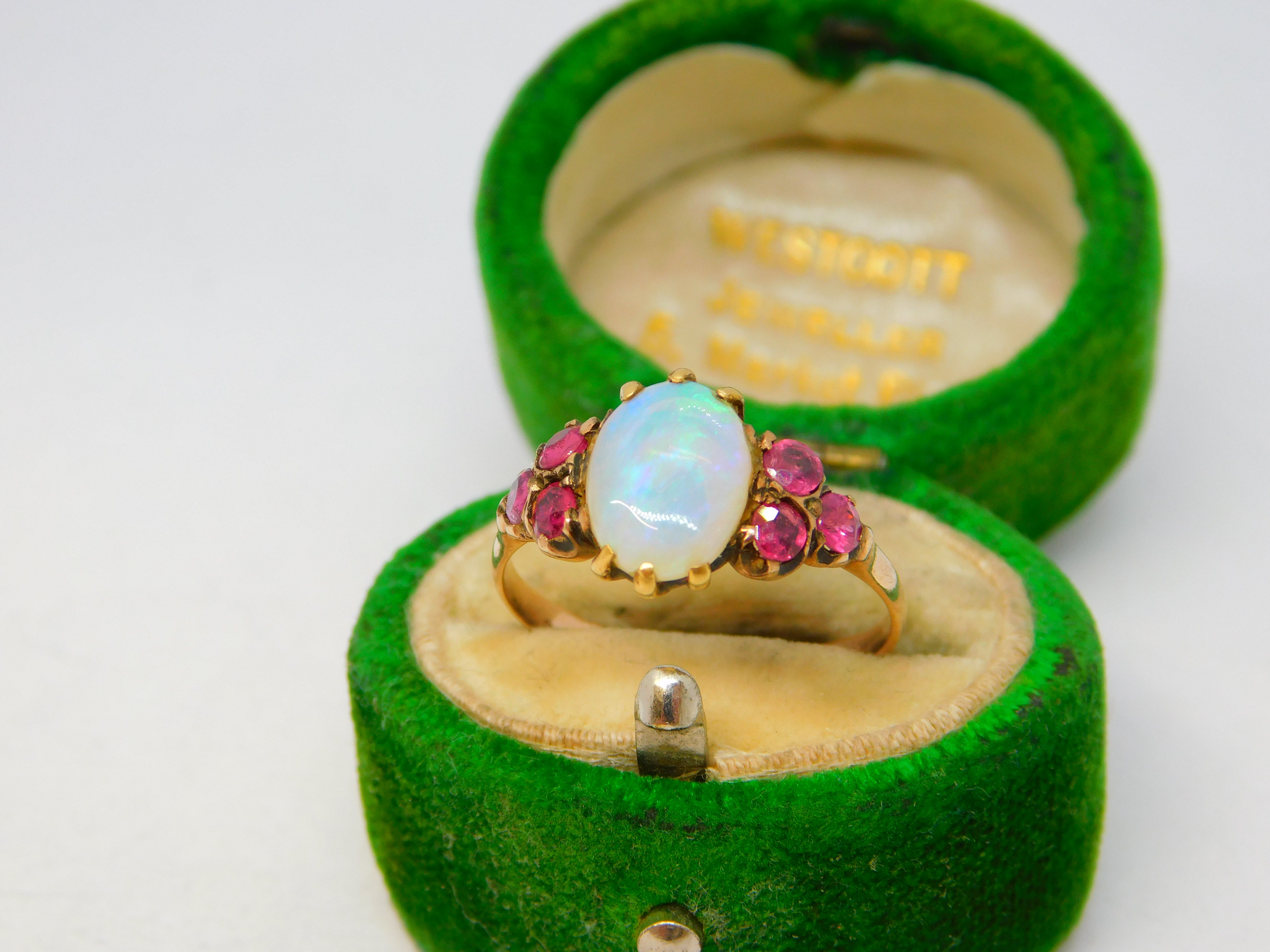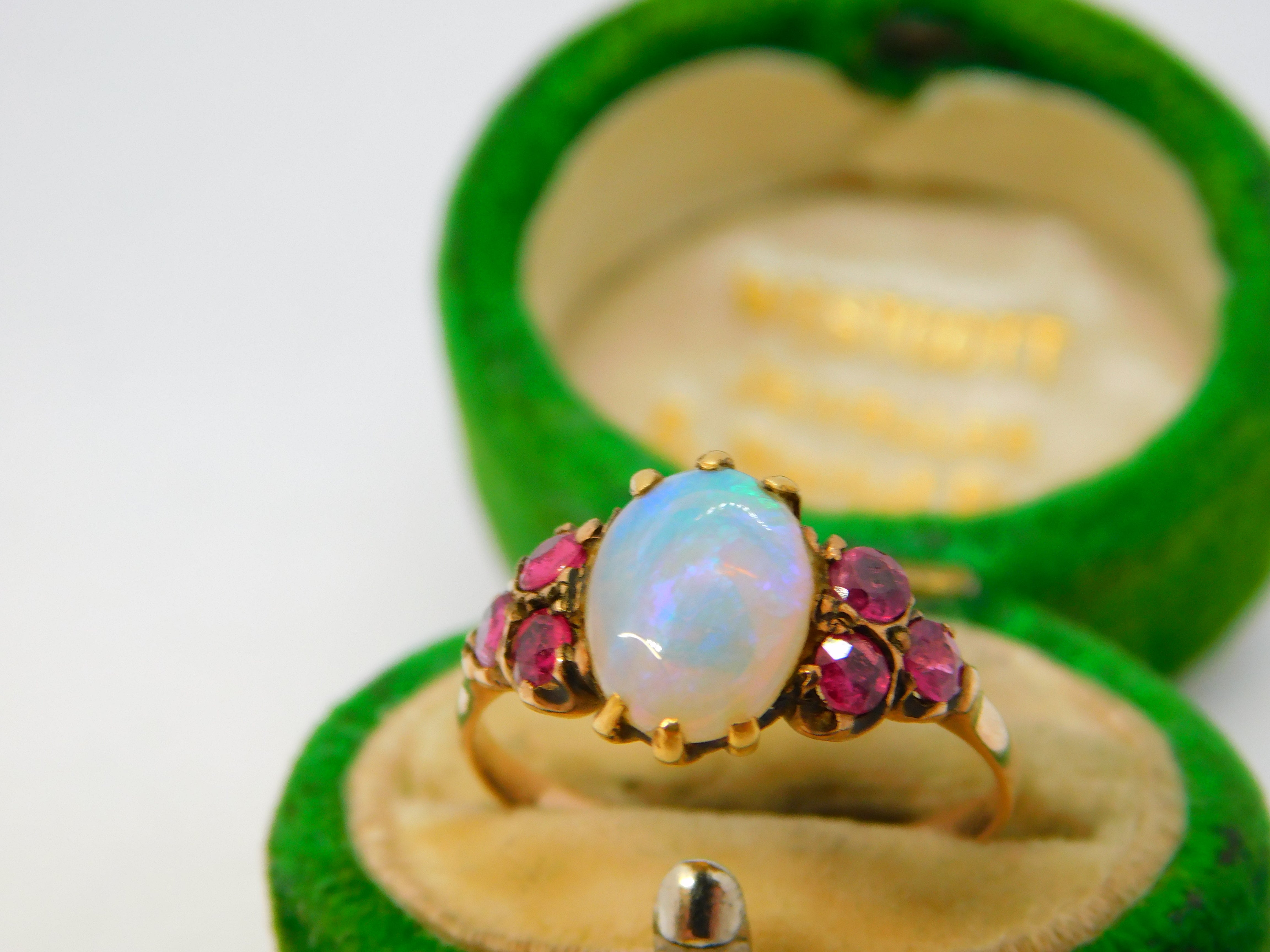 Details: A fantastic and wonderfully designed antique Victorian 9ct rose gold dress ring set with a central white opal flanked by natural rubies c1900, the gold has been XRF tested as it is unmarked. This is a wonderful item that would make a perfect gift or addition to any collection. The BOX pictured is for PRESENTATION ONLY and is NOT included in the listings but used to frame the pictures unless specifically stated otherwise.