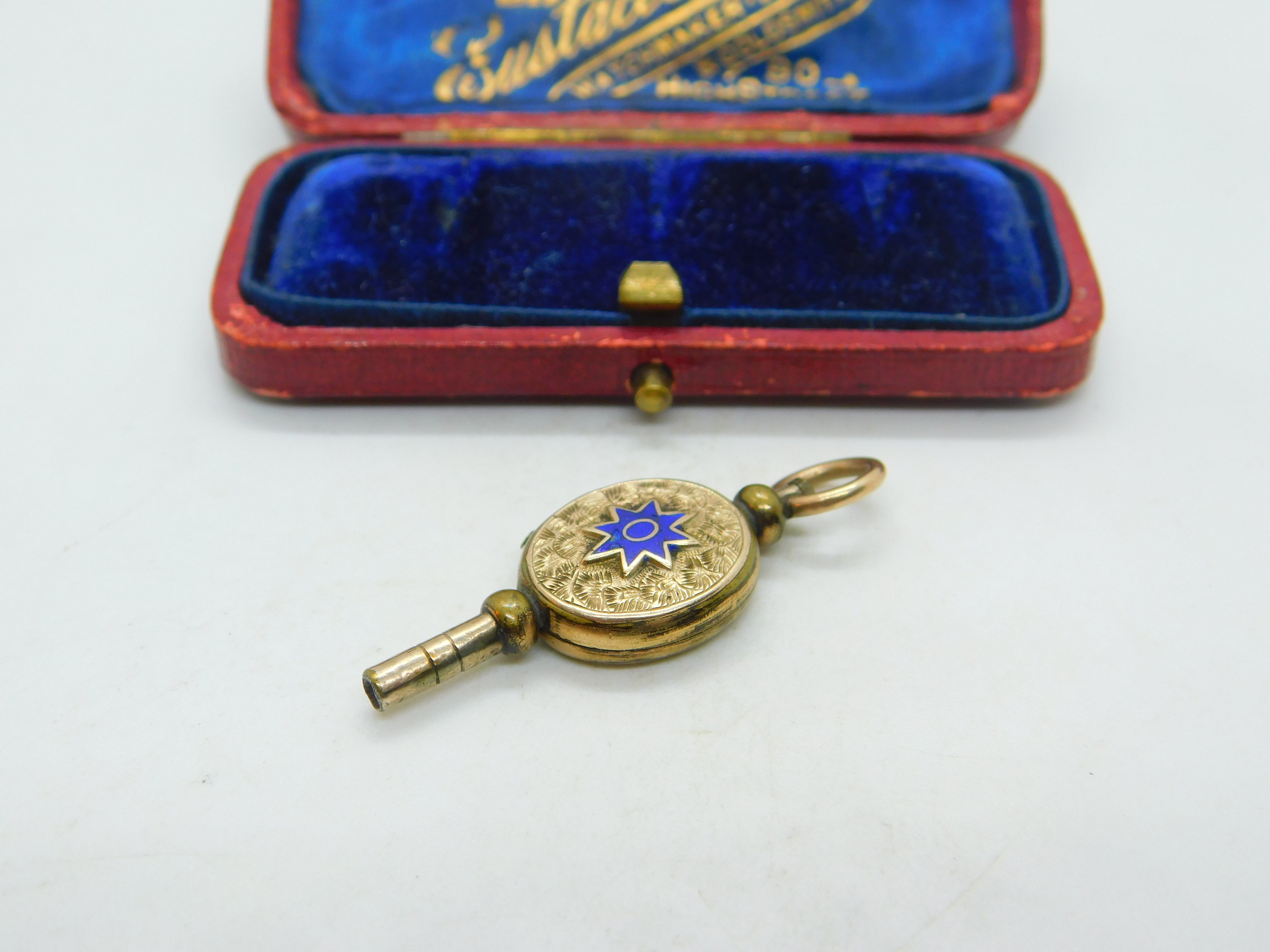 Victorian 9ct Yellow Gold Back & Watch Key Locket Blue Enamel Antique c1880