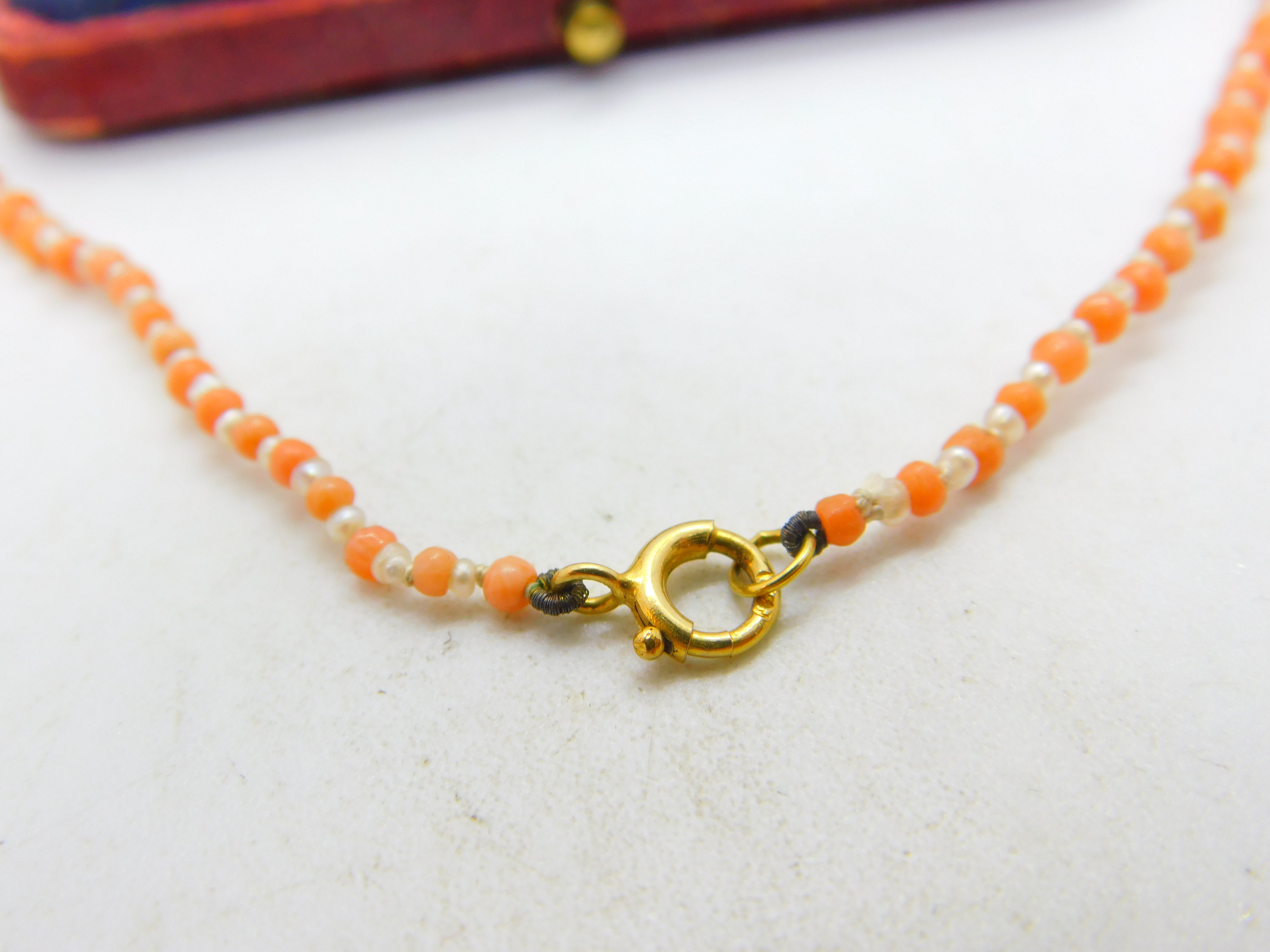 Victorian 9ct Yellow Gold, Beaded Coral & Seed Pearl Graduating Necklace c1890