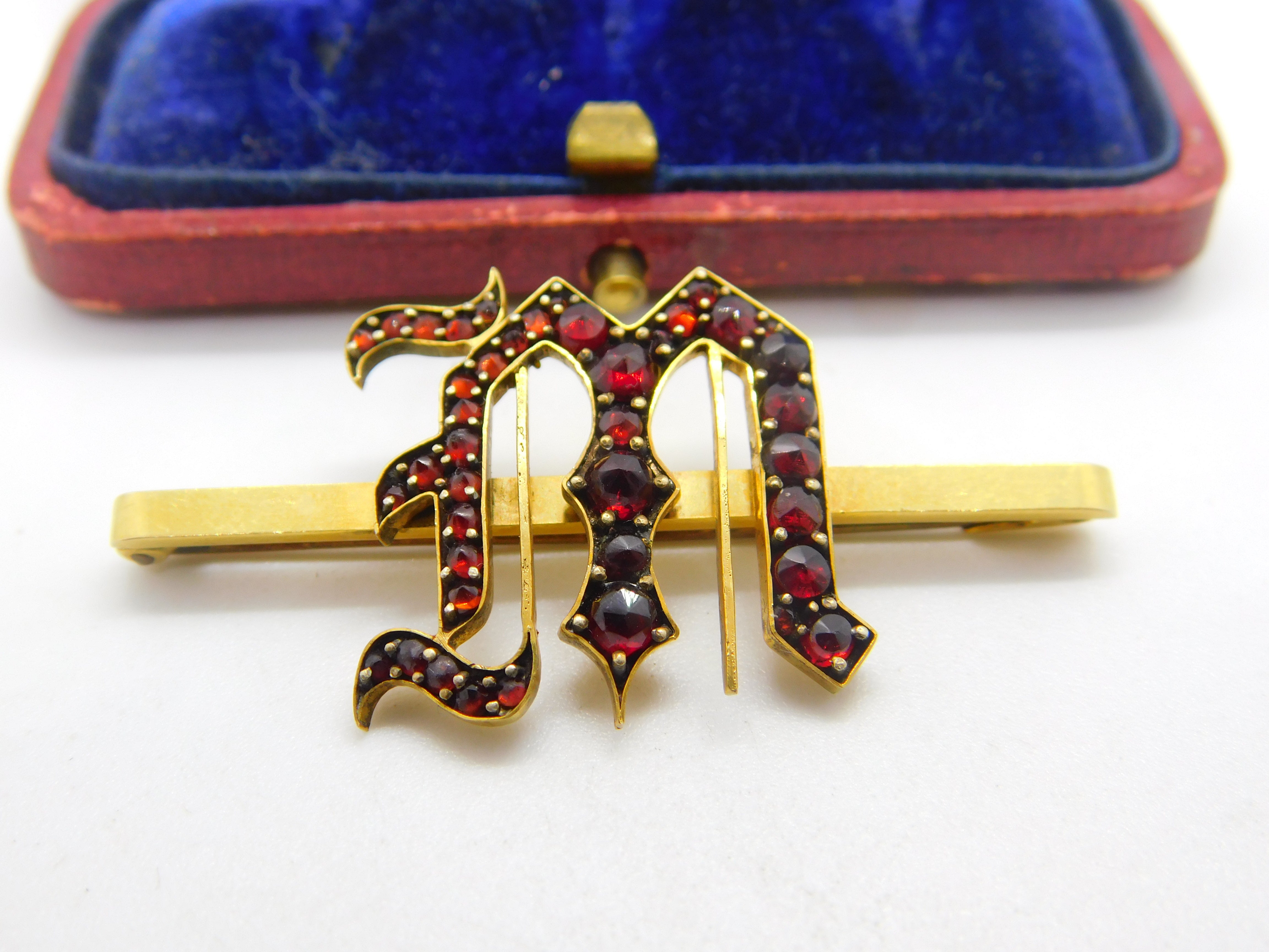 Victorian 9ct Yellow Gold Bohemian Garnet Set 'M Initial Brooch Antique c1860