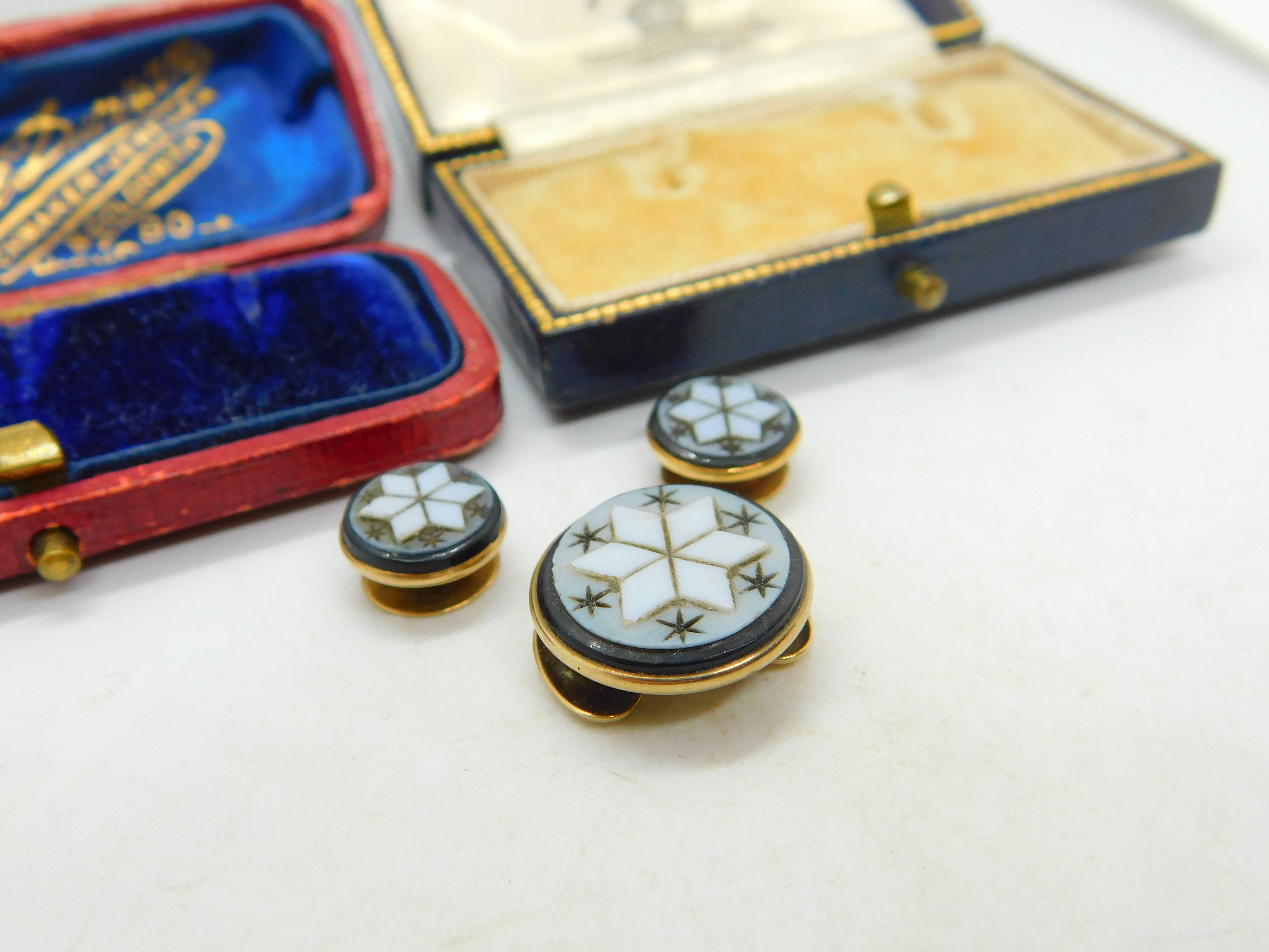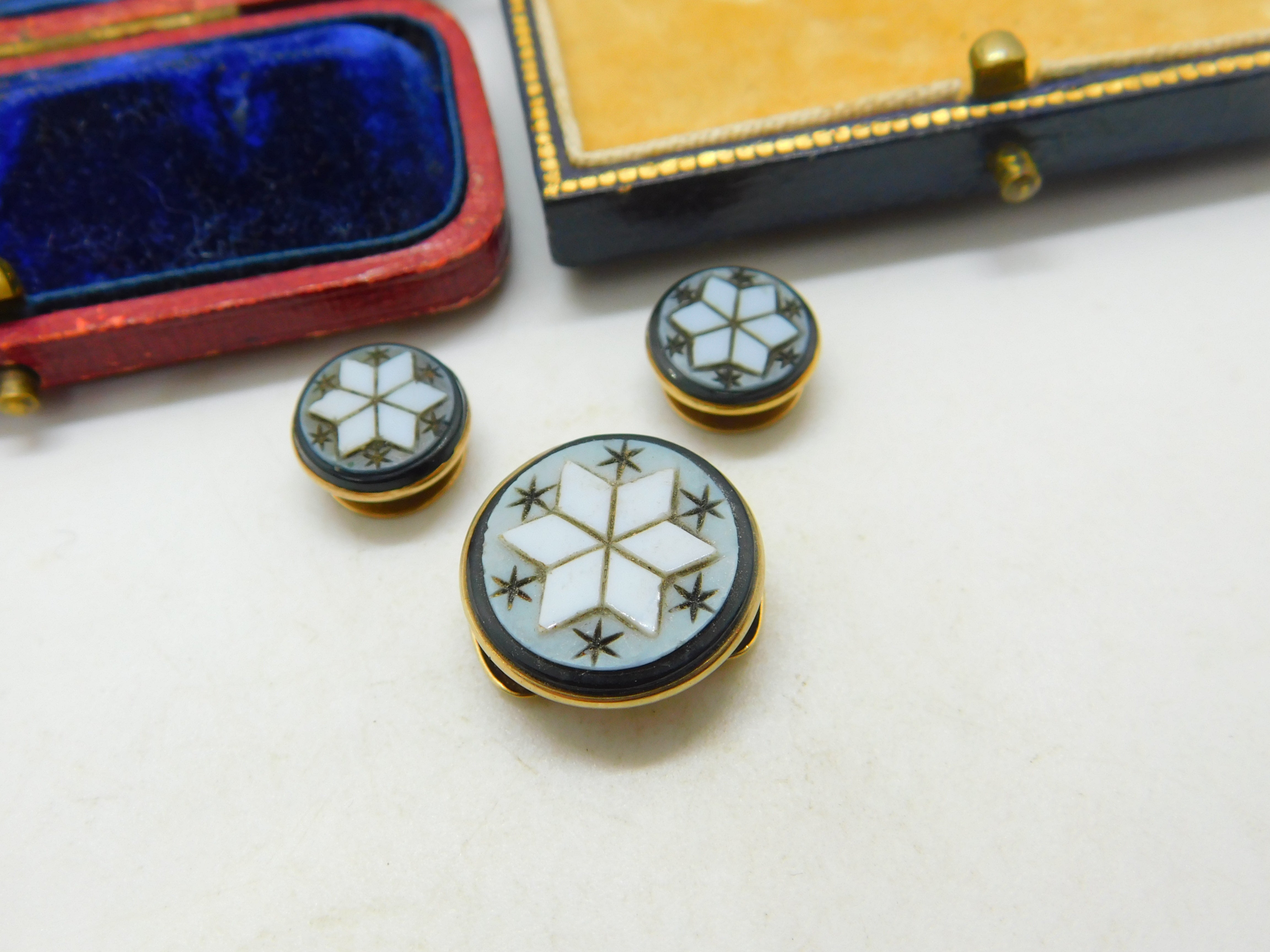 Details: A fantastic and wonderfully designed antique Victorian 9ct gold collar stud and button collection with superb carved sardonyx frontages in star form c1860. The gold has been XRF tested. This is a wonderful item that would make a perfect gift or addition to any collection. The BOX pictured is for PRESENTATION ONLY and is NOT included in the listings but used to frame the pictures unless specifically stated otherwise.