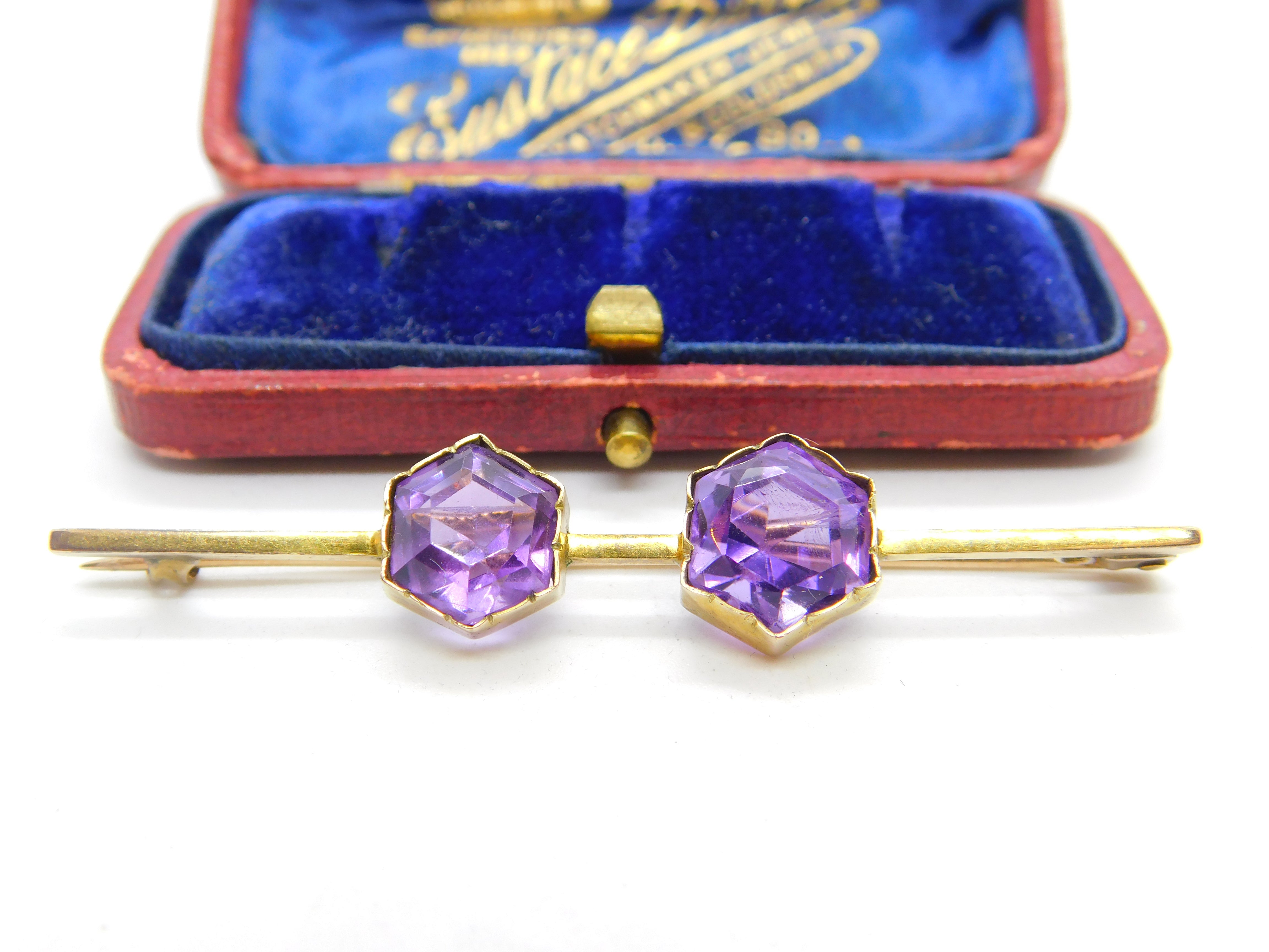 Details: A fantastic and wonderfully designed antique Victorian 9ct yellow gold bar brooch set with two hexagonal crimped set amethysts marked 9ct to the pin and tested c1880. This is a wonderful item that would make a perfect gift or addition to any collection. The BOX pictured is for PRESENTATION ONLY and is NOT included in the listings but used to frame the pictures unless specifically stated otherwise.