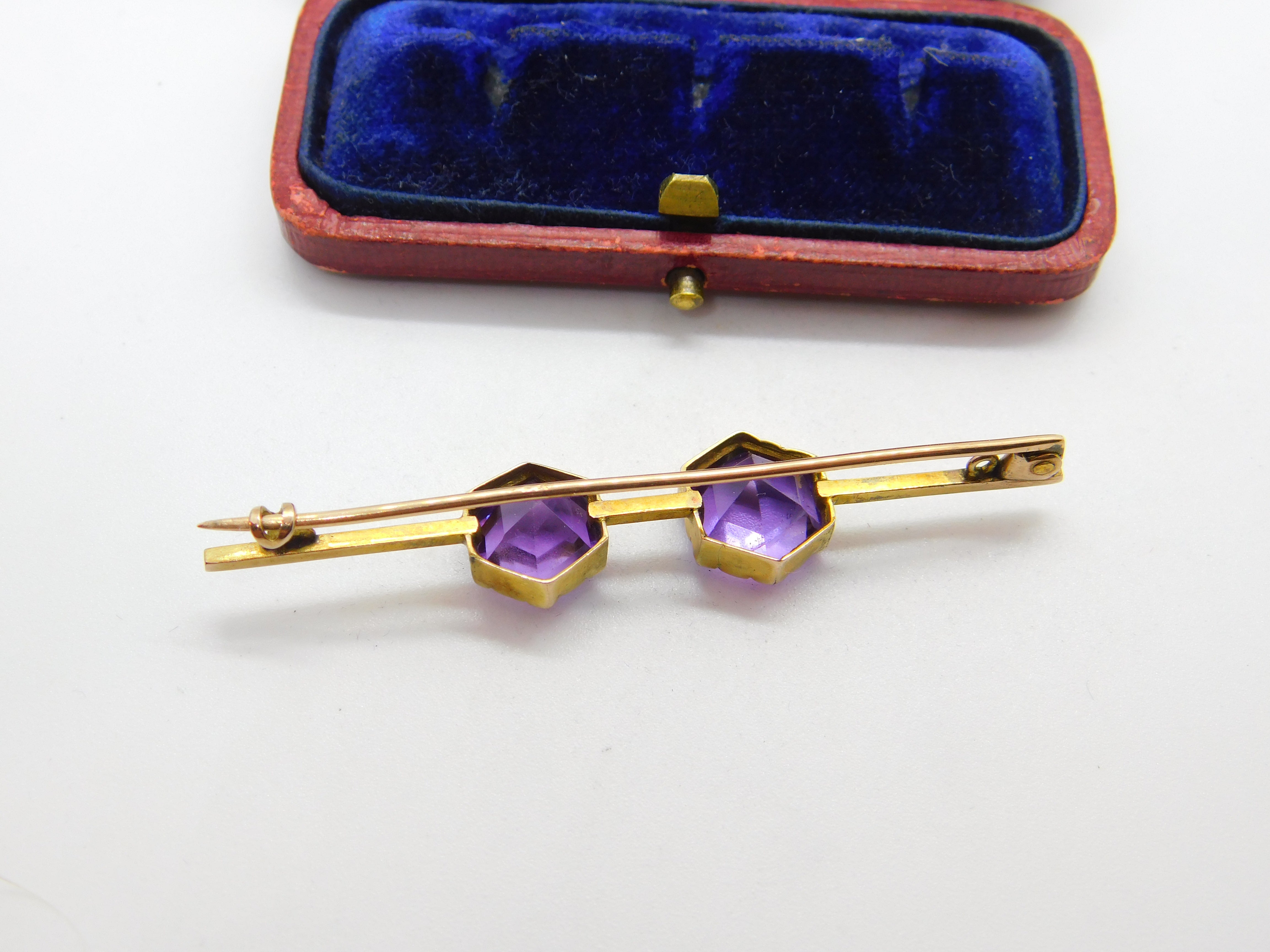 Victorian 9ct Yellow Gold & Hexagonal Cut Amethyst Bar Brooch Antique c1880
