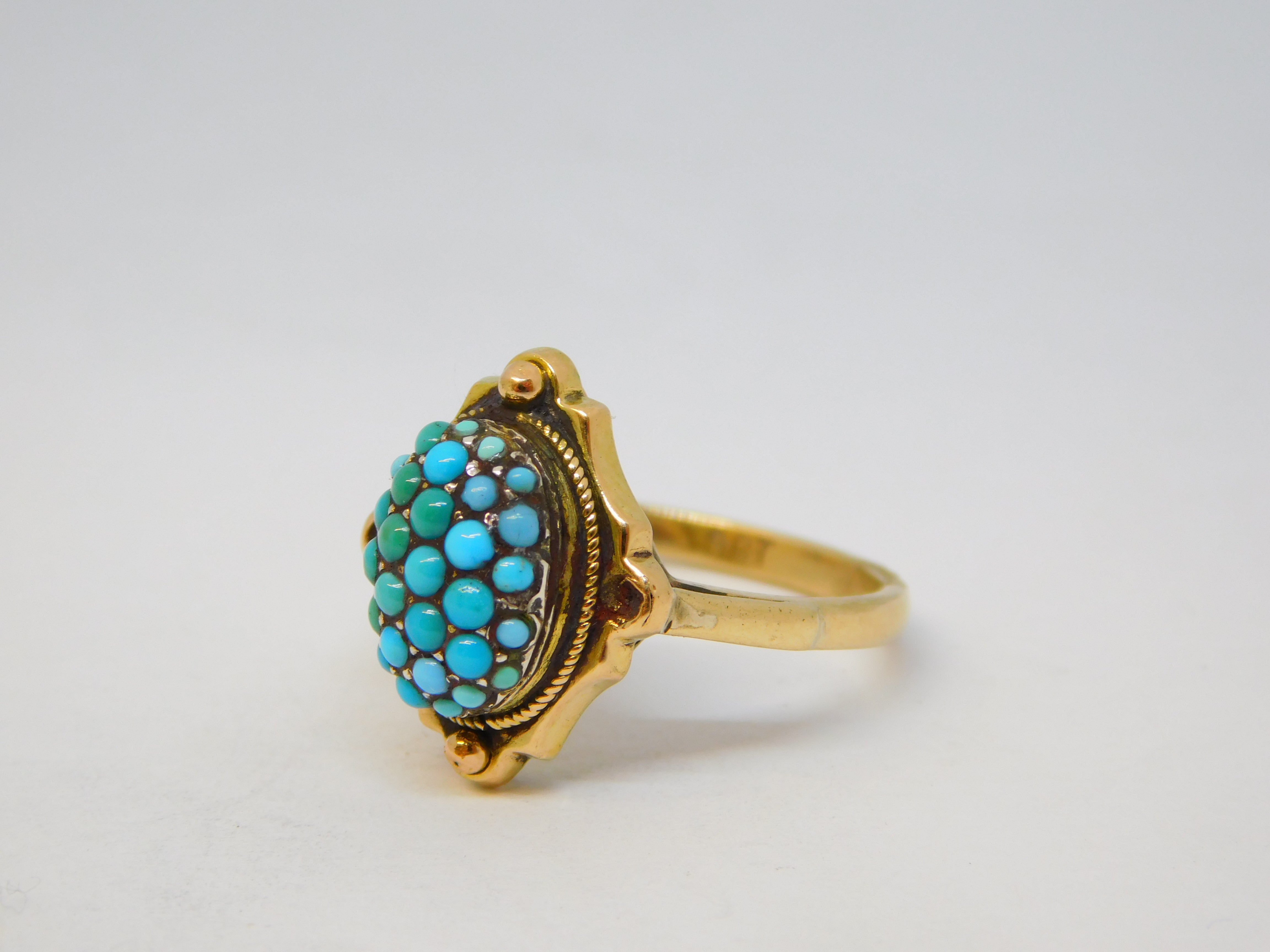 Details: A fantastic and wonderfully designed antique Victorian 9ct yellow gold dress ring with pave set turquoise throughout hallmarked to the interior band '9ct' c1890. This is a wonderful item that would make a perfect gift or addition to any collection. The BOX pictured is for PRESENTATION ONLY and is NOT included in the listings but used to frame the pictures unless specifically stated otherwise.
