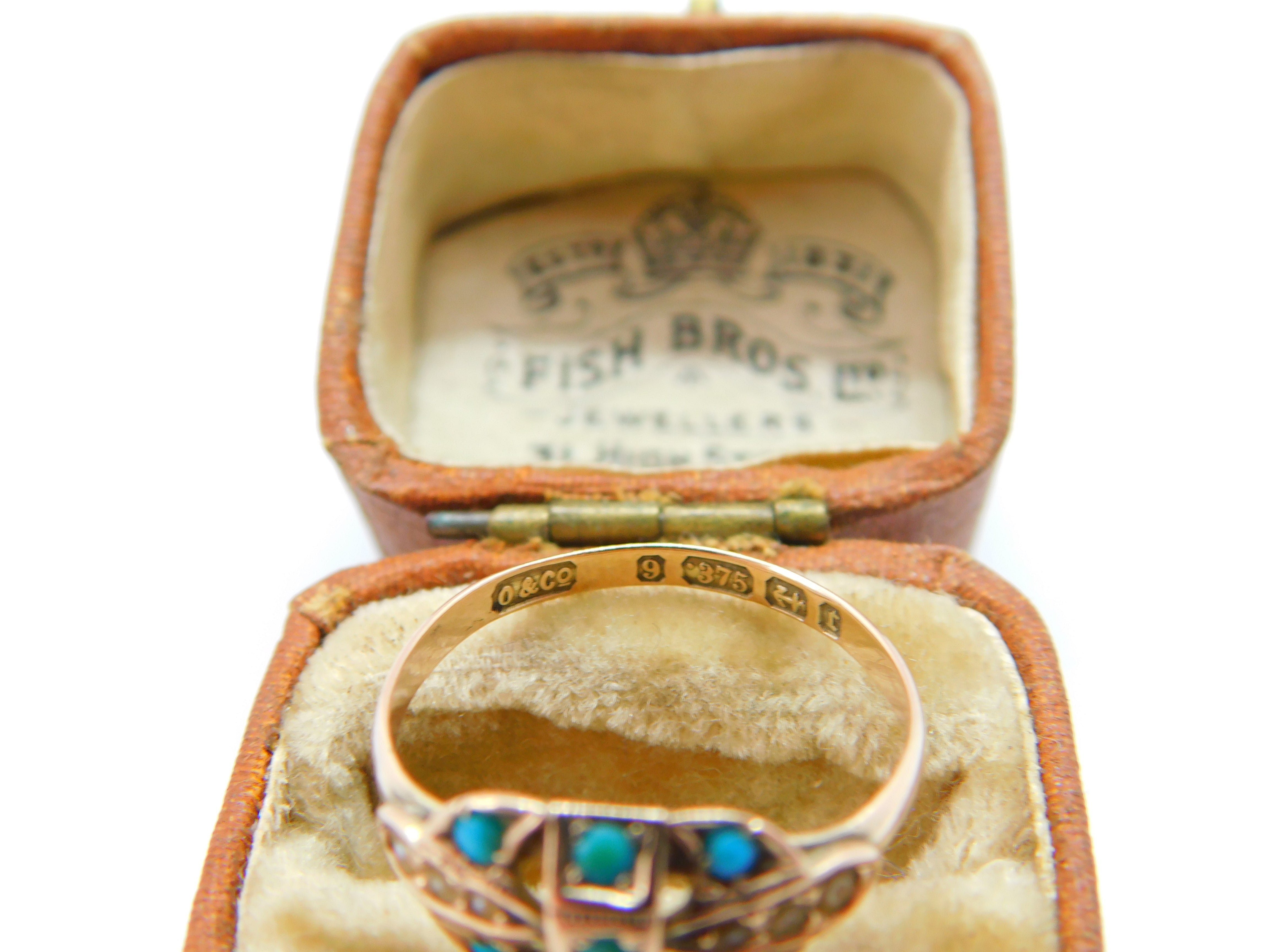 Victorian 9ct Yellow Gold, Turquoise & Seed Pearl Dress Ring 1877 Birmingham