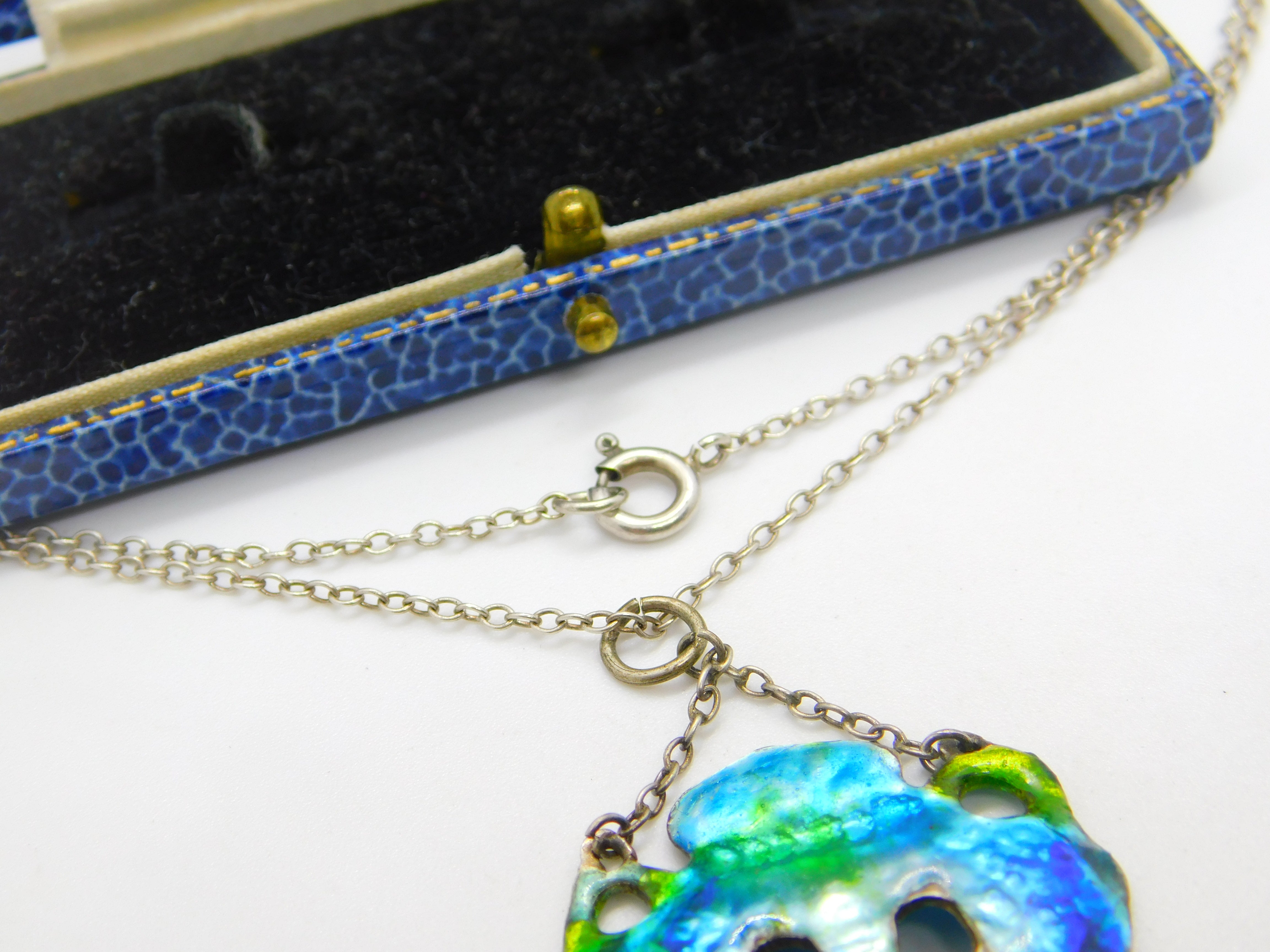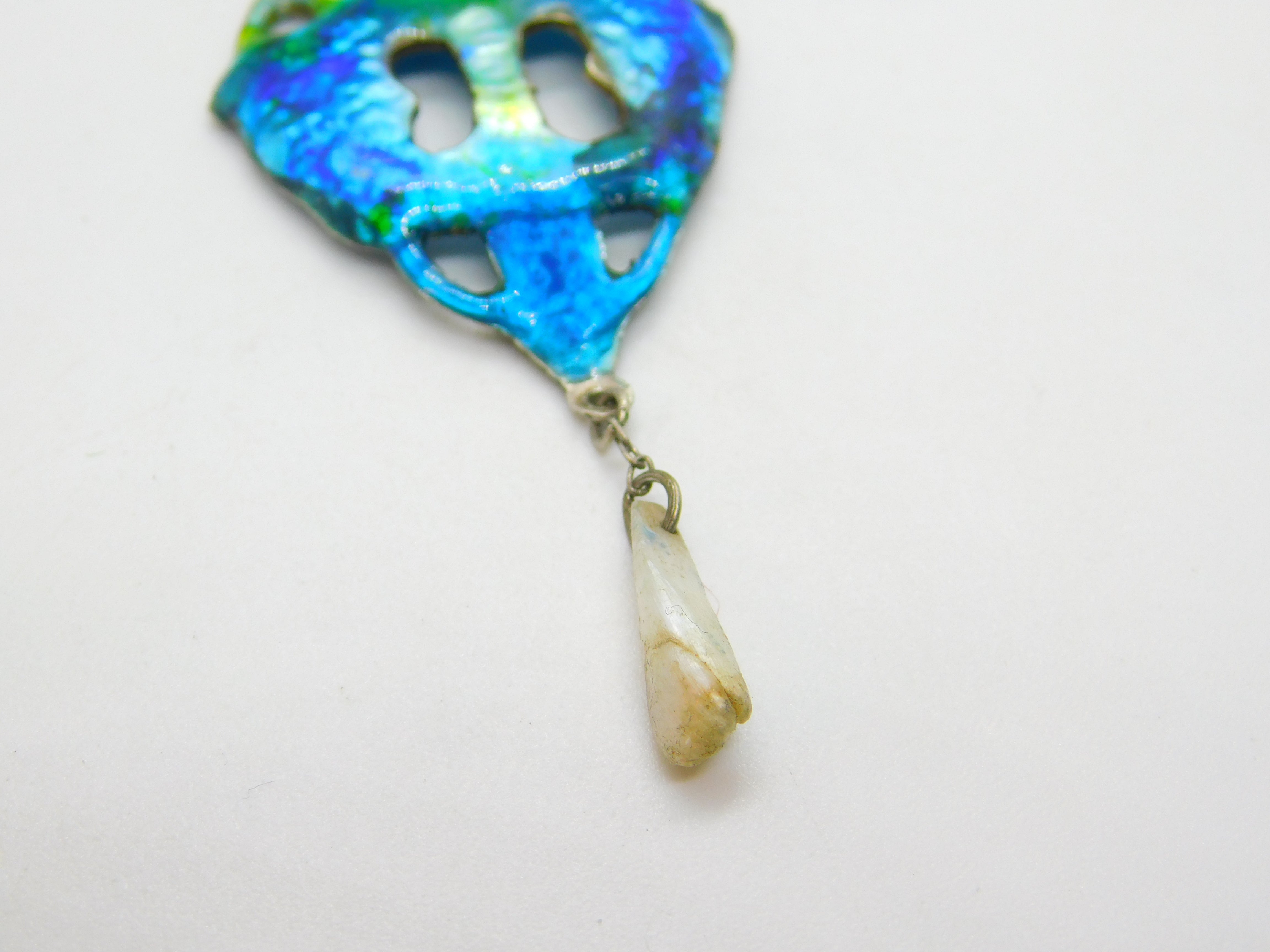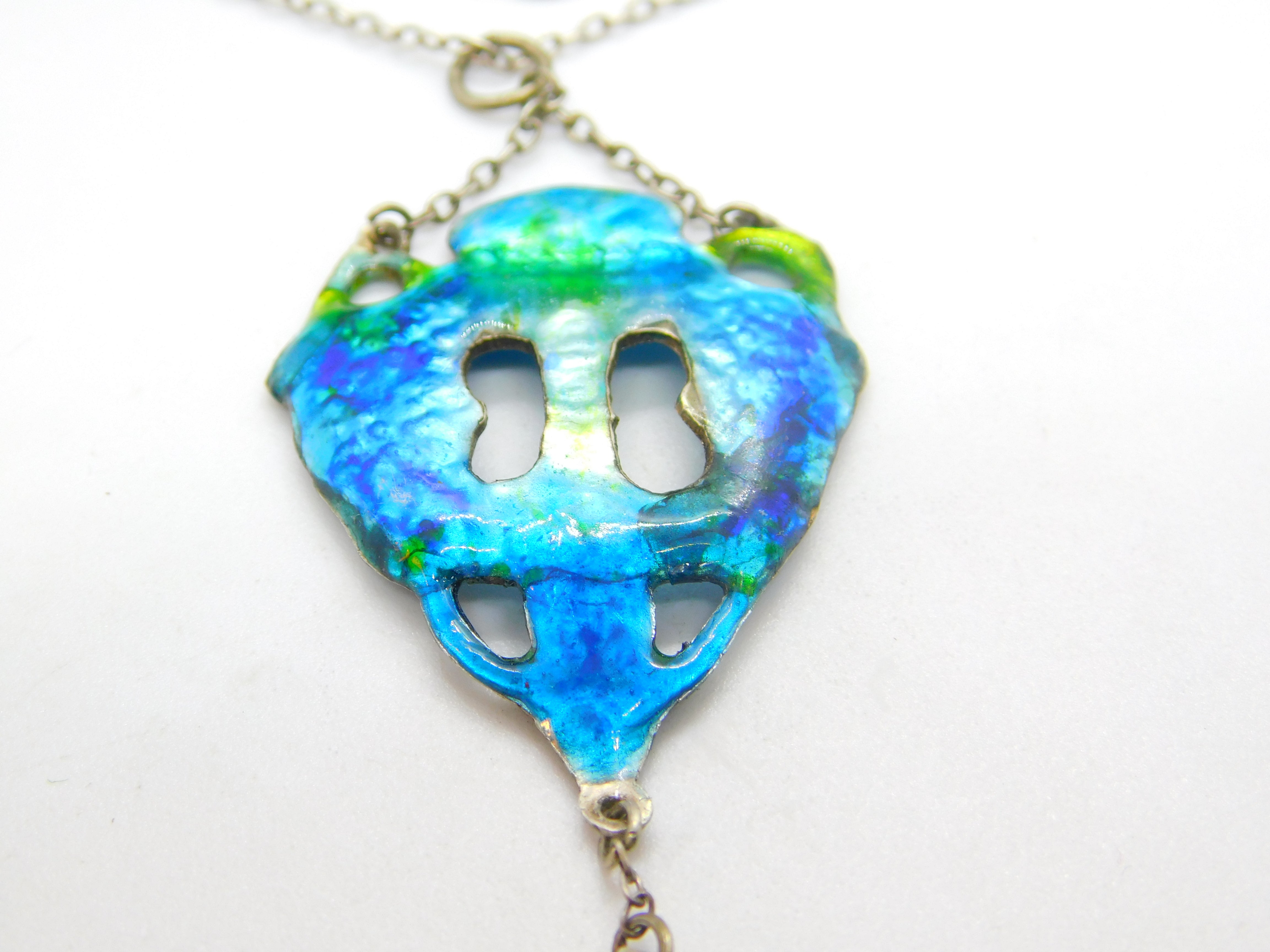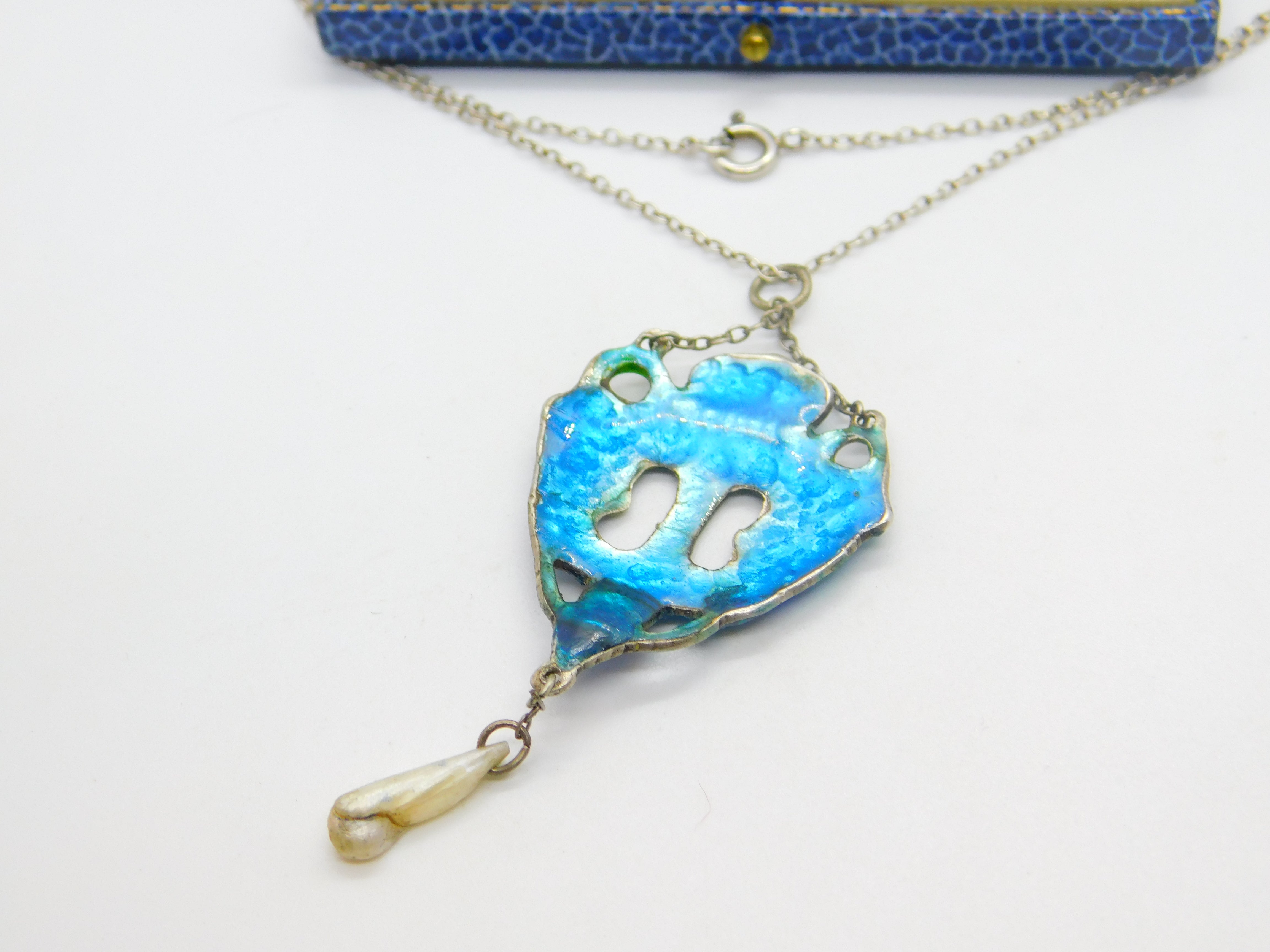 Victorian Art Nouveau Sterling Silver & Blue-Green Enamel Pearl Drop Pendant c1890