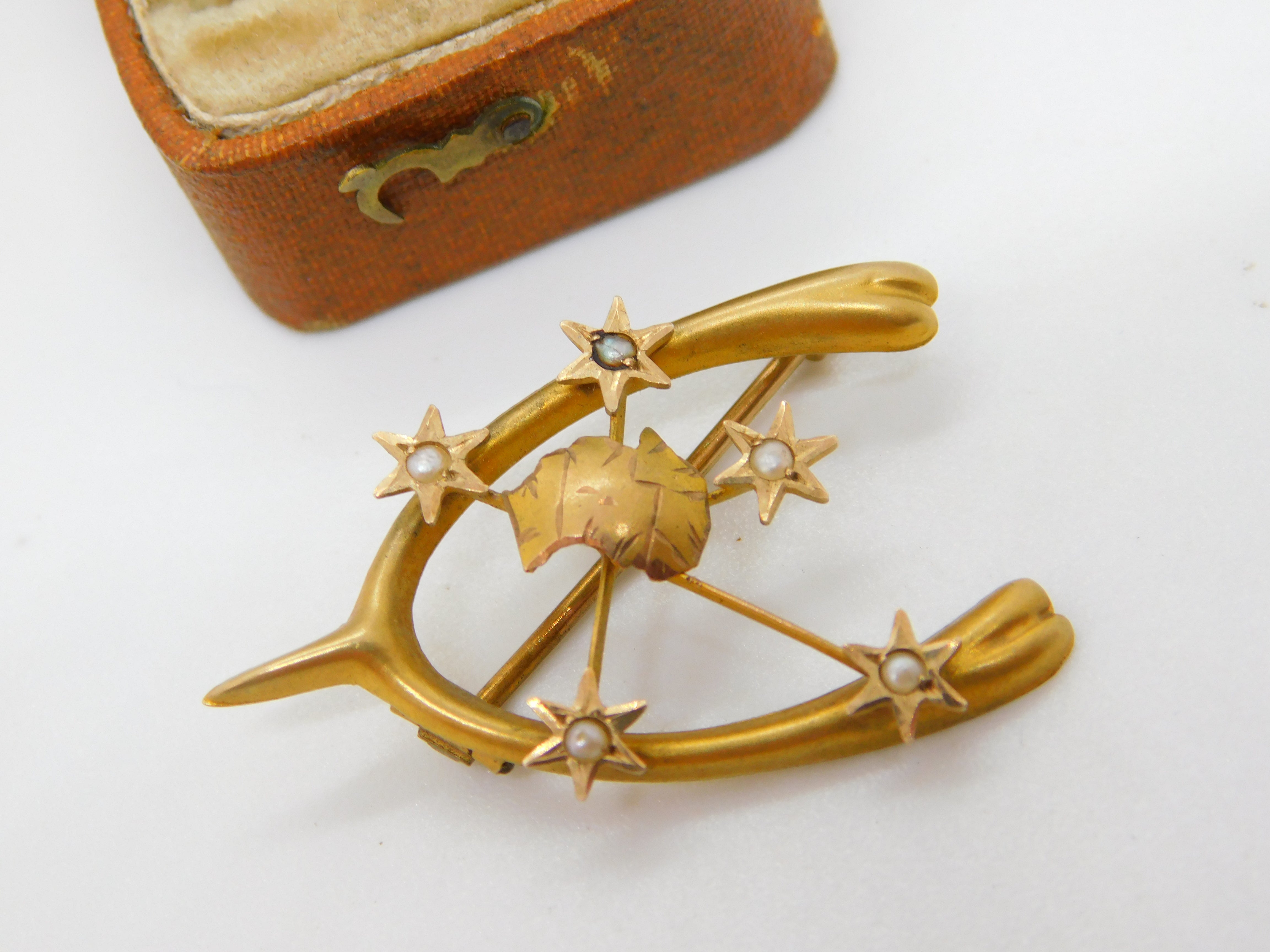 Details: A fantastic and wonderfully designed antique Victorian Australian 9ct yellow gold wishbone good luck brooch depicting an australian southern cross set throughout with seed pearls hallmarked to the reverse c1880 by Willis & Sons of Melbourne with unusual Australian assay marks. This is a wonderful item that would make a perfect gift or addition to any collection. The BOX pictured is for PRESENTATION ONLY and is NOT included in the listings but used to frame the pictures unless specifically stated otherwise.