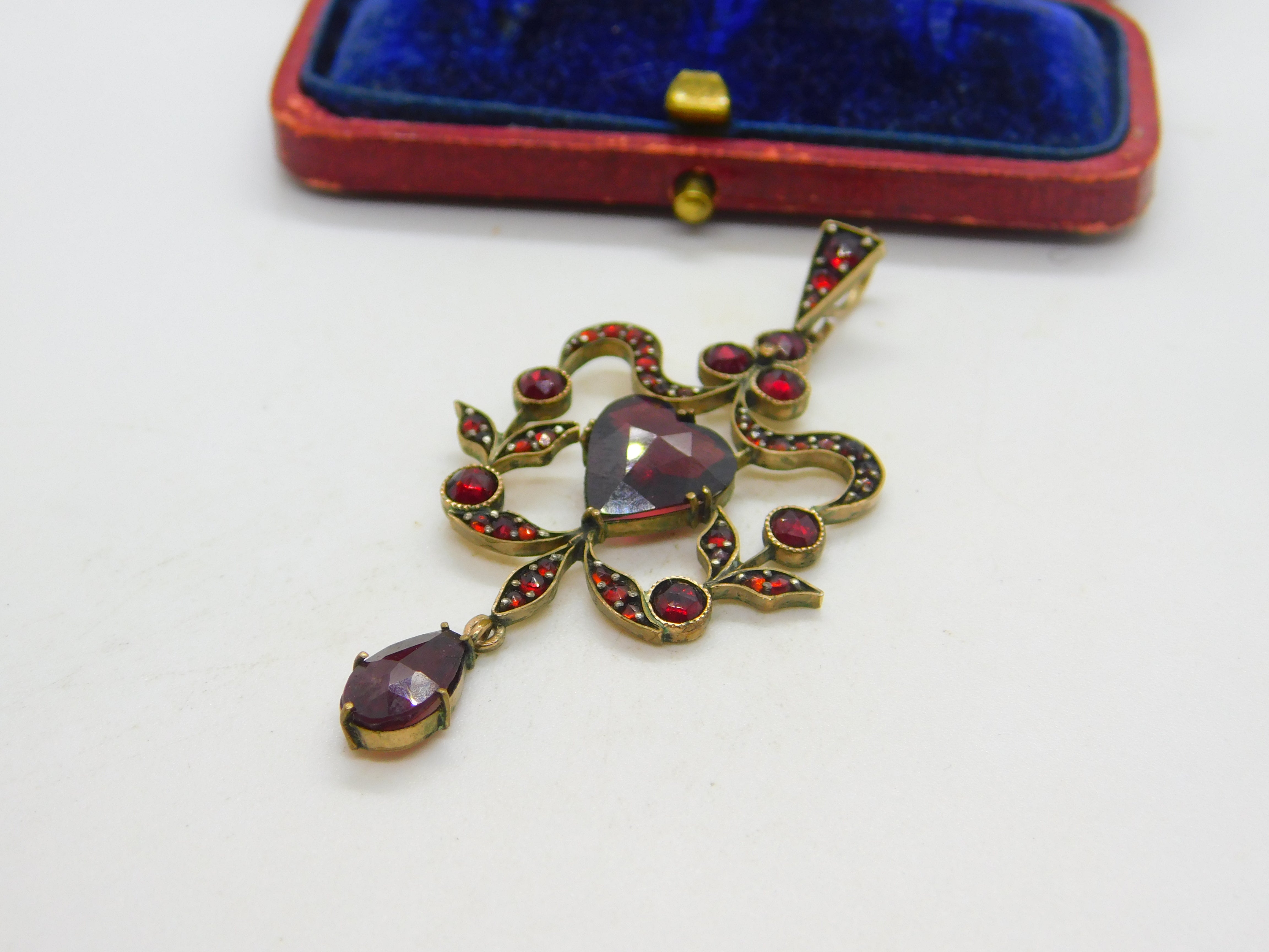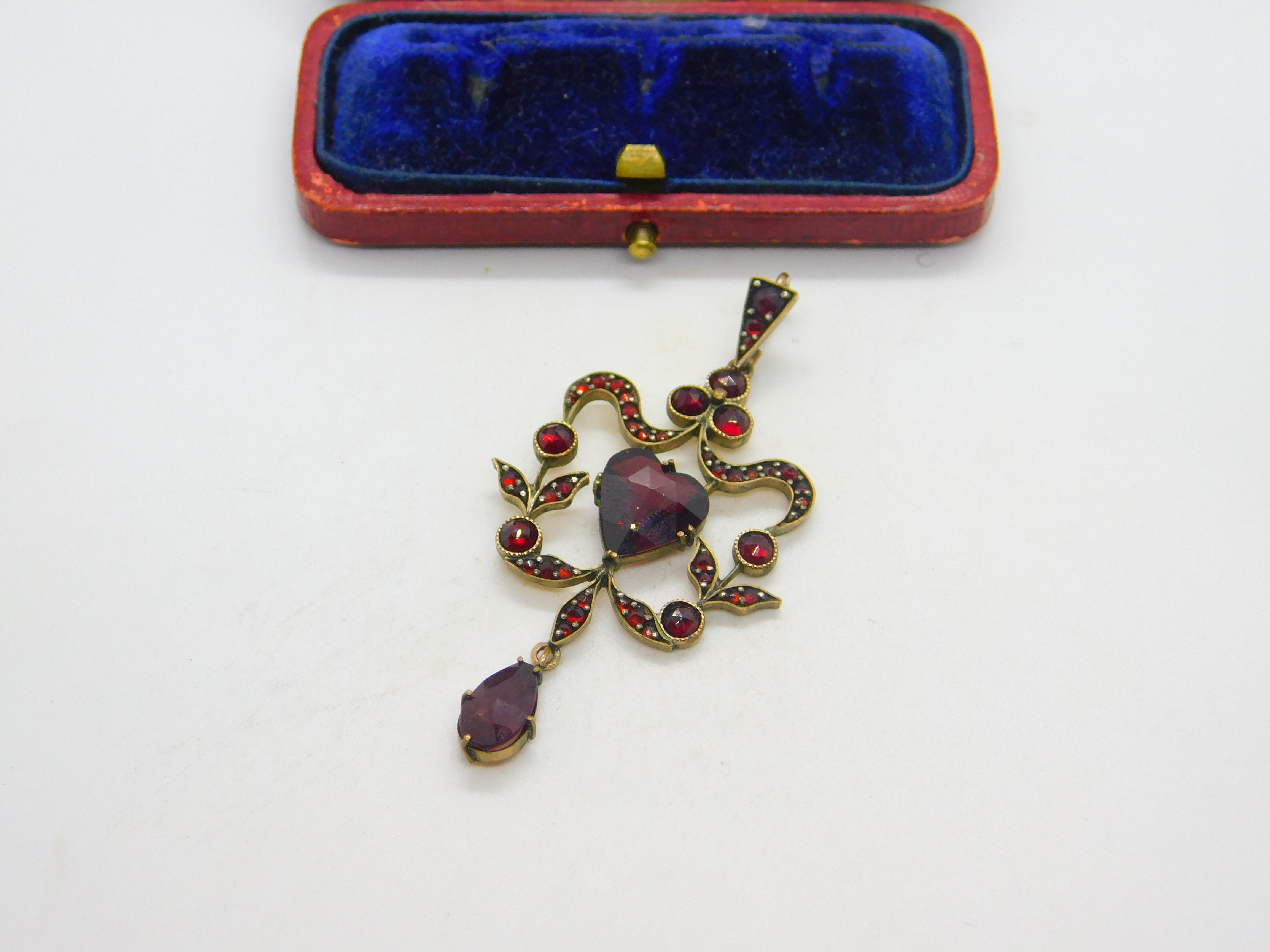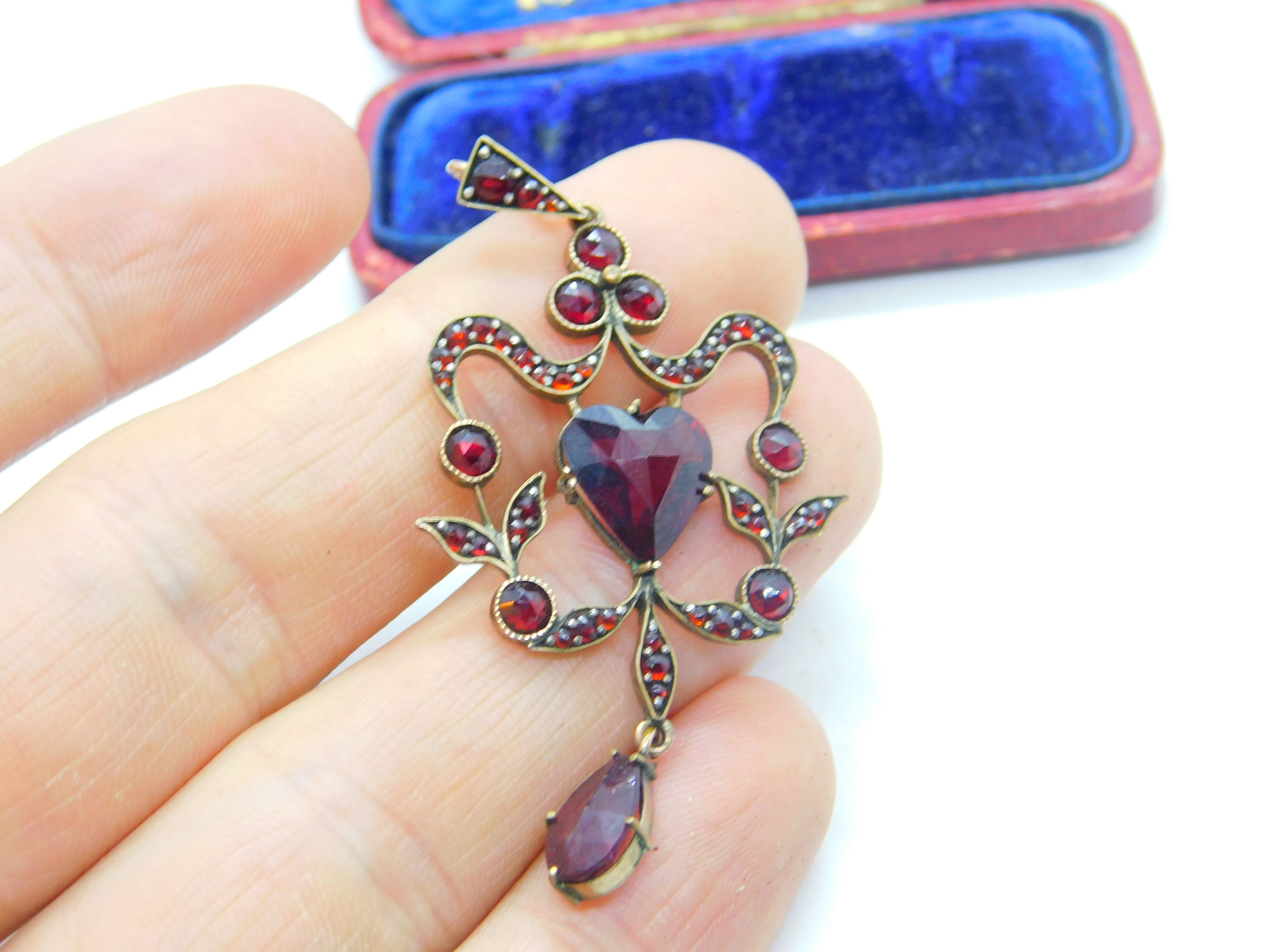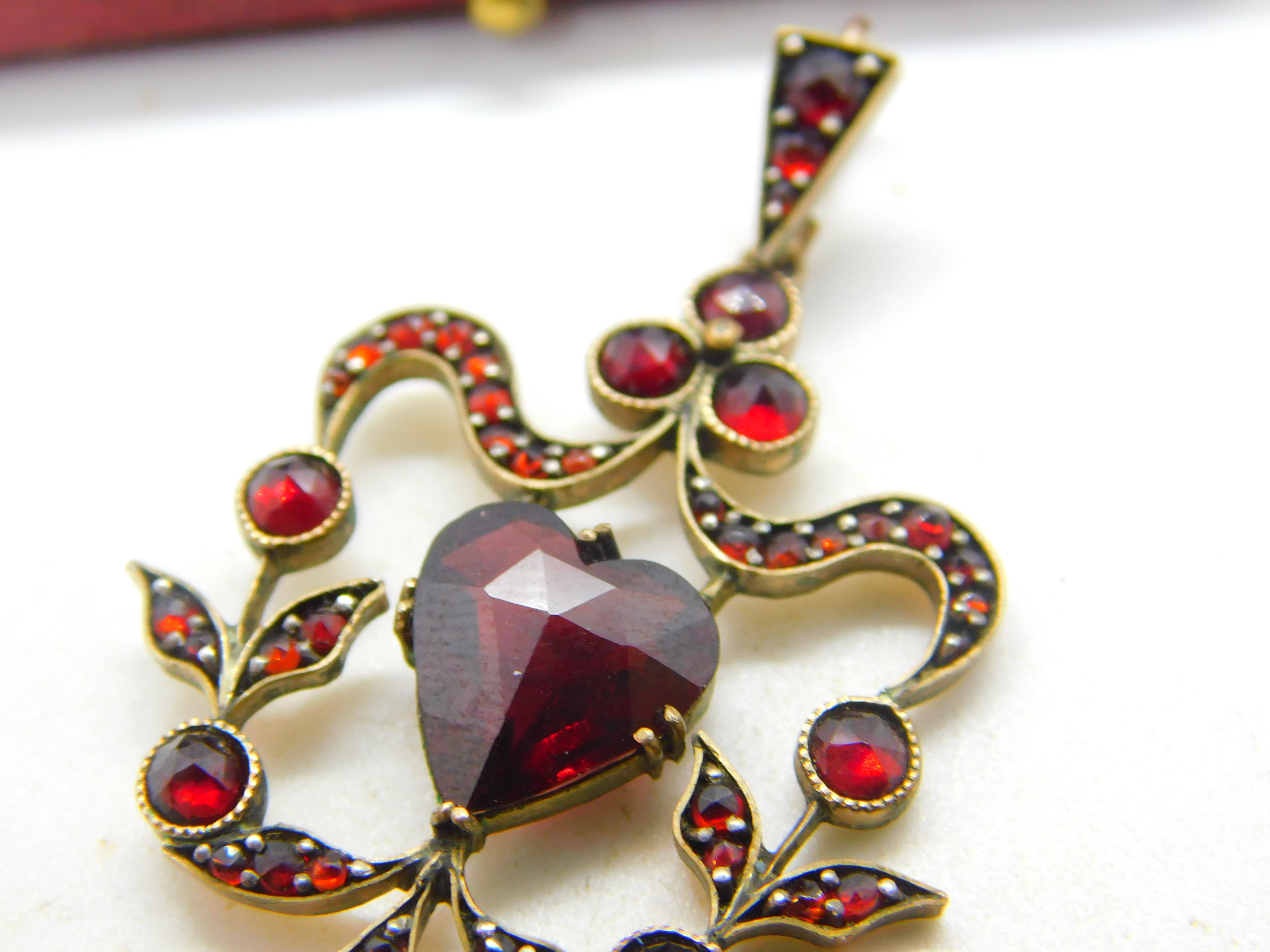 Victorian Austrian 9ct Gold & Bohemian Garnet Floral Heart Drop Lavalier Pendant