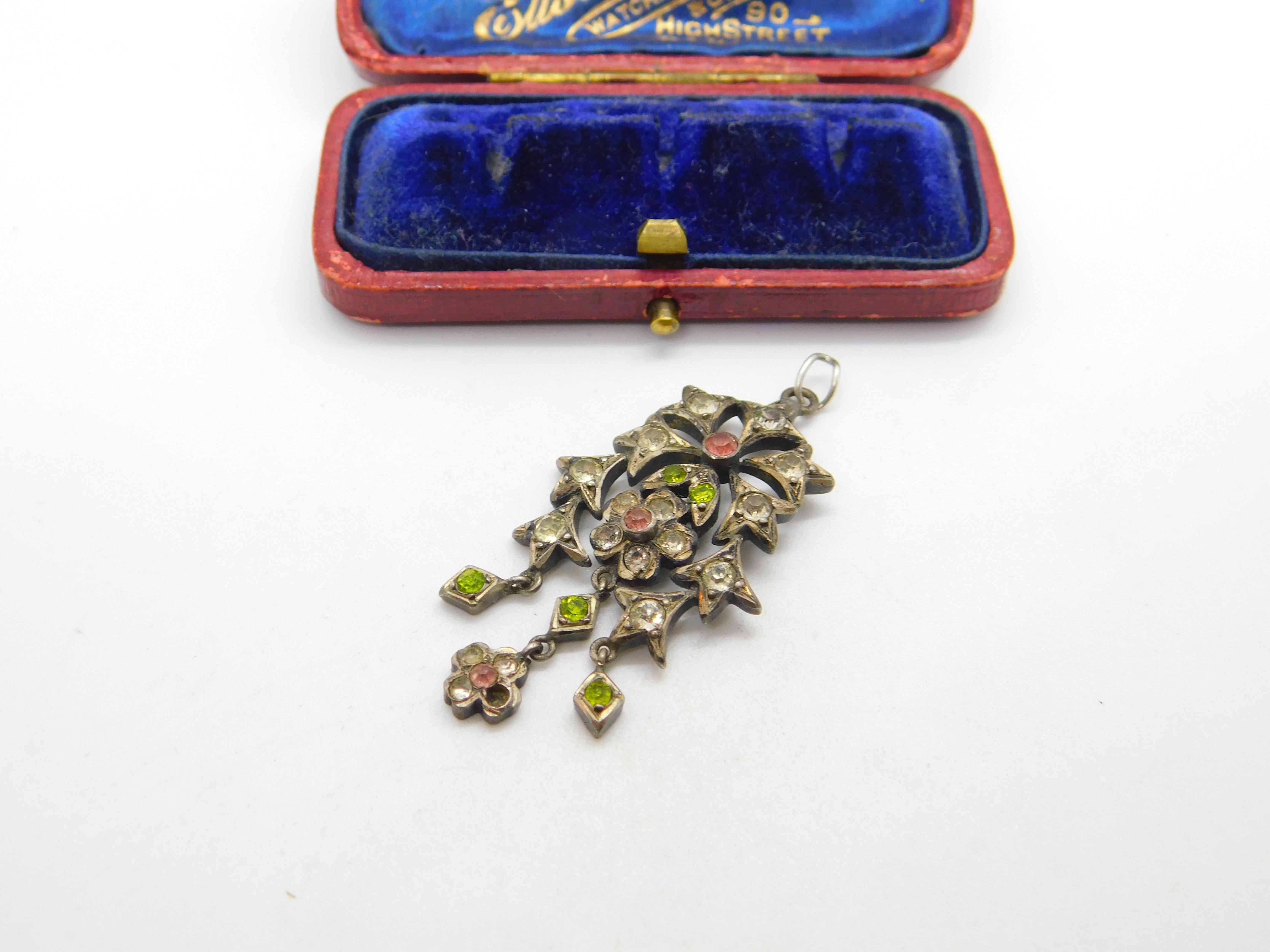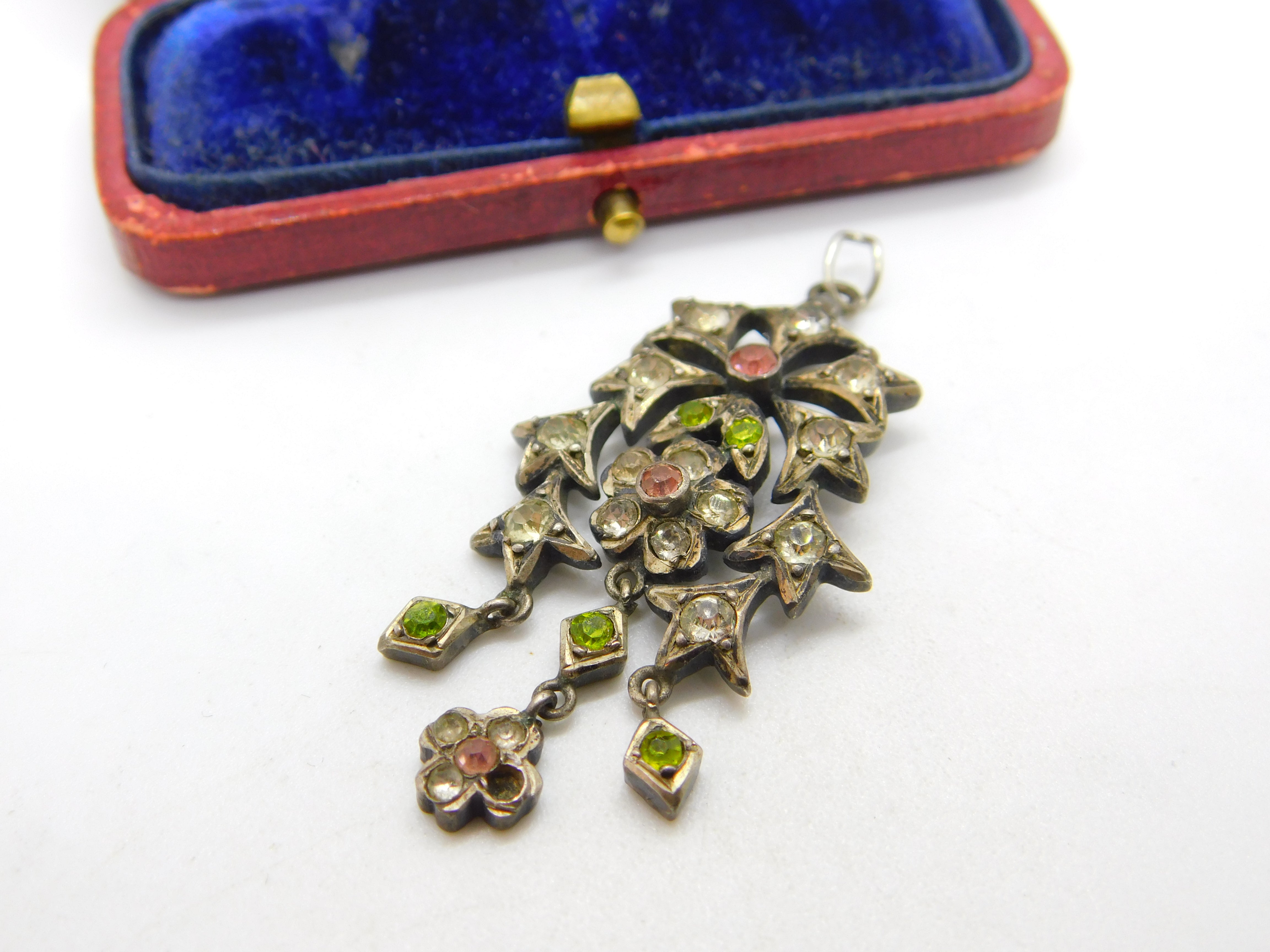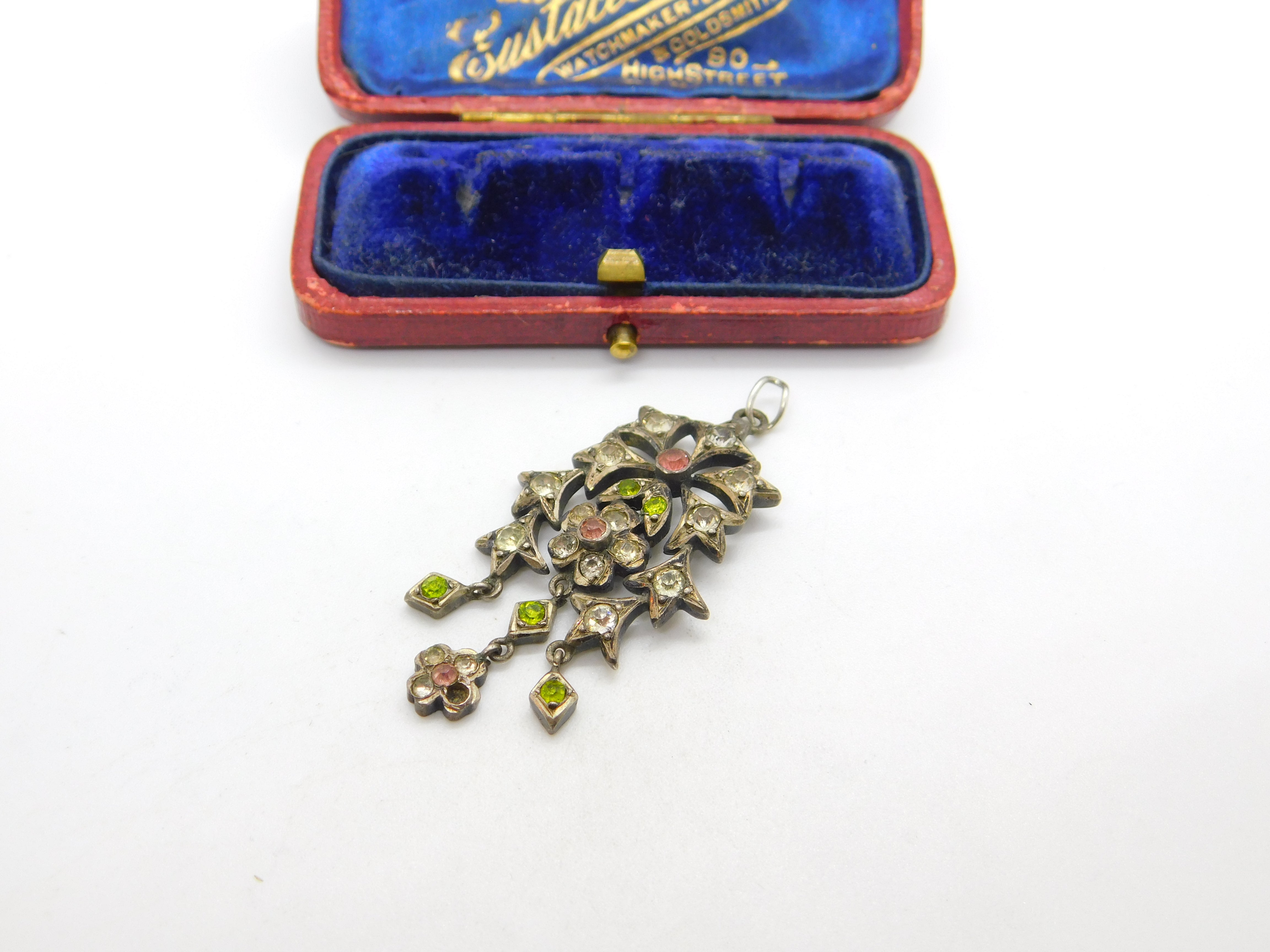 Victorian Austrian Sterling Silver & Colourful Paste Set Floral Drop Pendant