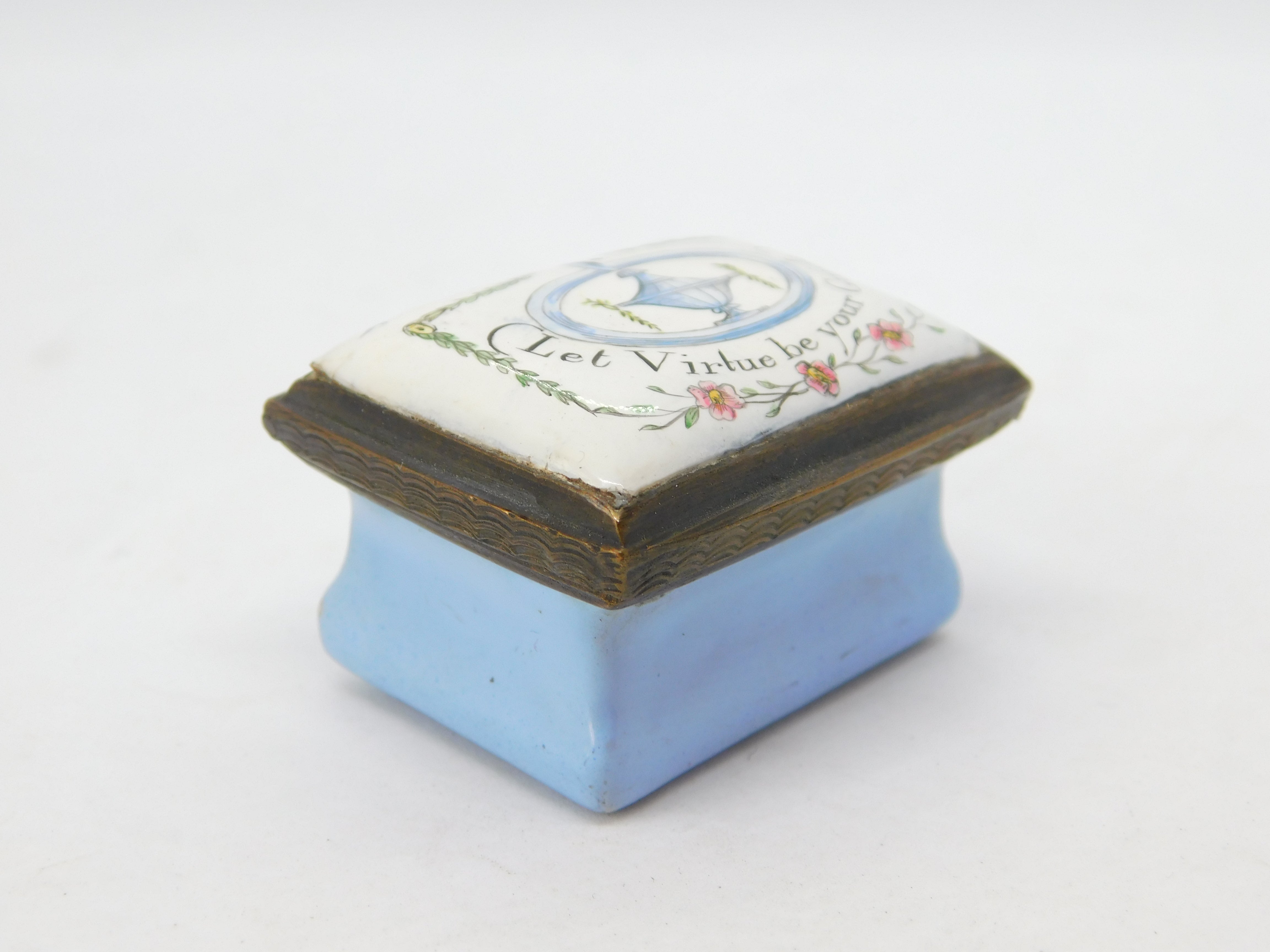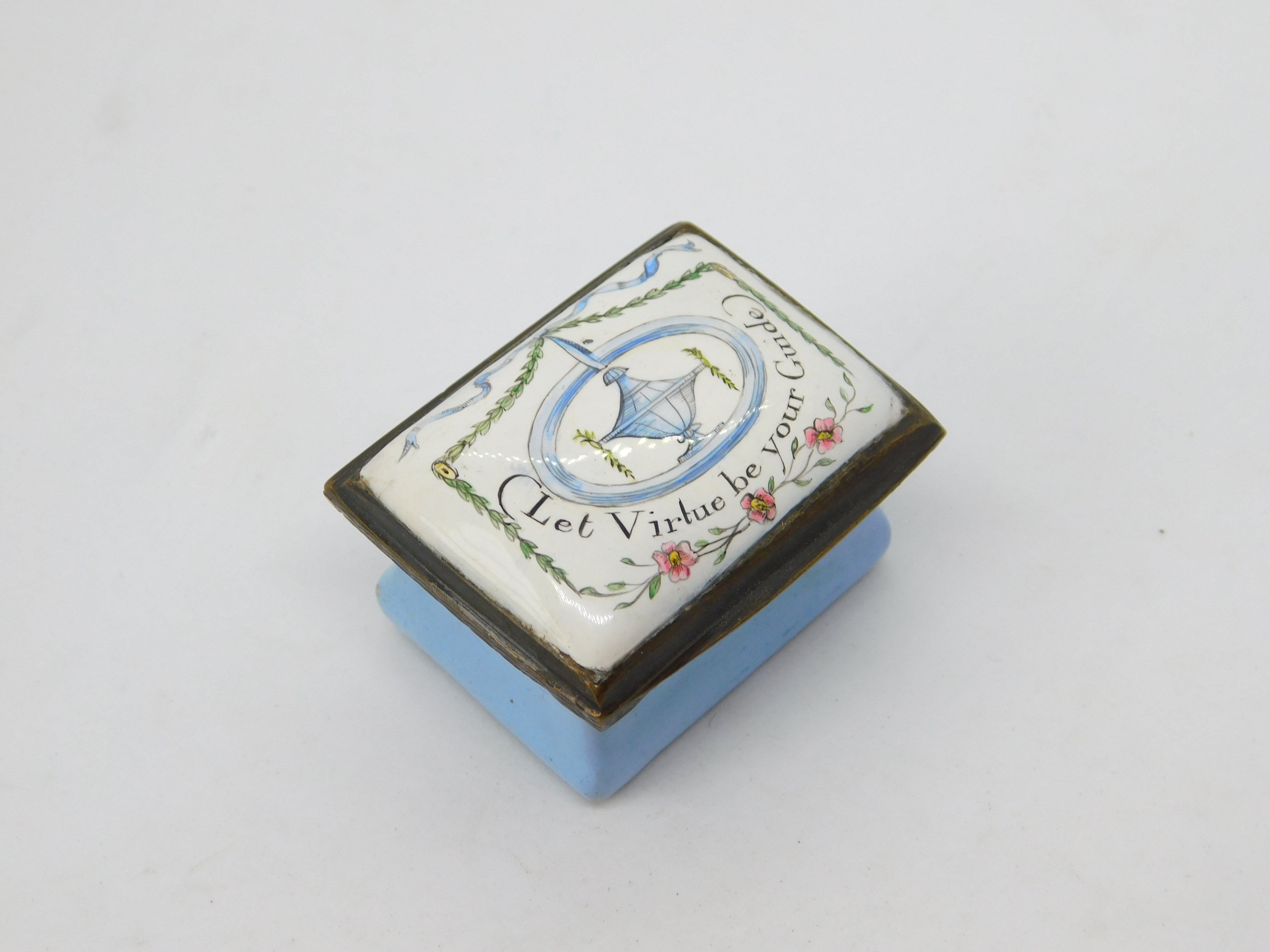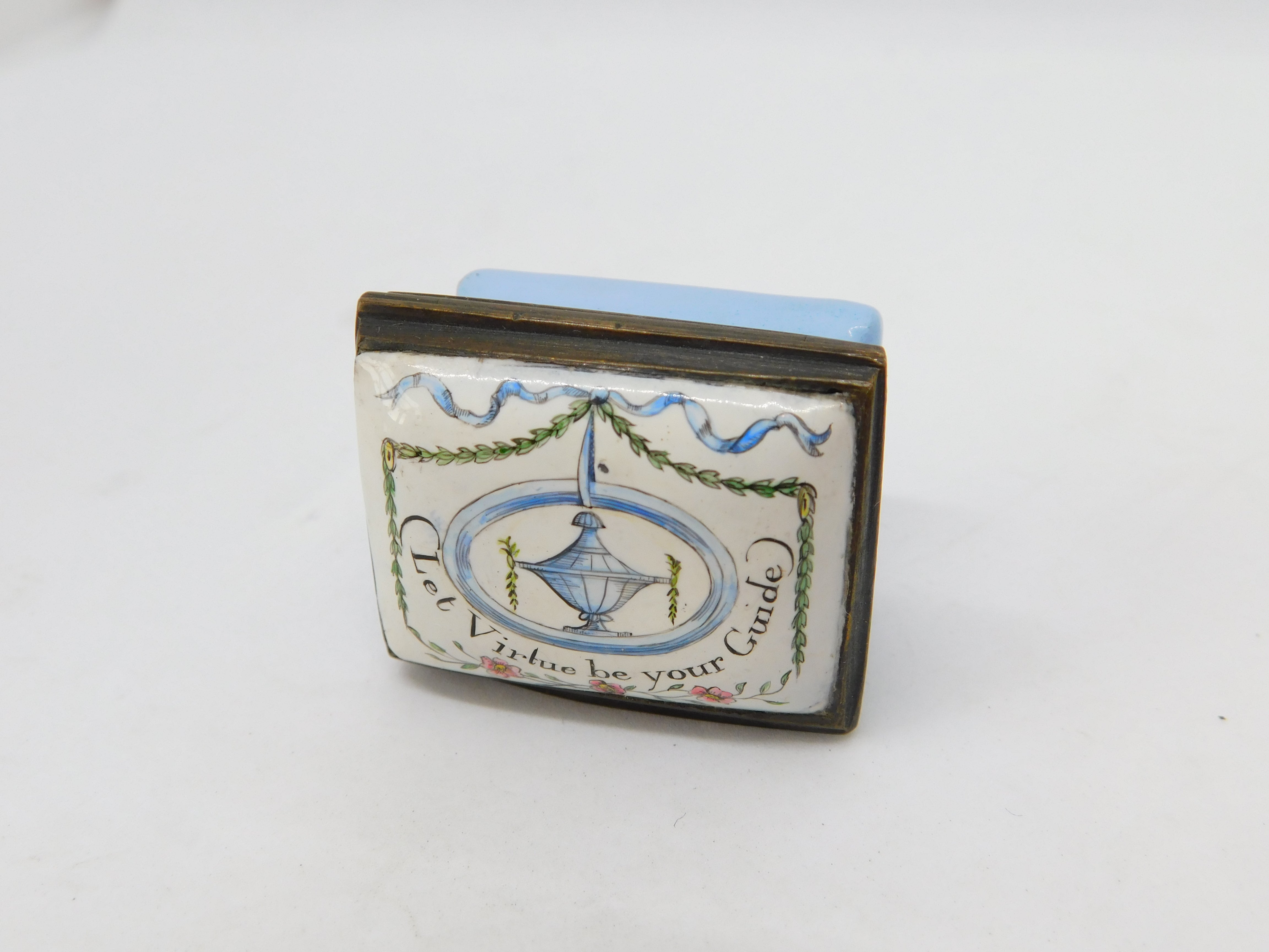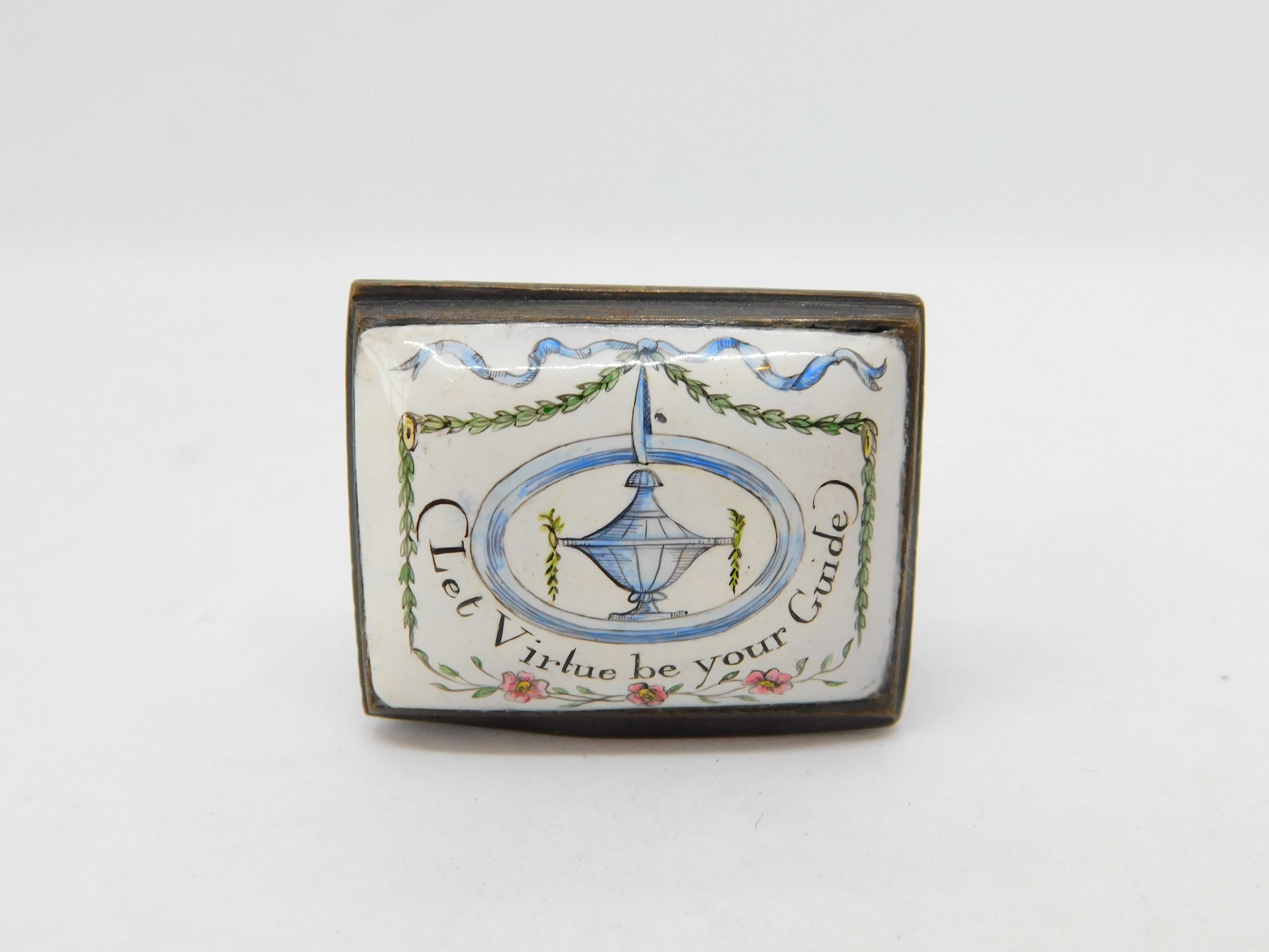 Victorian Bilston Enamel Patch Box 'Let Virtue be your Guide' Antique c1900